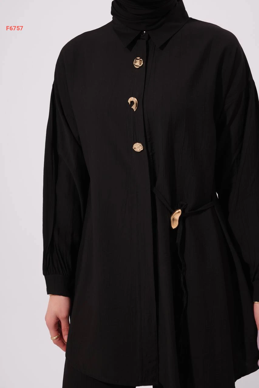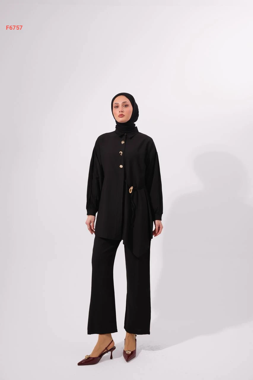 طقم بنطال وقميص مع ربطة جانبية