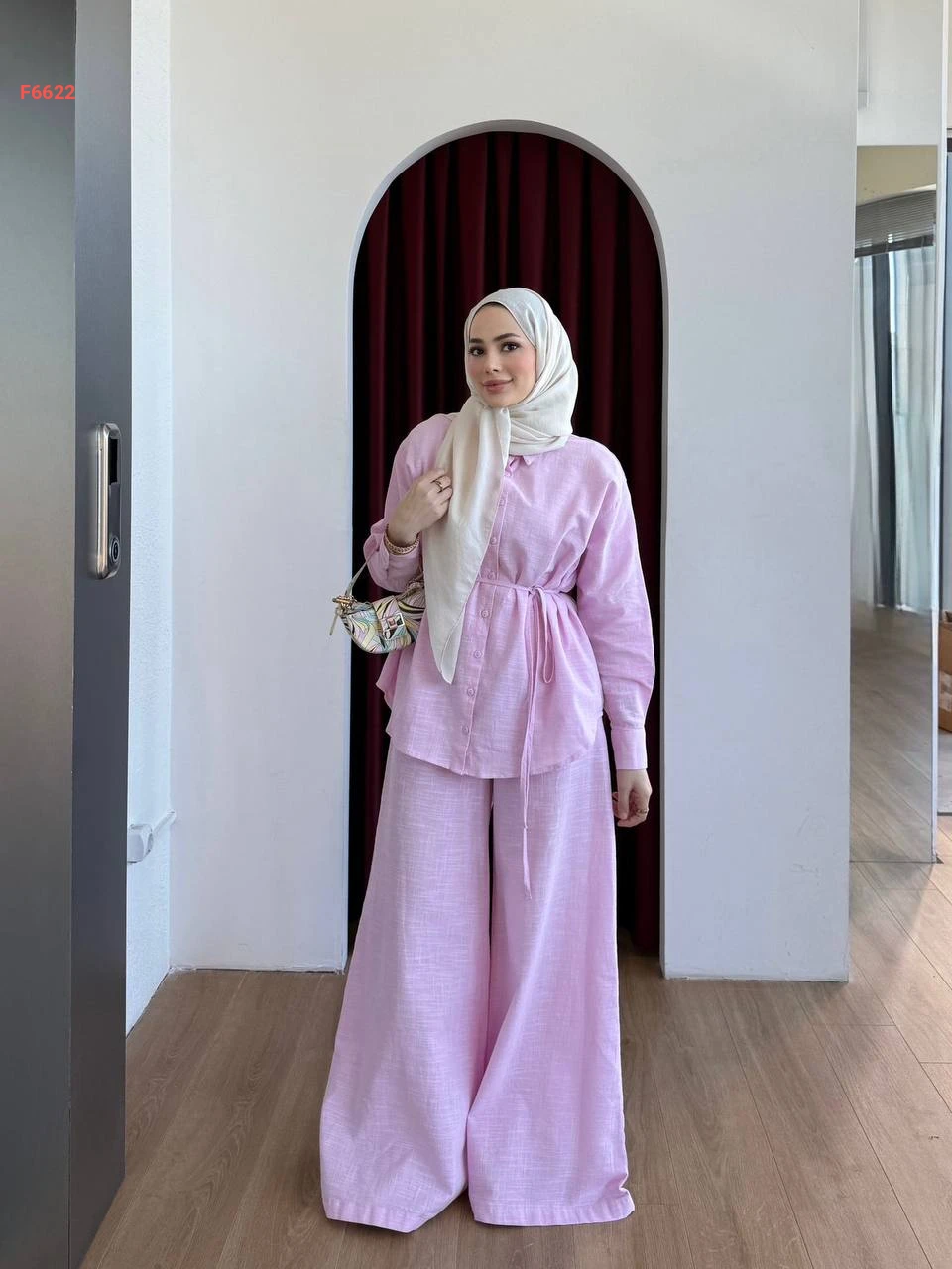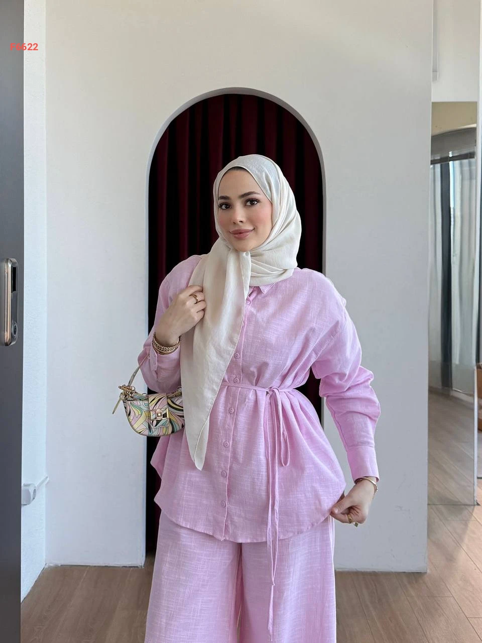 طقم بنطال وقميص بزنار رفيع