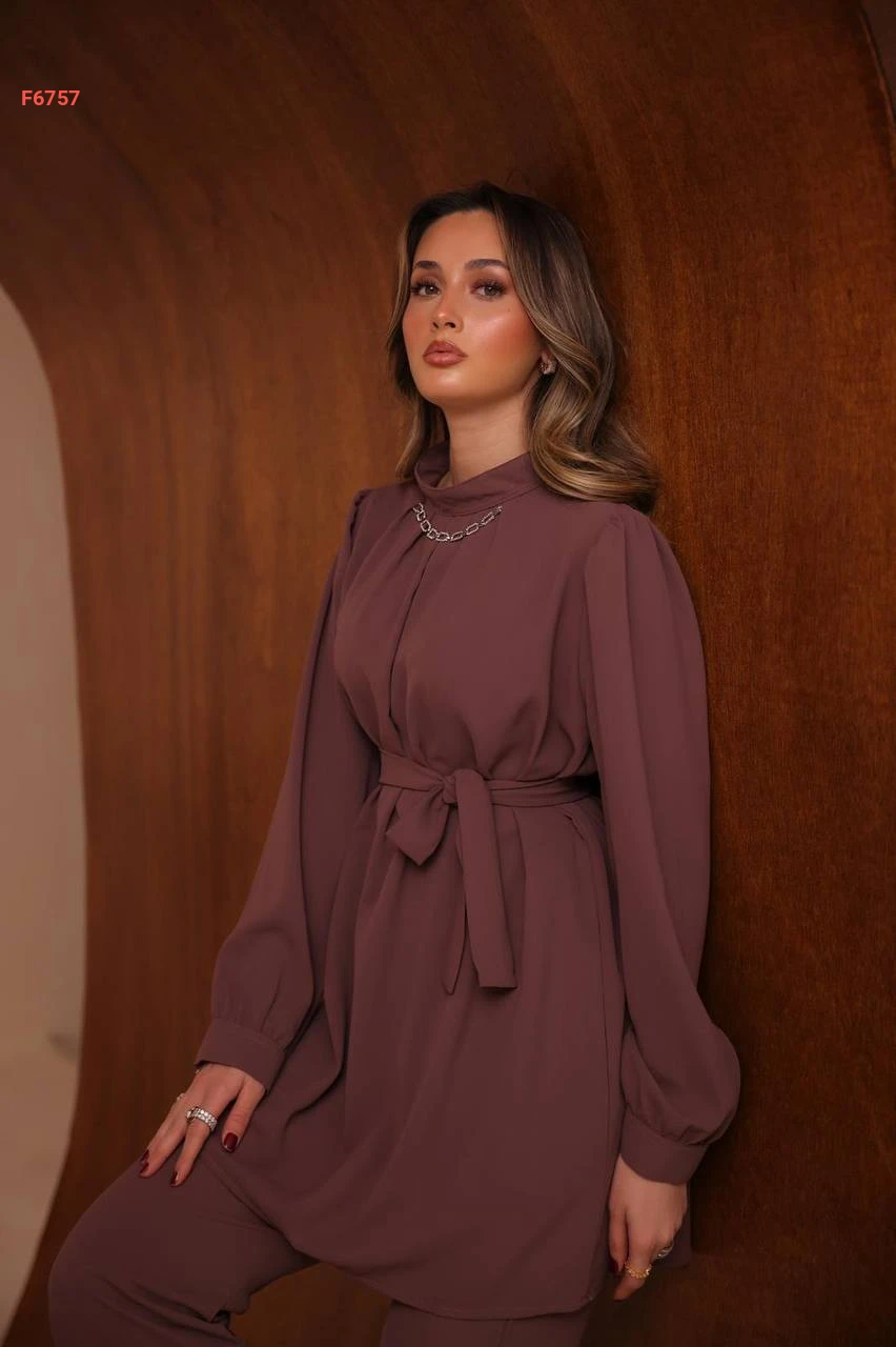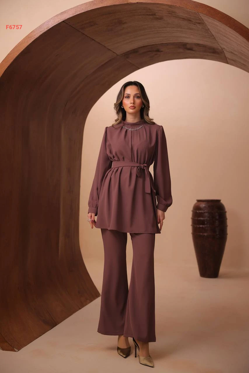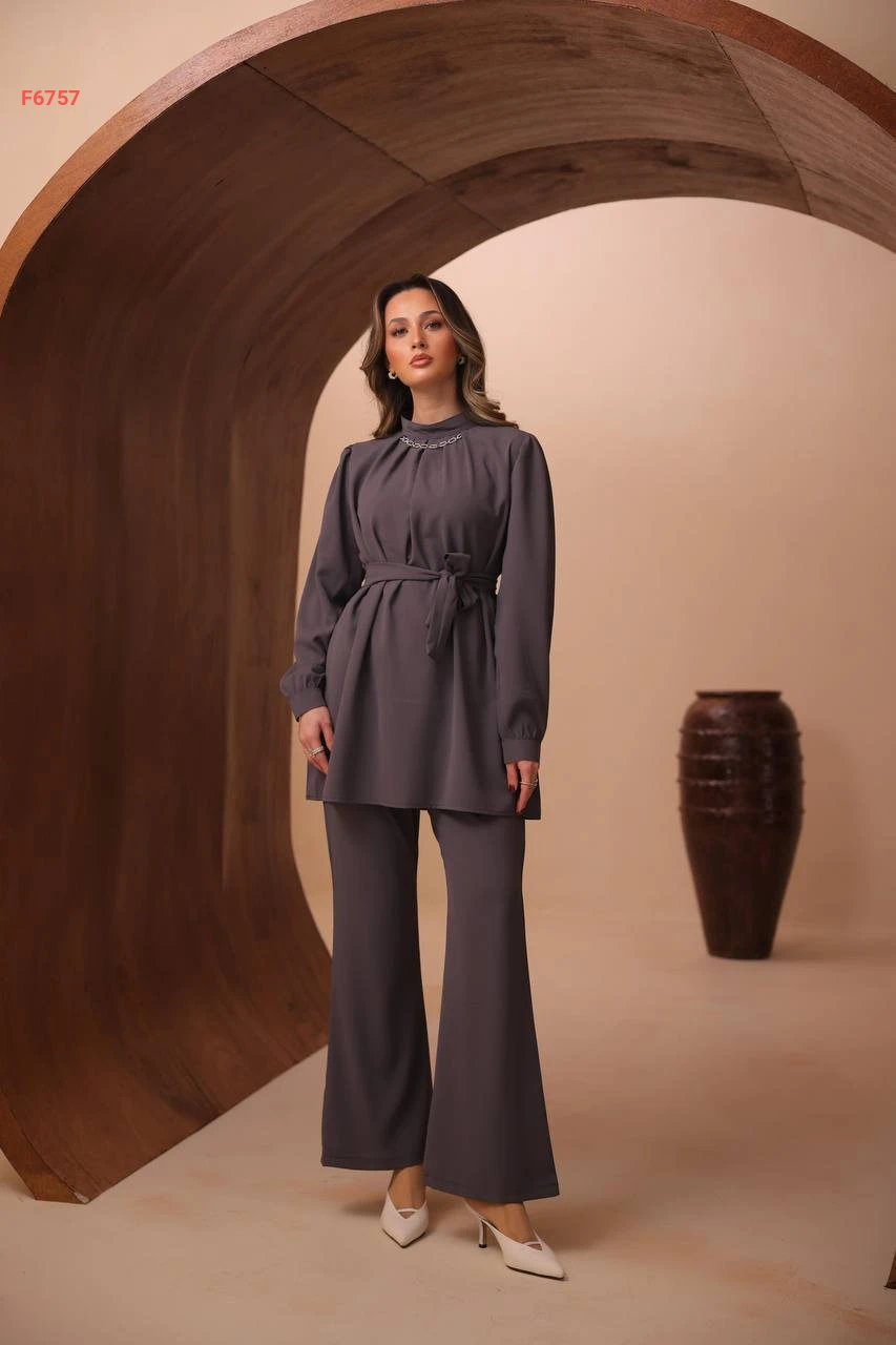 طقم بنطال وتونيك بزنار وسلسلة عالقبة