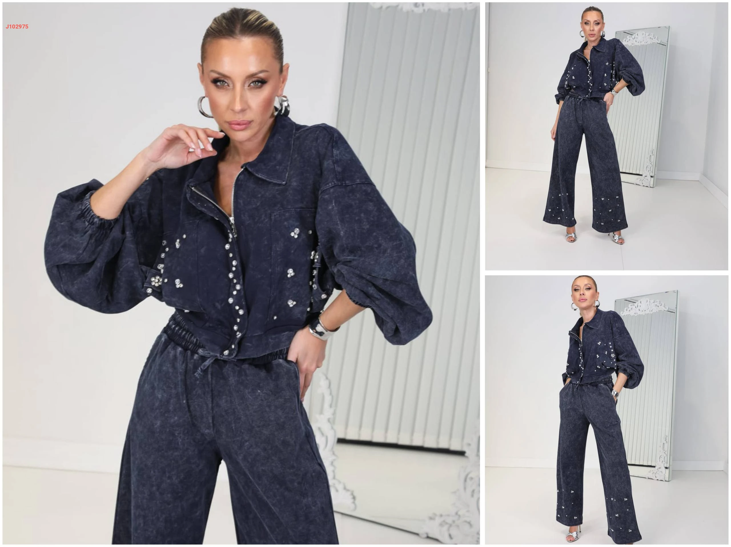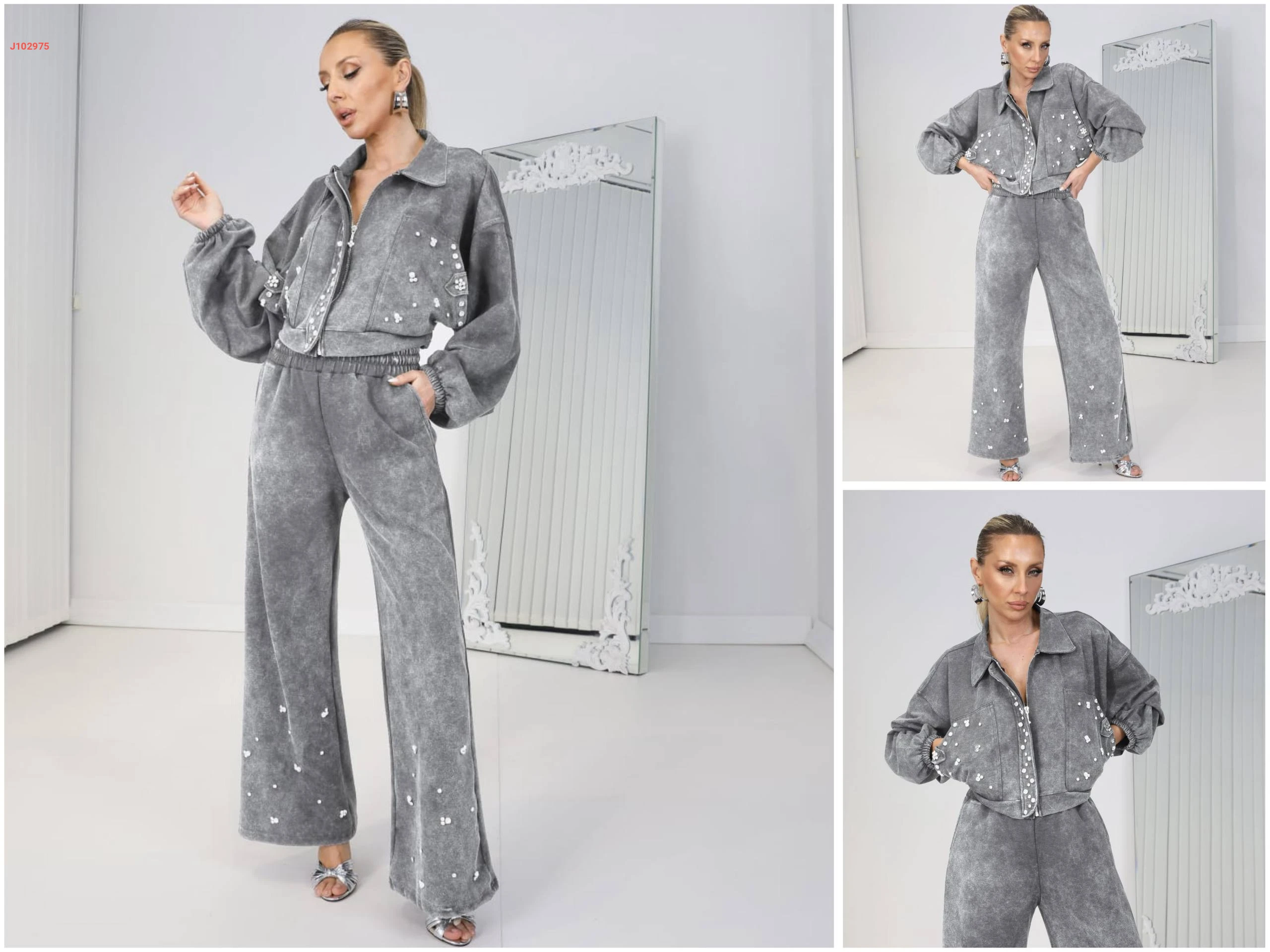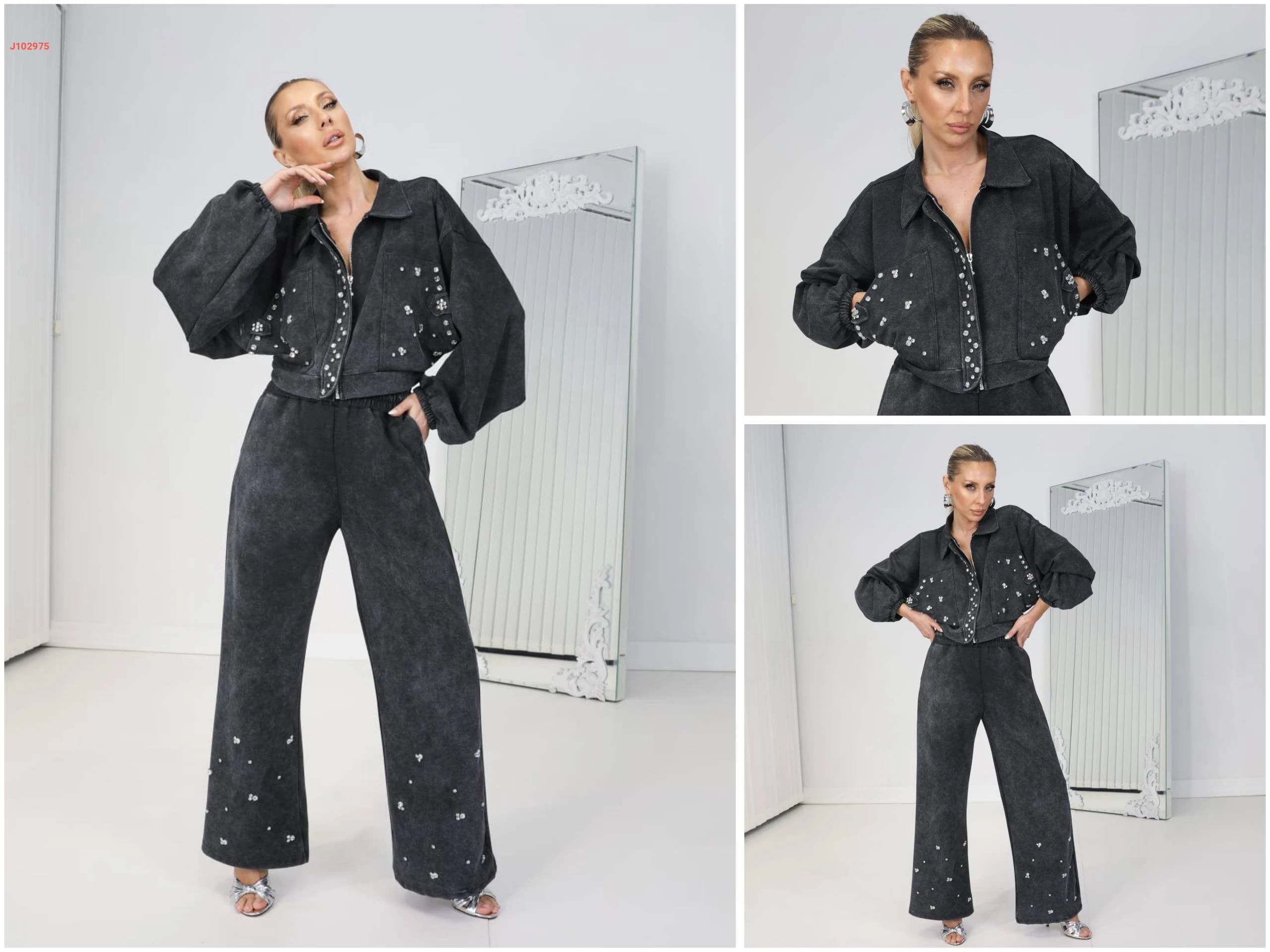 طقم بنطال بخصر مطاطي مع جاكيت بسحاب مخفي مزينة بالكريستال