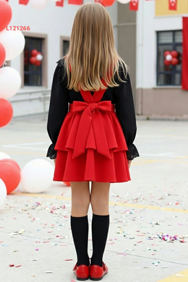 فساتين هيلين للأطفال باللون الأحمر مع دانتيل أسود - طقم مميز ليوم 29 أكتوبر و23 أبريل ورأس السنة
