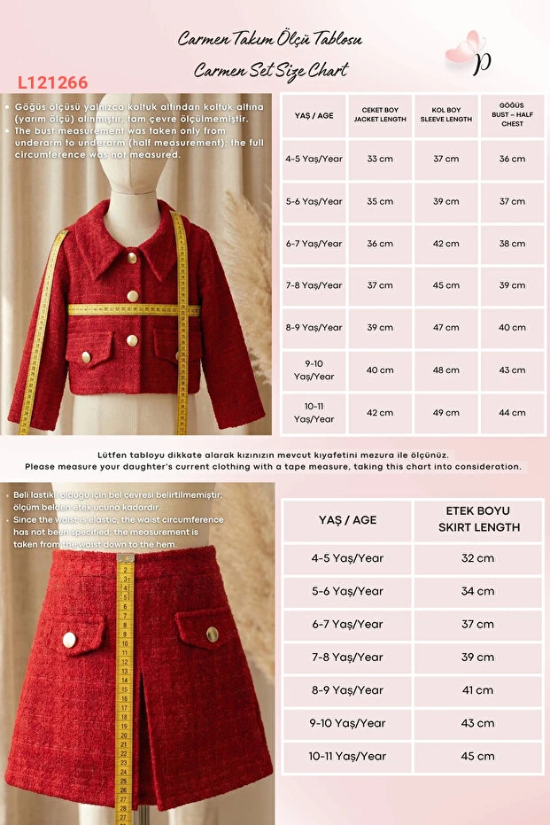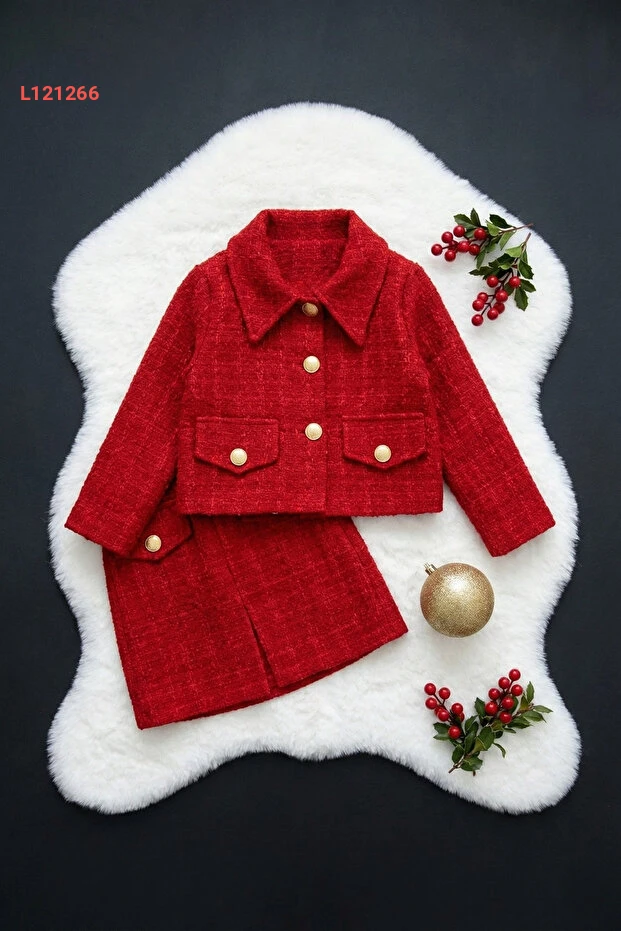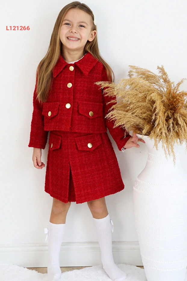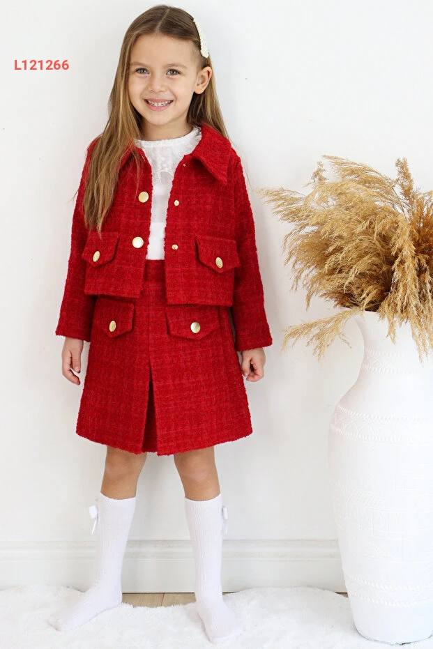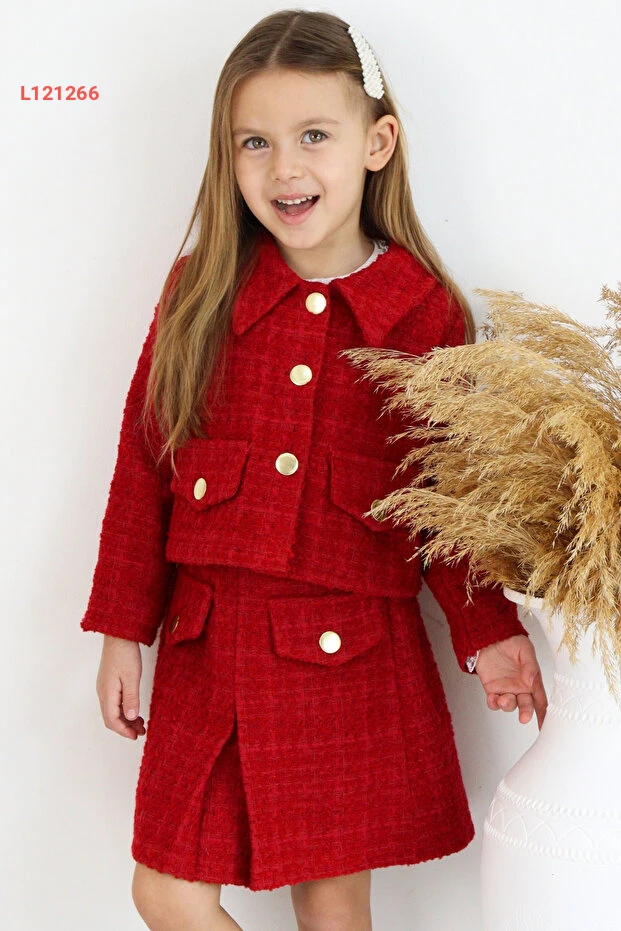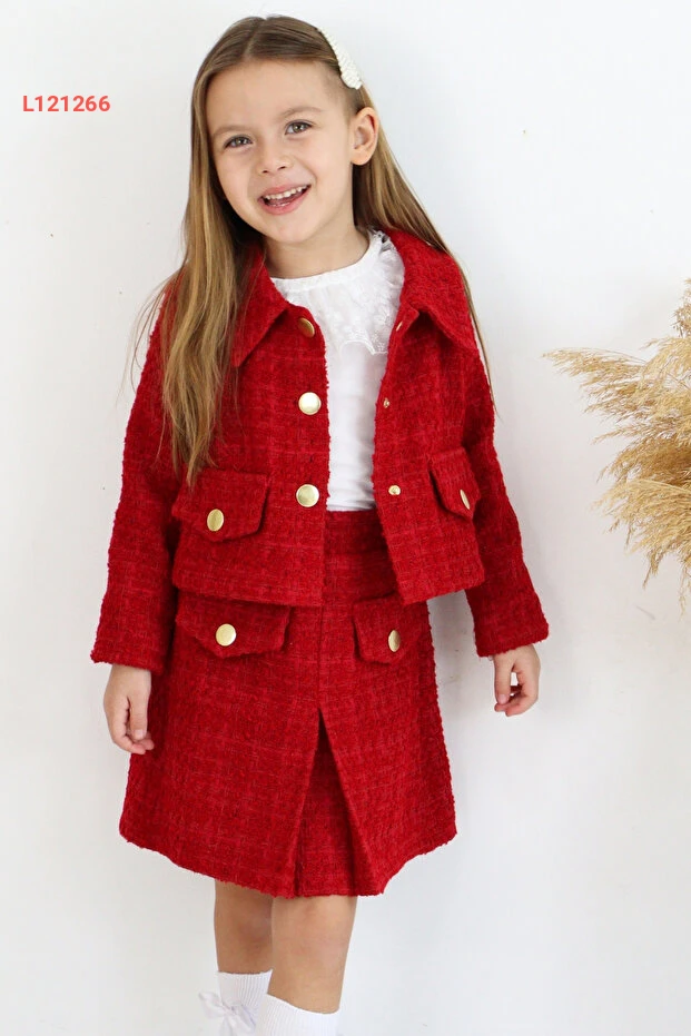 استمتعي بإطلالة مميزة مع مجموعة Parla Kids للكلمات، حيث يجمع هذا الطقم الأنيق بين الكلاسيكية والحديثة. يتكون من تنورة وجاكيت مصنوعين من قماش التويد الأحمر الفاخر، مثالي لمناسبات 23 نيسان واحتفالات رأس السنة. تصميم جذاب يضمن راحة طفلتك وأناقتها في كل لحظة.