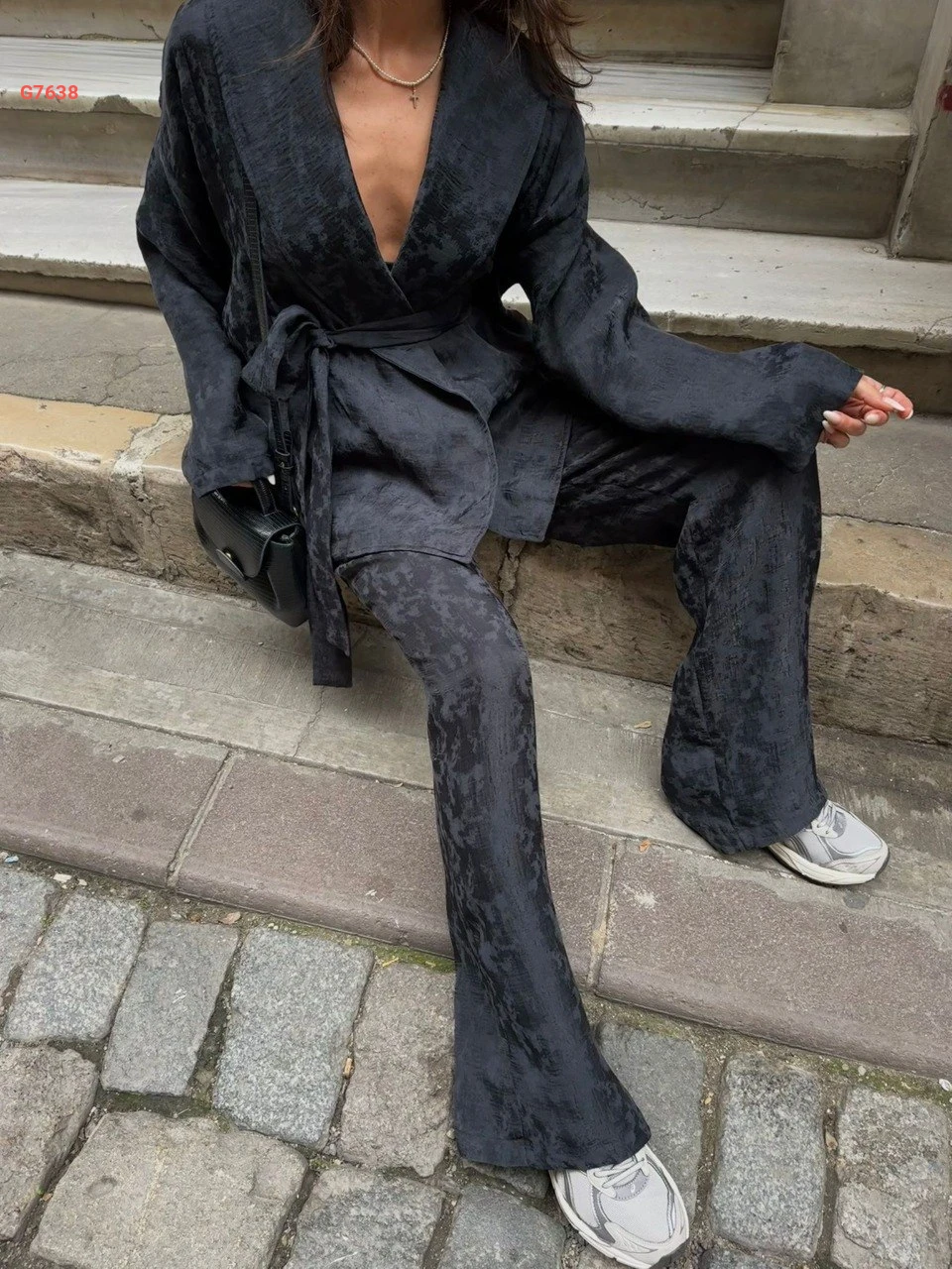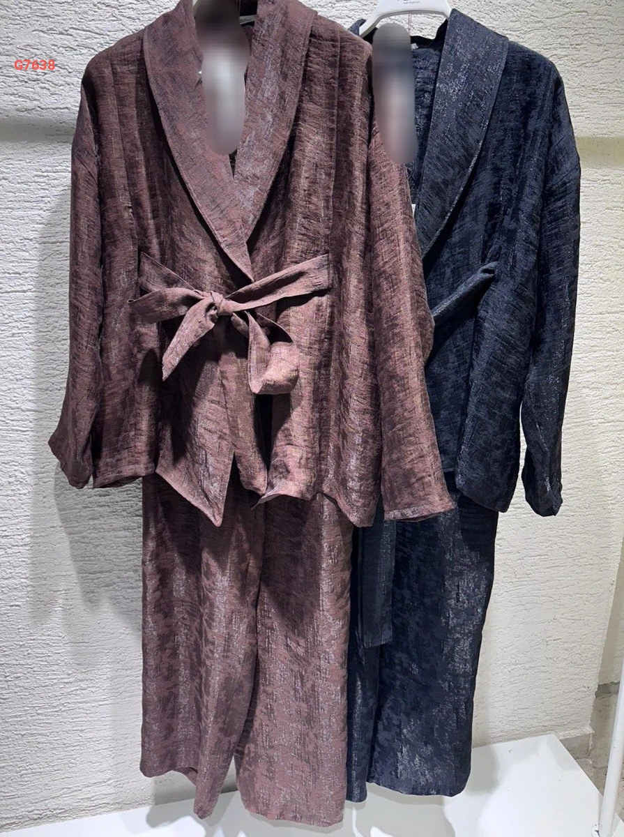 طقم بنطال منقوش مع جاكيت بزنار