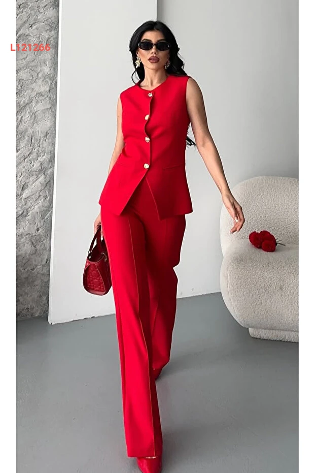 طقم بنطال وست مكون من قميص مزين بالأزرار للنساء باللون الأحمر