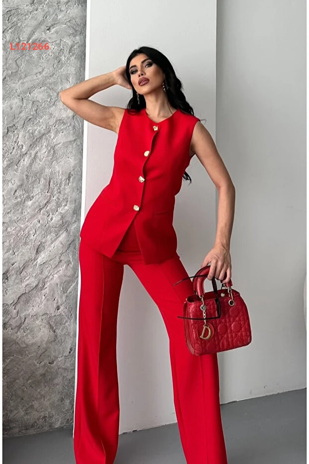 استمتعي بجاذبية وأناقة هذا الطقم النسائي المكون من سترة مزينة بالأزرار وسروال متناسق باللون الأحمر الجذاب. تم تصميمه بعناية ليضمن الراحة والسهولة في الحركة، ما يجعله الخيار المثالي لكل إطلالة عصرية. أضيفي لمسة من الأناقة لملابسك اليومية مع هذا الطقم الذي يجمع بين الأناقة والعملية.
