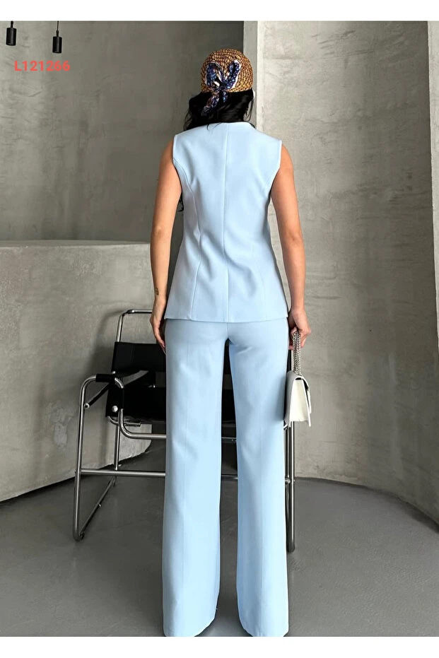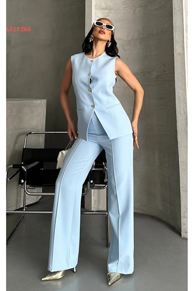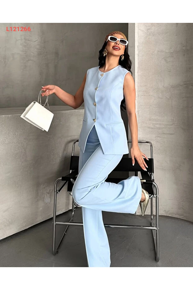 طقم بنطال و سترة مزينة بالأزرار للنساء بلون أزرق فاتح