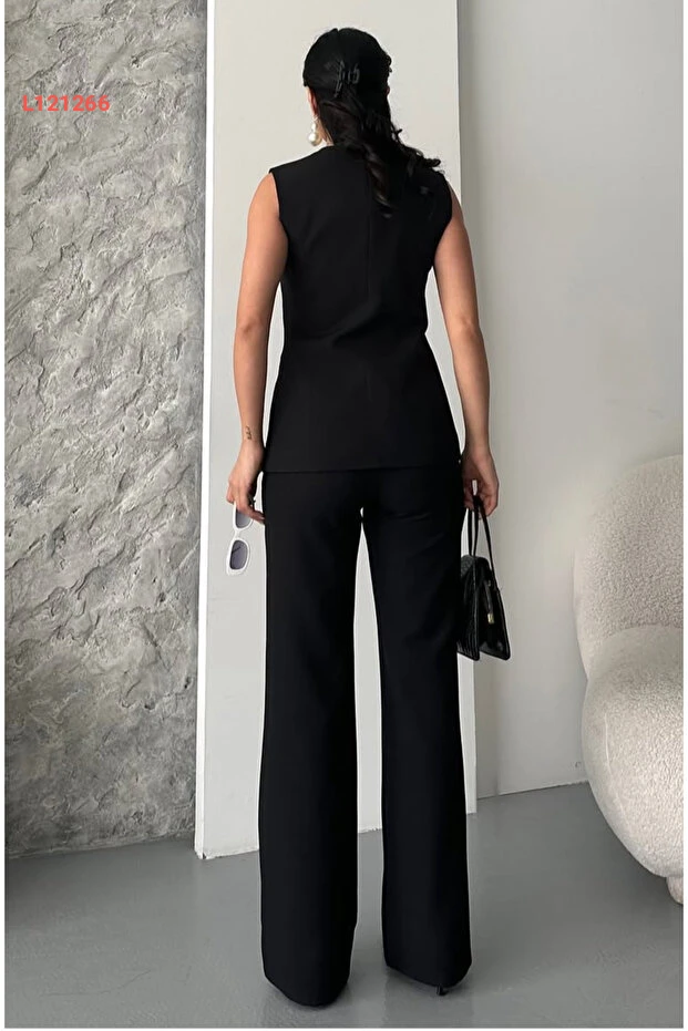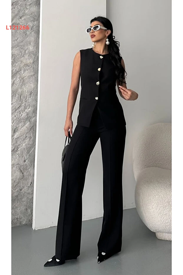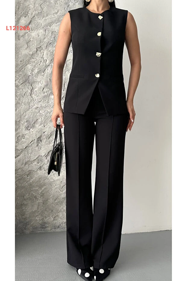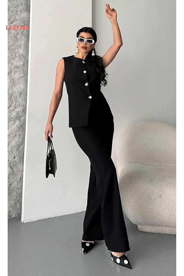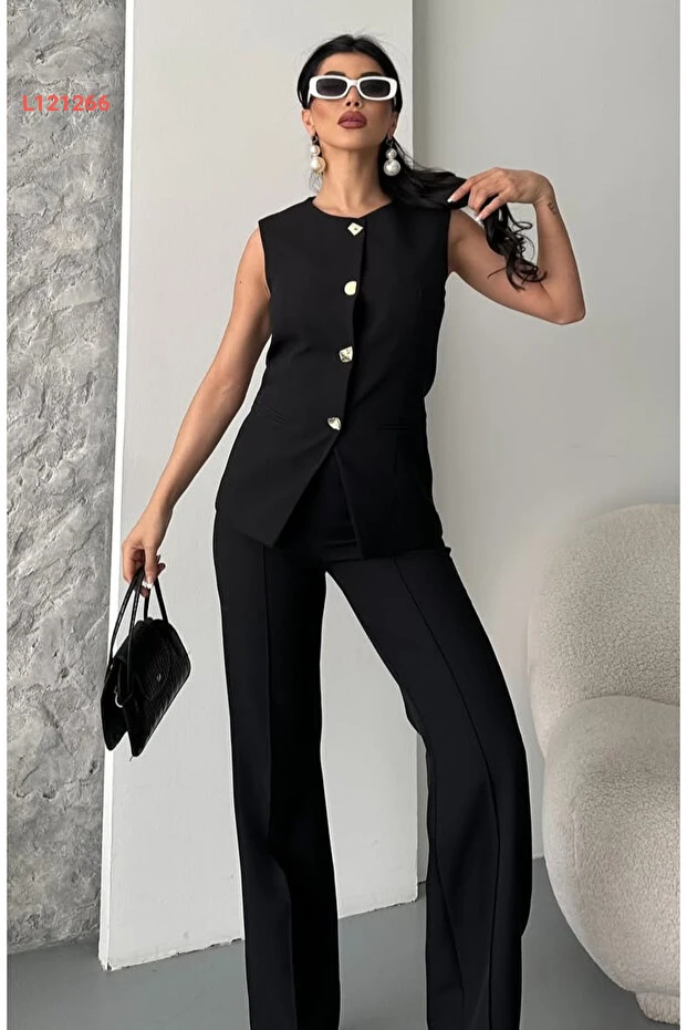 بذلة نسائية بتصميم عصرية مع سترة مزودة بأزرار وسروال باللون الأسود