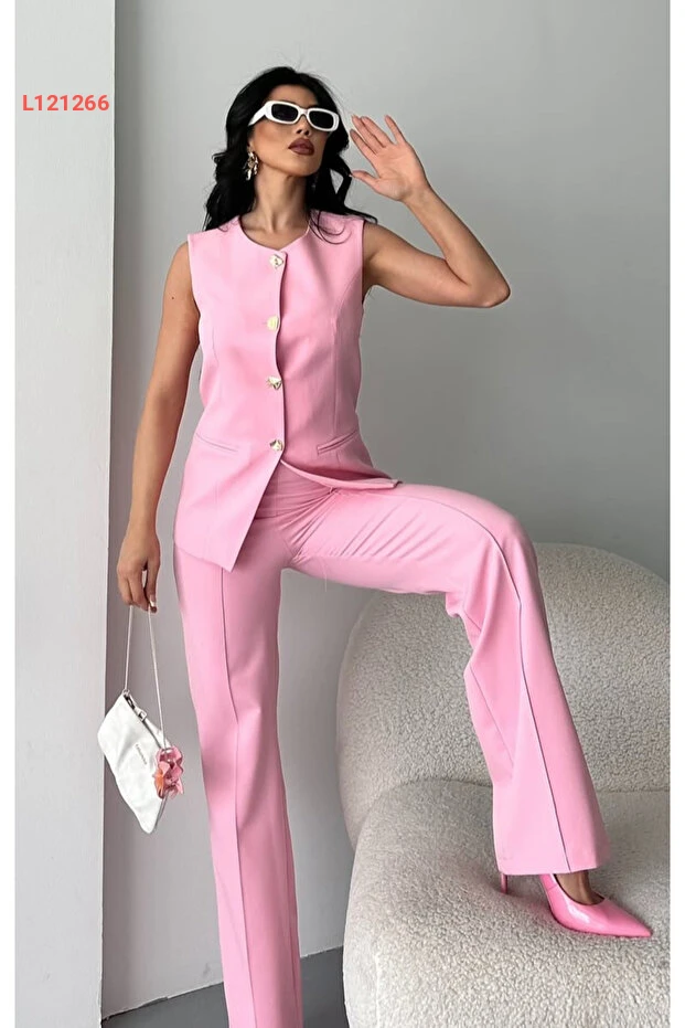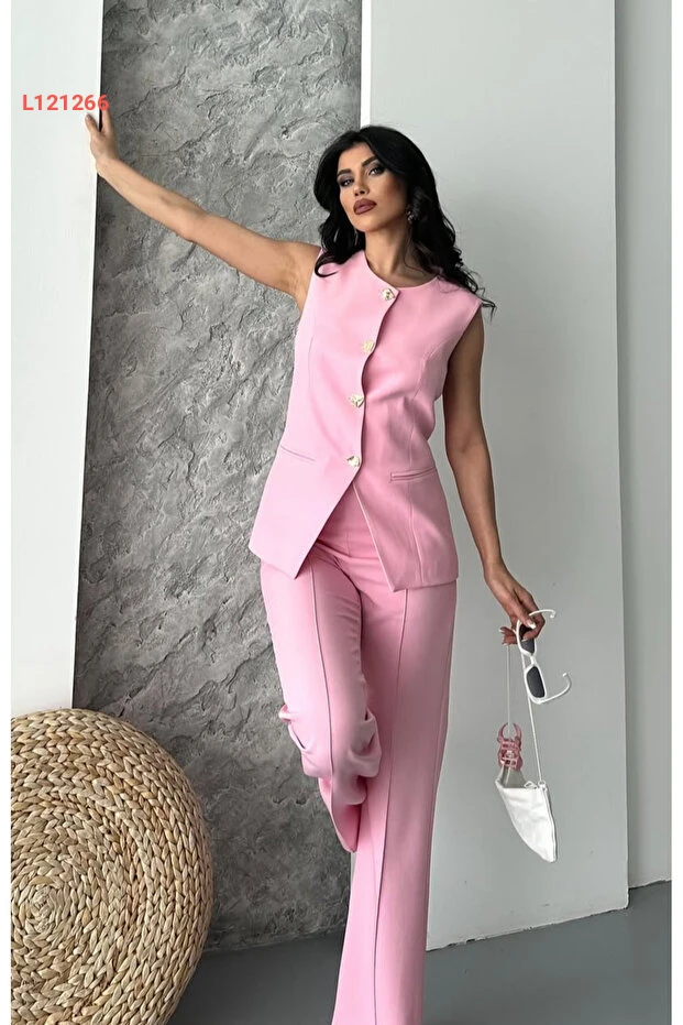 استمتعي بإطلالة عصرية ومميزة مع مجموعة "Pembekurdelem" المكونة من سترة وبنطلون مزين بأزرار، بتصميم أنيق ولون شفاف مبهج. يجمع هذا الطقم بين الراحة والأناقة، مما يجعله الخيار المثالي لمناسباتك اليومية أو الخروجات الخاصة. تميزي بإطلالة فريدة تعكس ذوقك الرفيع!