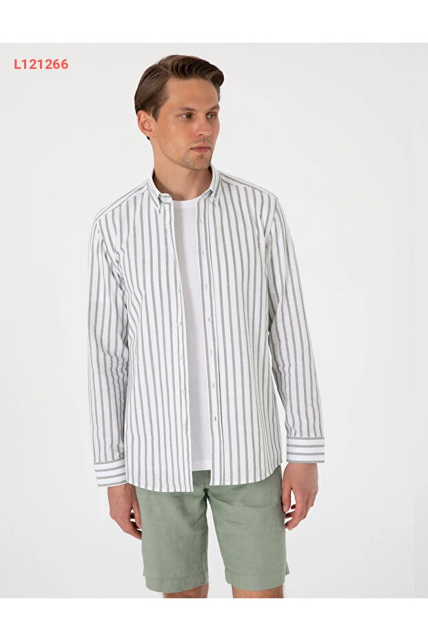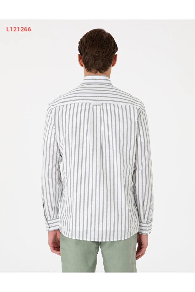 قميص بيير كارديان مخطط بأكمام طويلة بتصميم عادي اللون البيج
