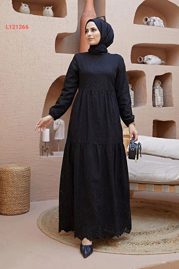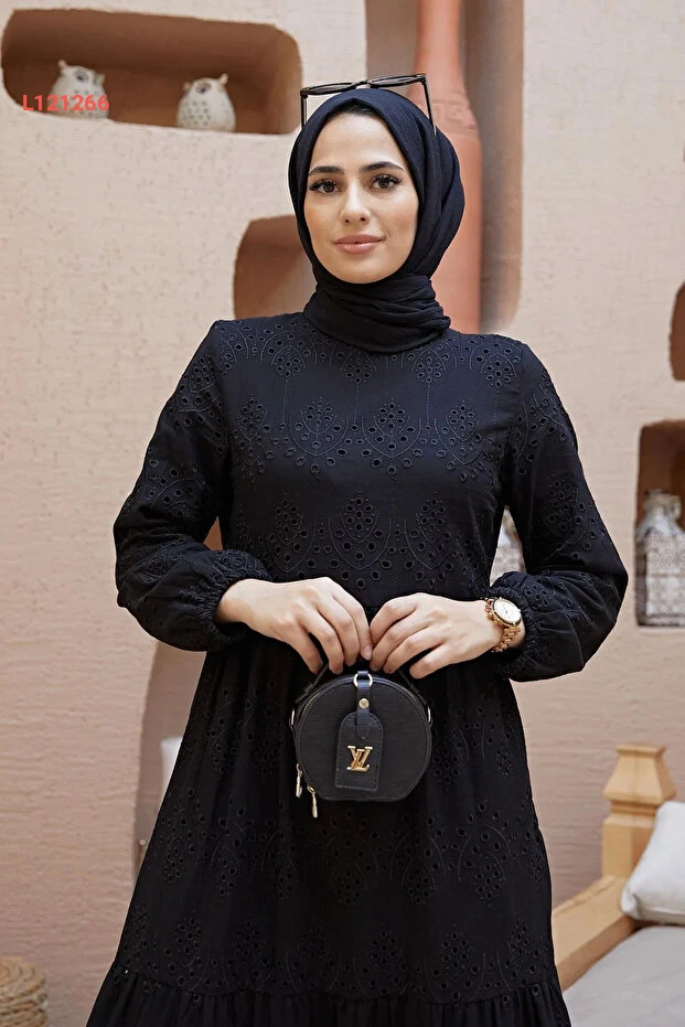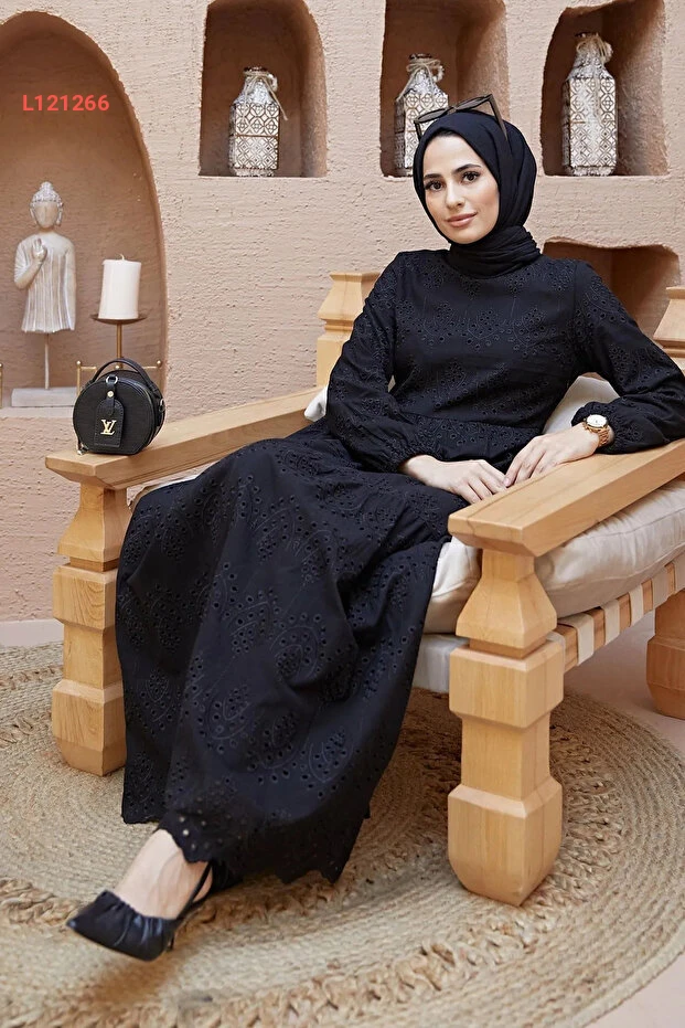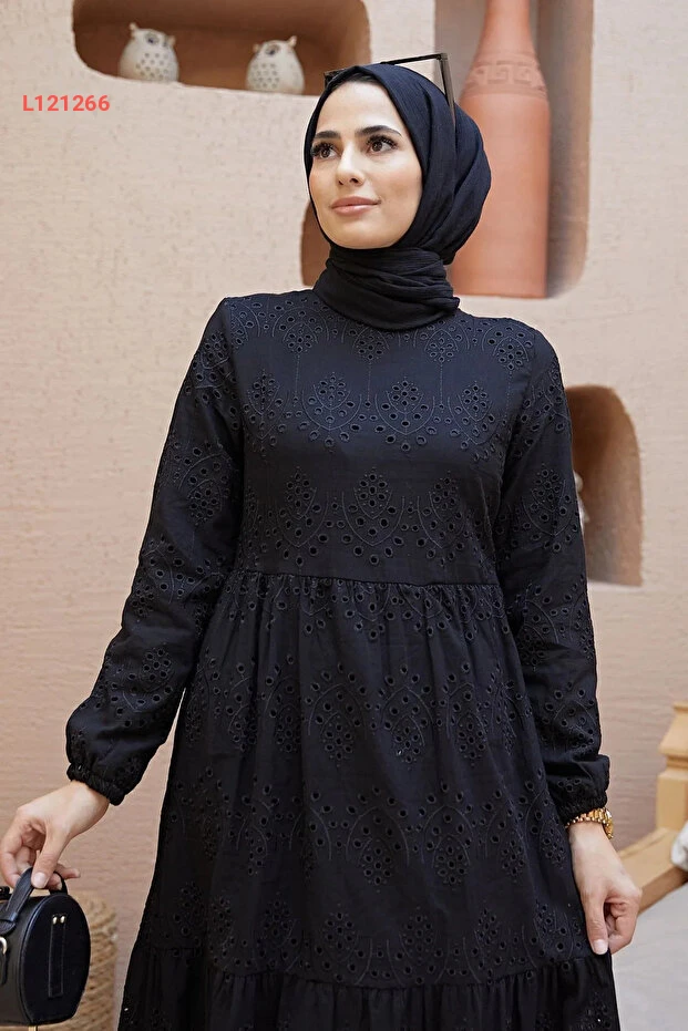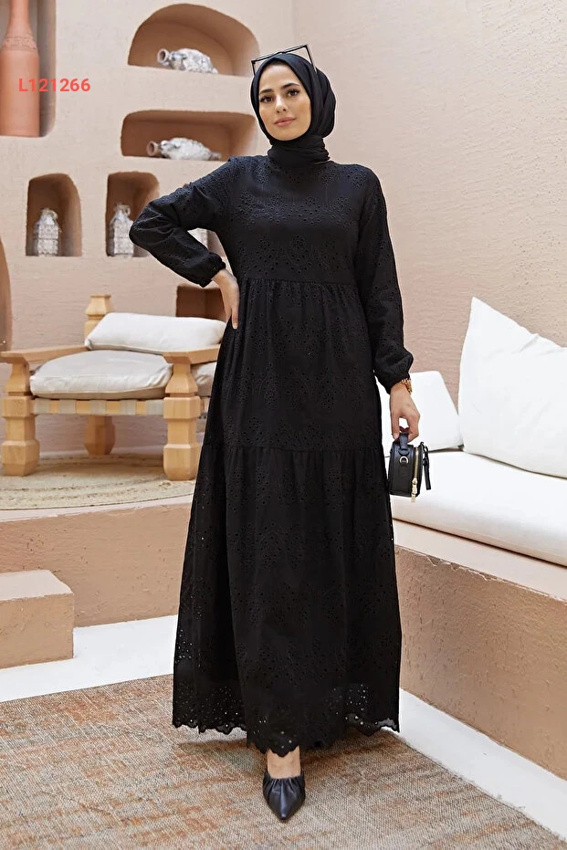 تألقي بأناقتك مع فستان PİNK FLY الطويل باللون الأسود، المصنوع من الدانتيل البروجيد الرائع الذي يضيف لمسة من الجمال الفريد. يتميز بتصميمه الأنيق والمريح، مما يجعله الخيار المثالي لمناسباتك الخاصة أو ليومك العادي، لتكوني دائمًا في قمة أناقتك.