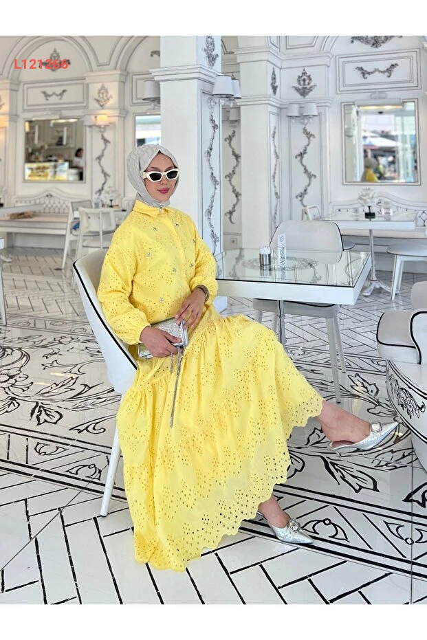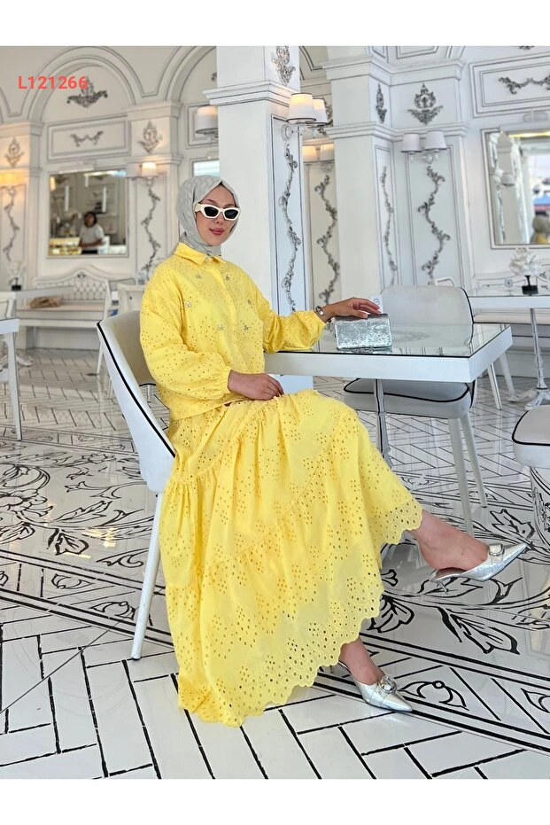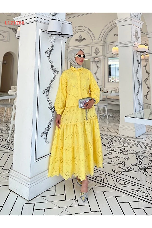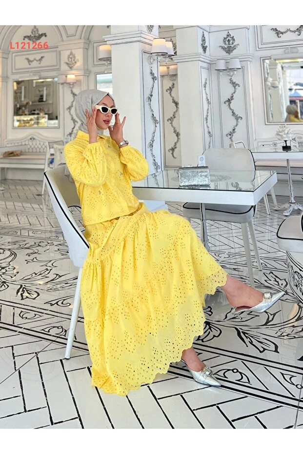استمتع بإطلالة أنيقة ومريحة مع طقم FİNK FLY الصيفي بلون أصفر زاهي، الذي يتميز بتفاصيل حجرية جذابة. يجمع التصميم الرائع بين الأناقة والاحتشام بفضل التنورة الطويلة وطبقات الفيتس الرائعة، مما يجعله الخيار المثالي لتكوني متألقة في سهراتك اليومية أو المناسبات الخاصة.
