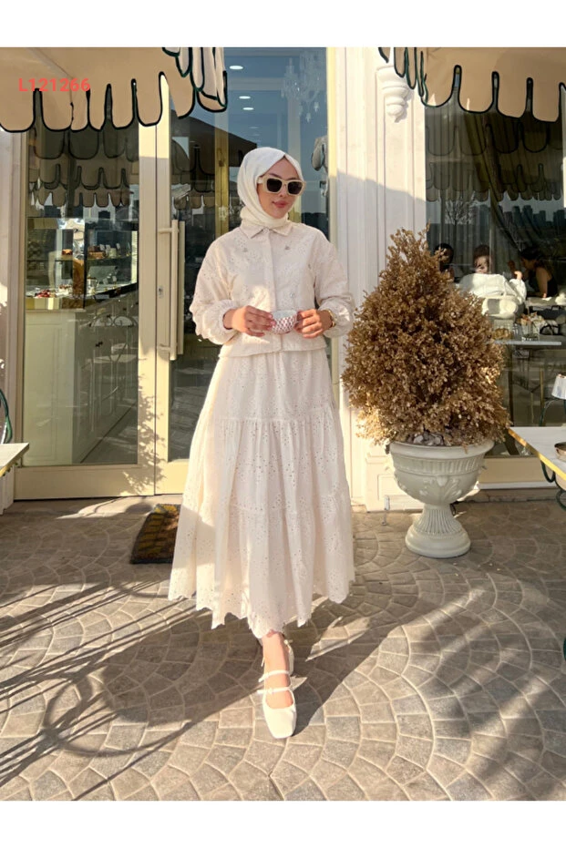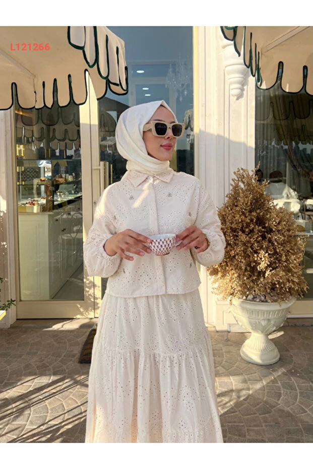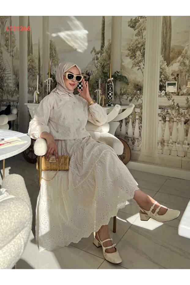 بدلة فستو كريمية مزينة بالأحجار مع تنورة طويلة للطراز المحتشم
