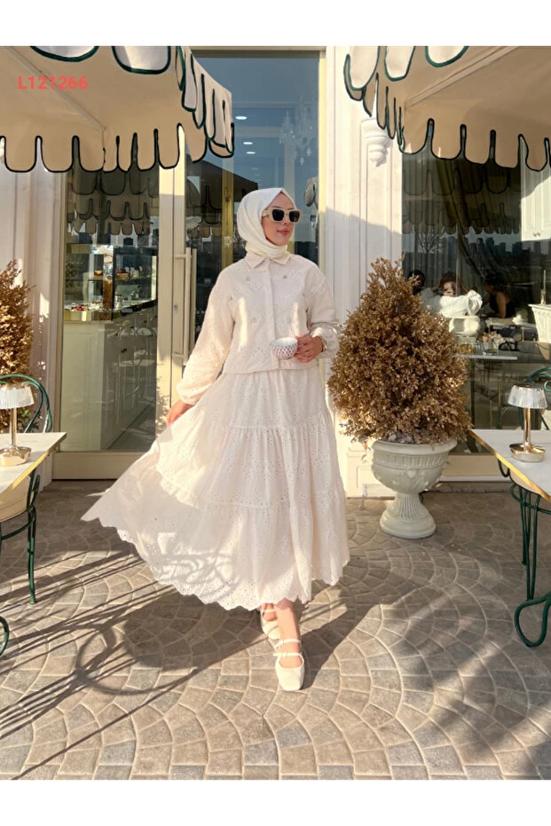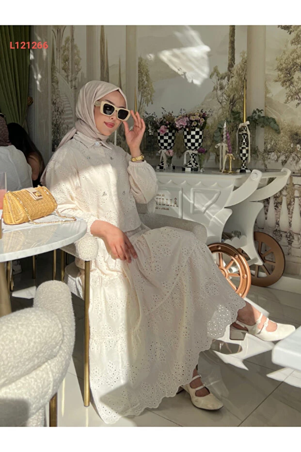 استمتع بالأناقة والراحة مع طقم PİNK FLY الصيفي بتصميم الفستان الطويل ذي التفاصيل الحجرية الرائعة. يتميز بلون الكريمة الجميل وتطريز الفستان الفخم، مما يجعله الخيار المثالي لإطلالة مميزة ومحتشمة في المناسبات الصيفية. ارتديه مع إكسسوارات بسيطة ليضفي لمسة من الأناقة على إطلالتك.