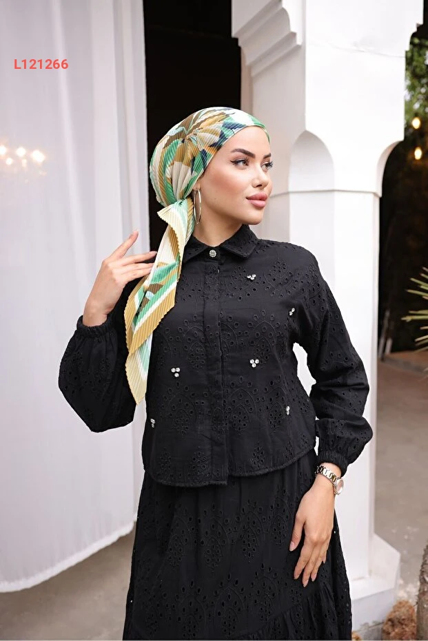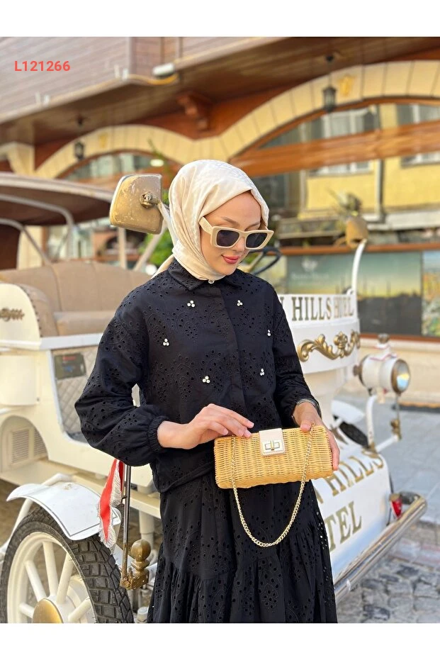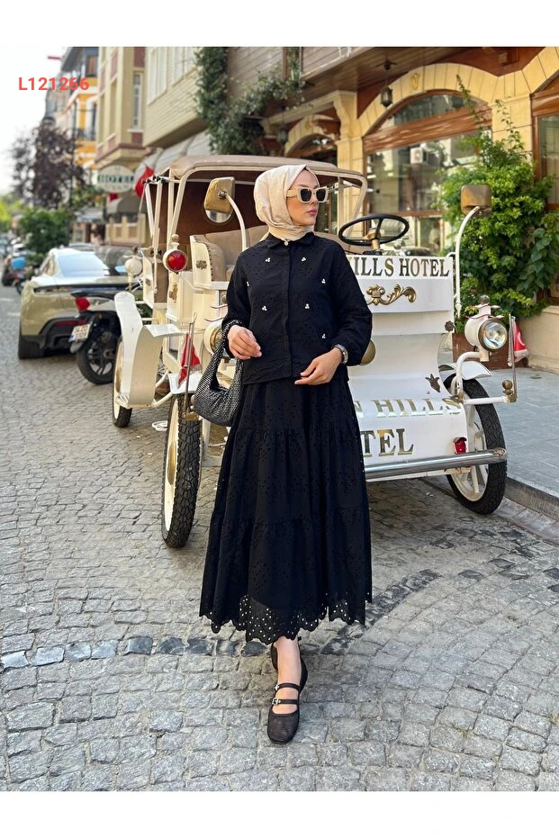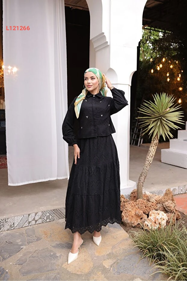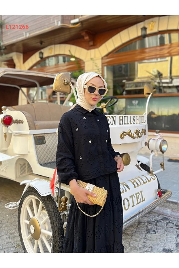 استمتعي بأناقة لا مثيل لها مع طقم Fisto للتسوق من PİNK FLY، الذي يتميز بتنورة طويلة مزينة بتفاصيل حجرية أصلية. صمم بلون أسود أنيق يتناغم مع أي مناسبة، ليجمع بين الراحة والاحتشام بأروع شكل، مما يجعلكِ تتألقين بجاذبية لا تنسى.