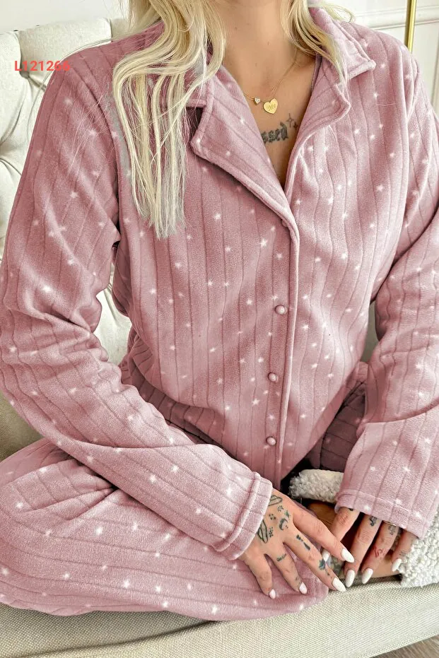 استمتع بالراحة والأناقة مع بيجامة Pijamaevi الوردية المزخرفة بتصميم القمر! تأتي هذه البيجامة بأزرار أمامية و مصنوعة من الفرو الناعم، مما يوفر لك دفءً مثاليًا في ليالي الشتاء. مثالية للاسترخاء في المنزل أو قضاء ليلة هادئة مع الأصدقاء!