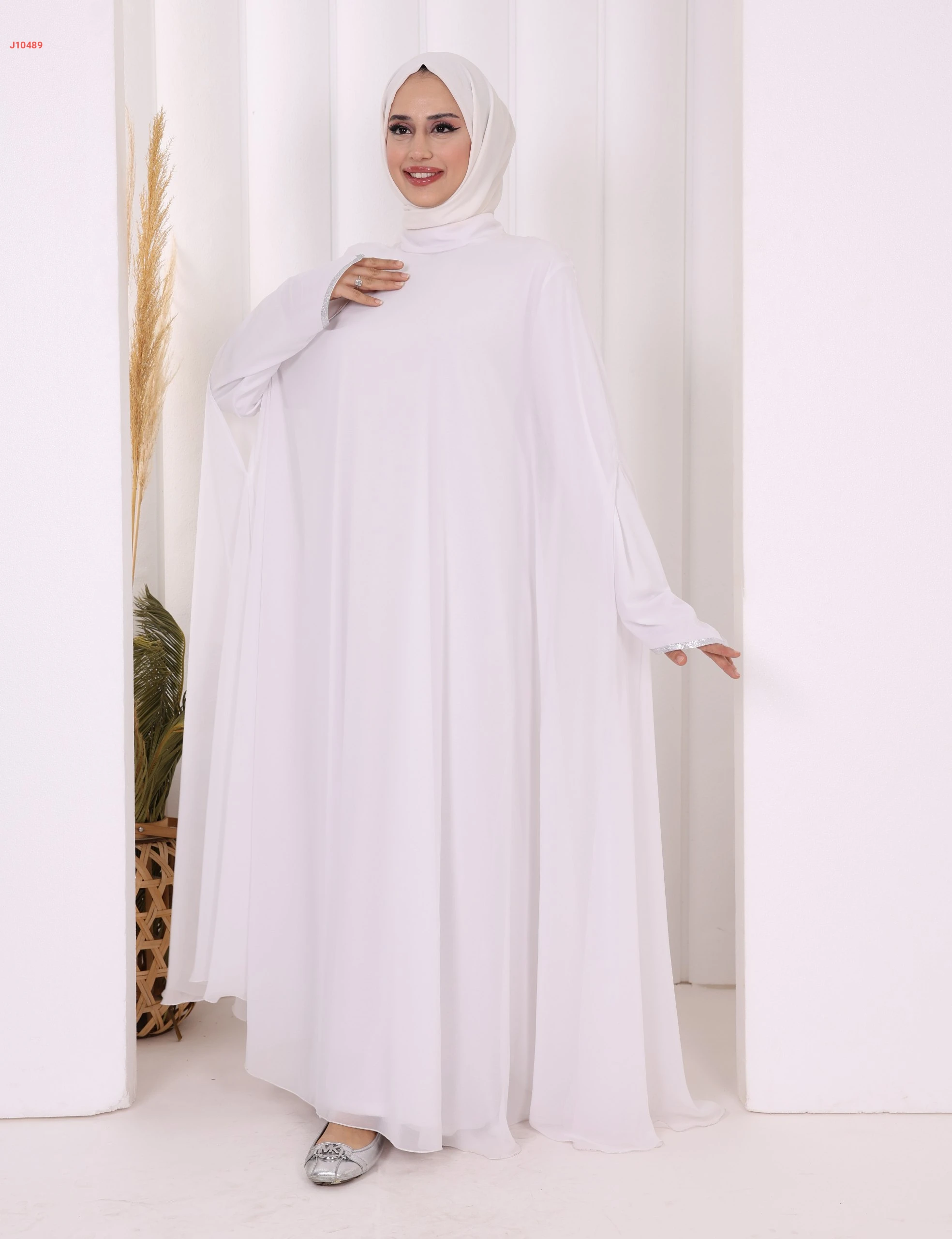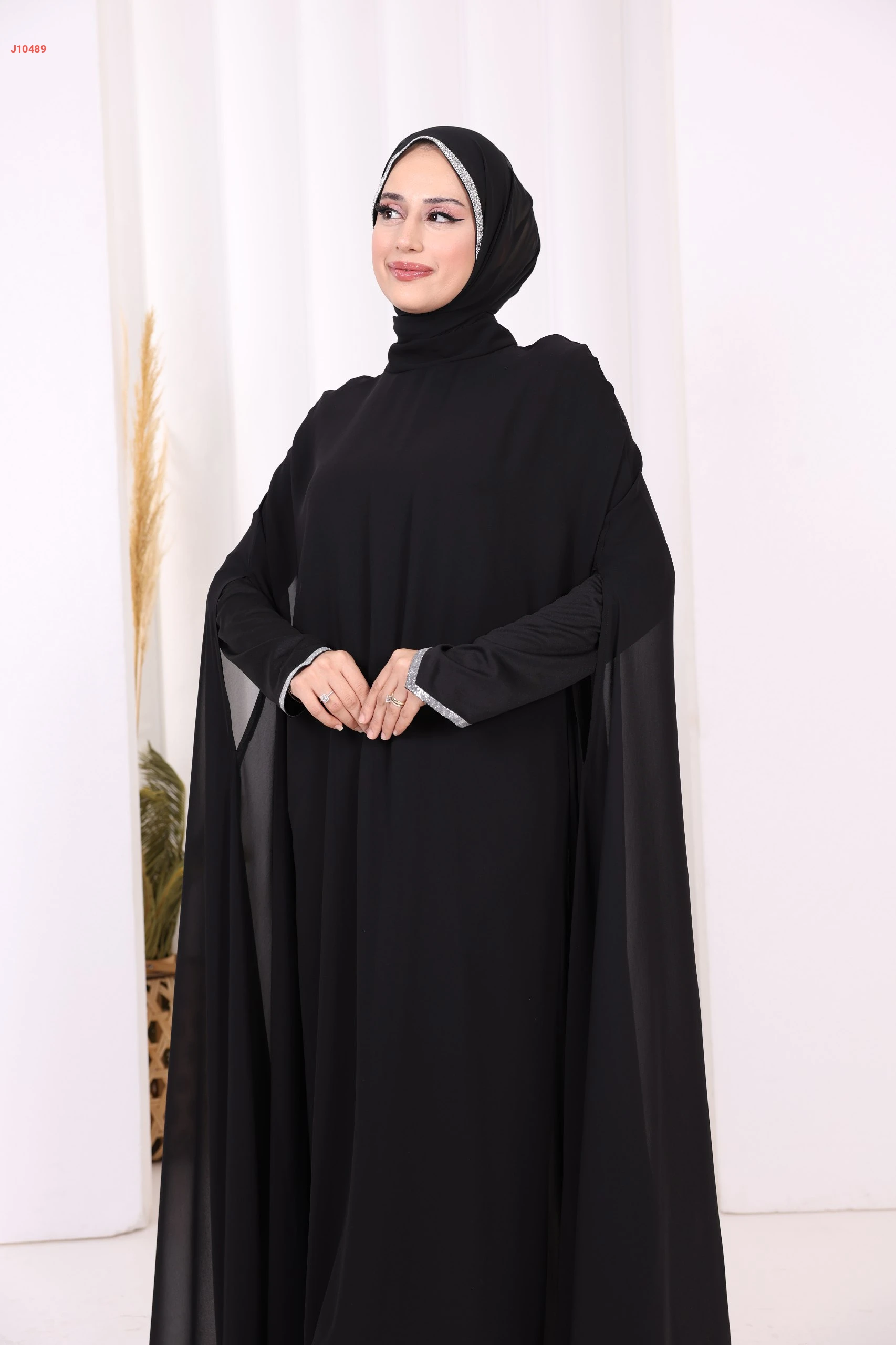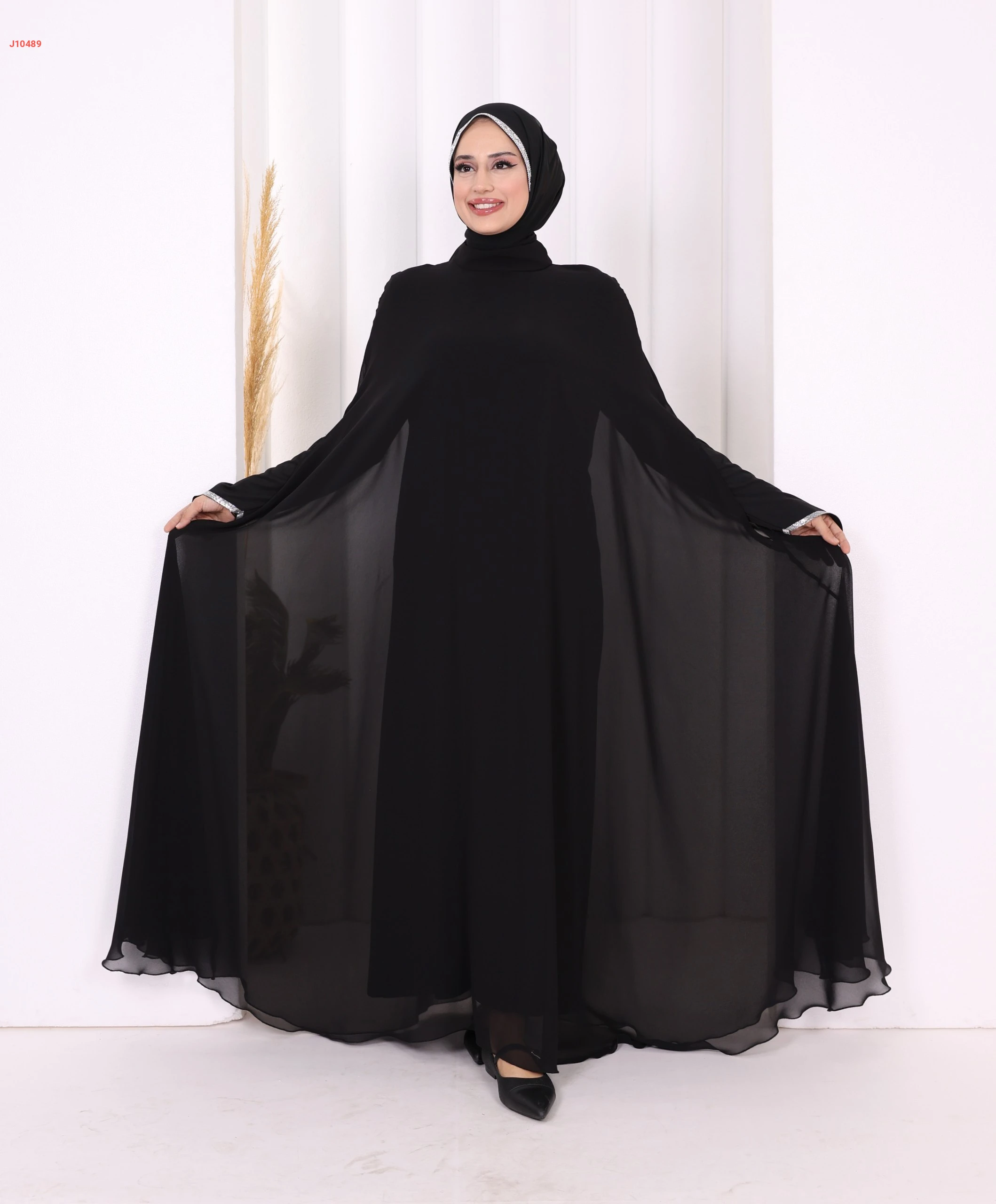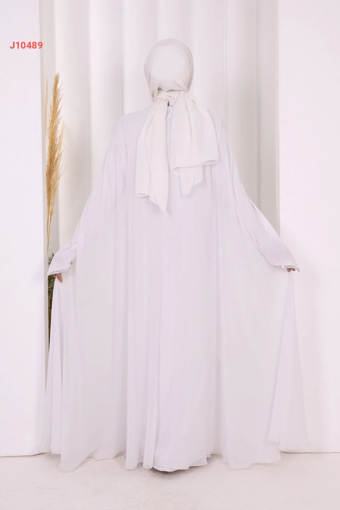 عباية سادة مبطنة شيفون بأكمام تطريز فضي ناعم