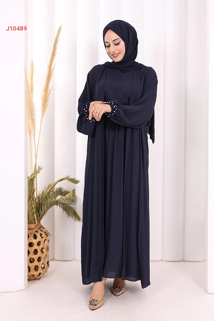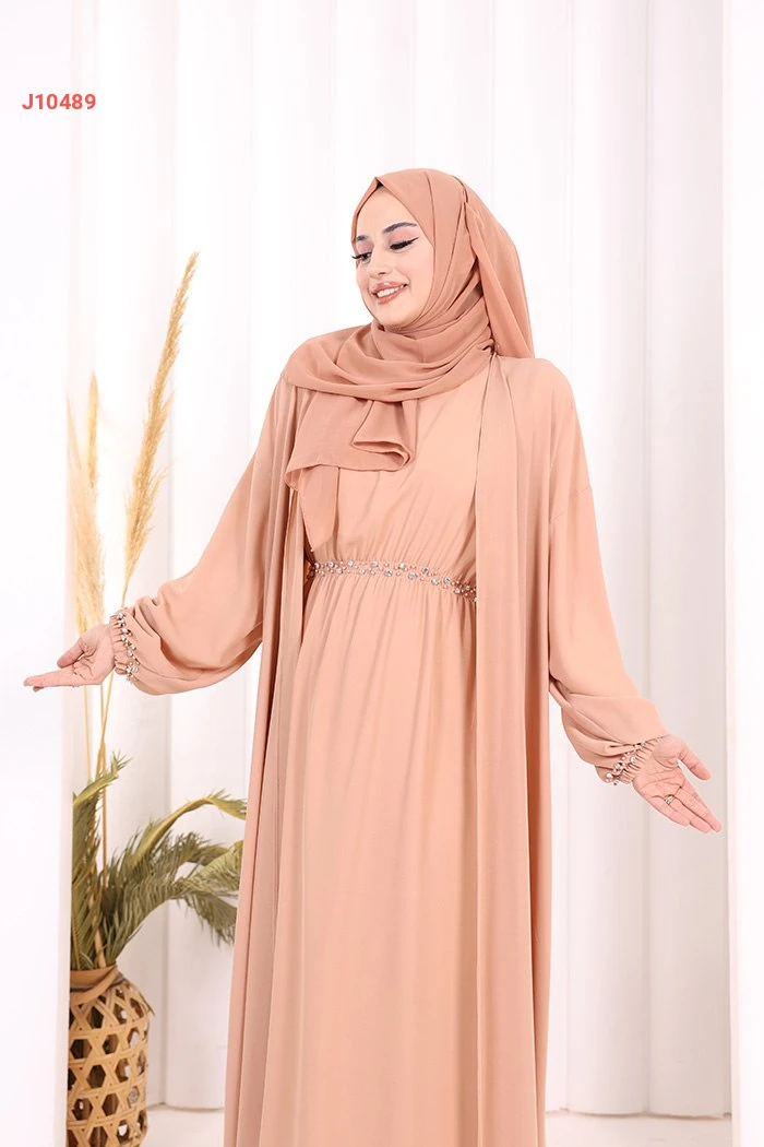 طقم عباية سادة مع فستان بزمة خصر مزينة باللؤلؤ والستراس