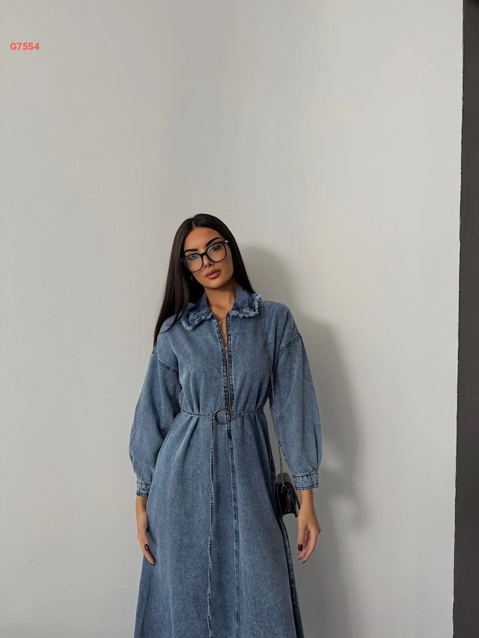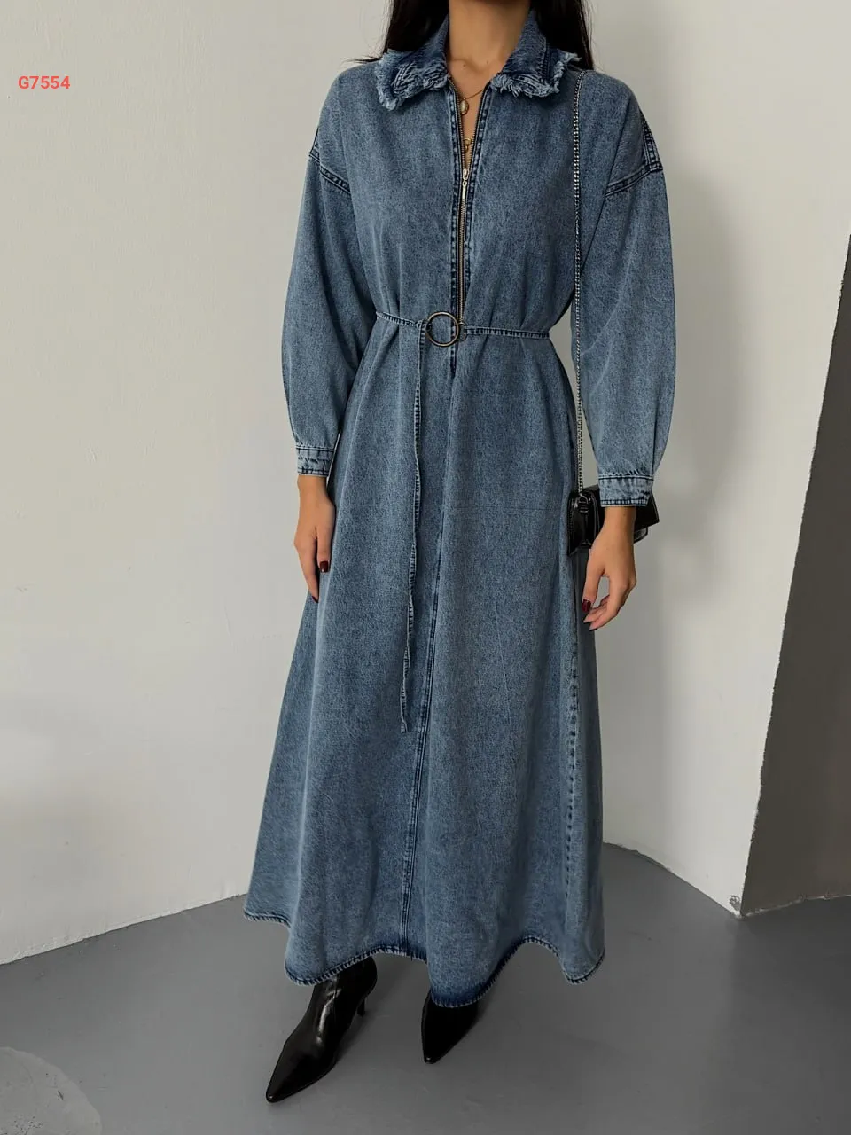 فستان جينز سادة، بسحاب نصفي، بقبة قميص ، مع حزام