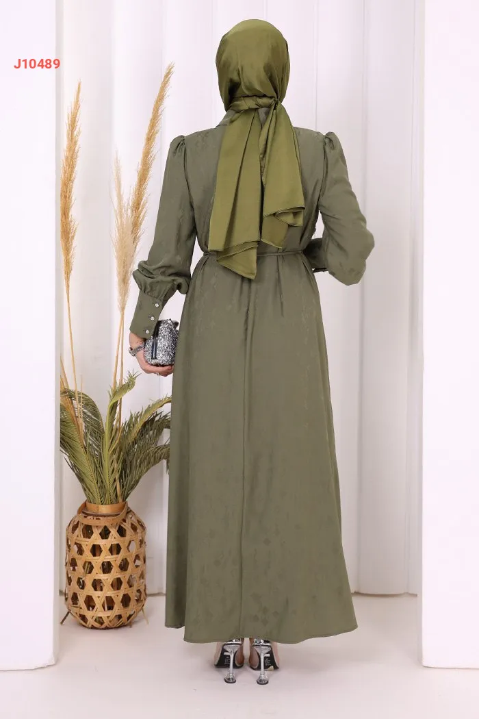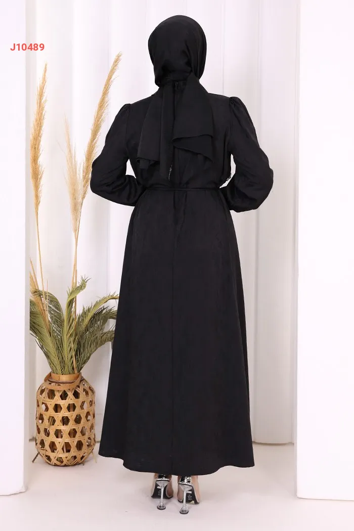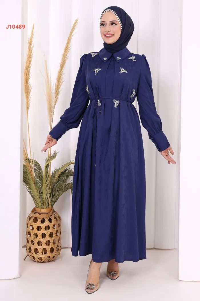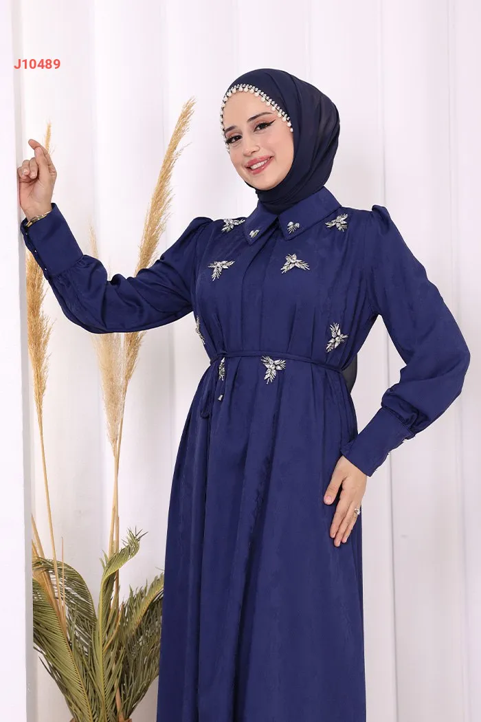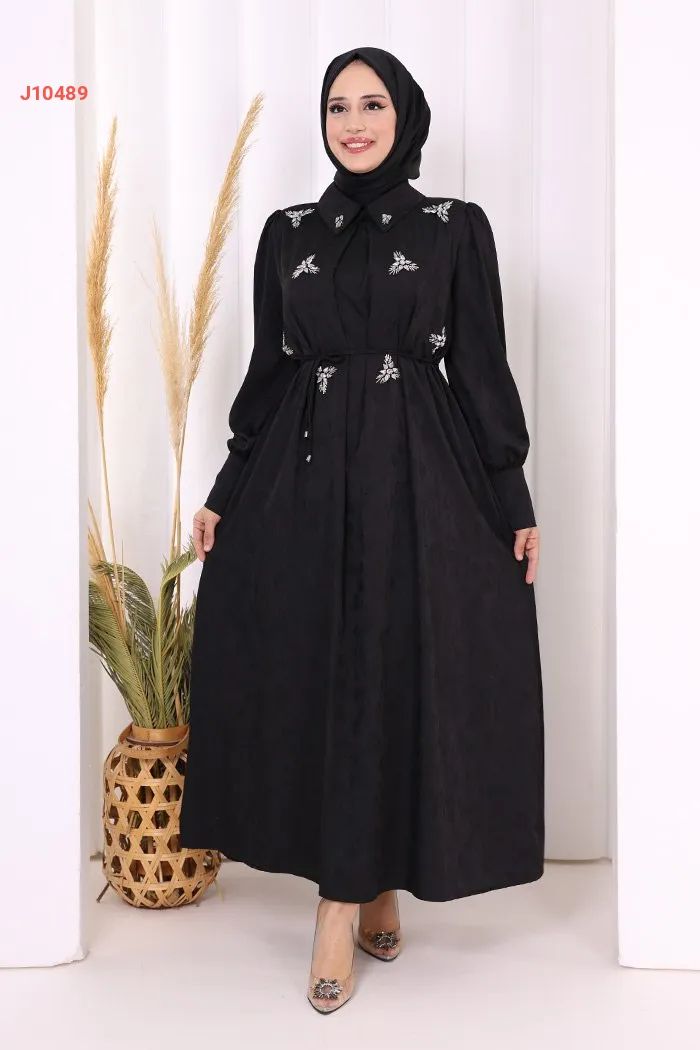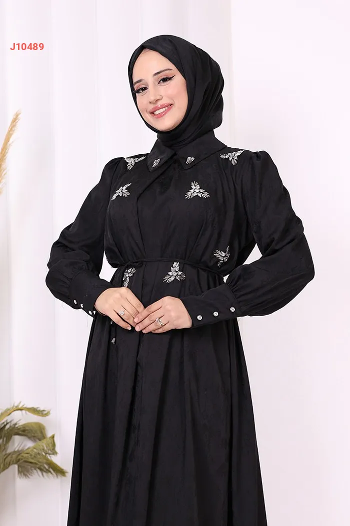 فستان سادة مزين بالكريستال عند الصدر، مع ربطة خصر