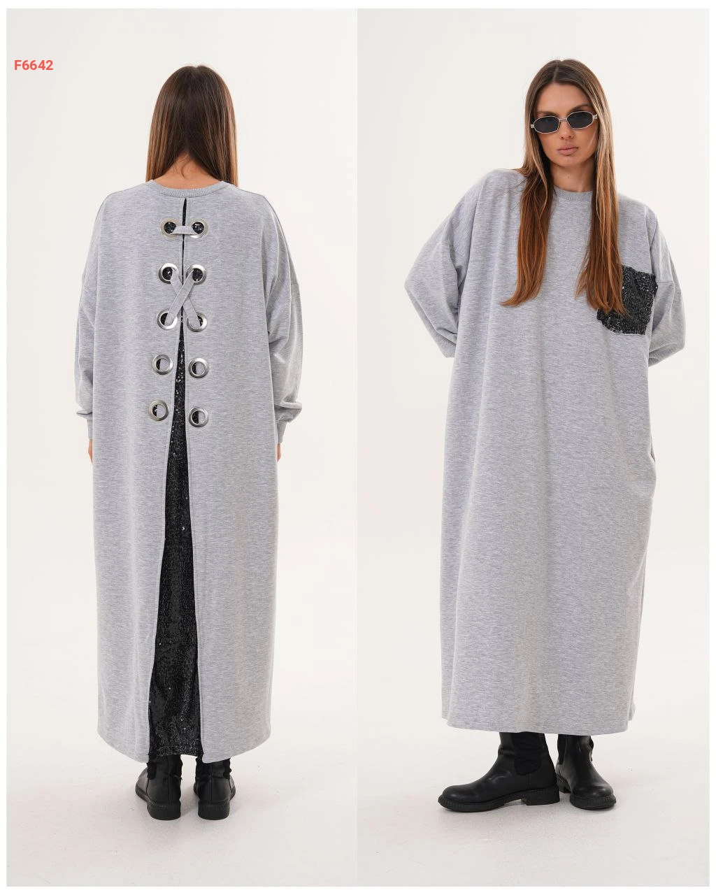 فستان سادة بفتحة من الخلف مبطنة بتطريز برق مع موديل ربطات دائرية من الظهر