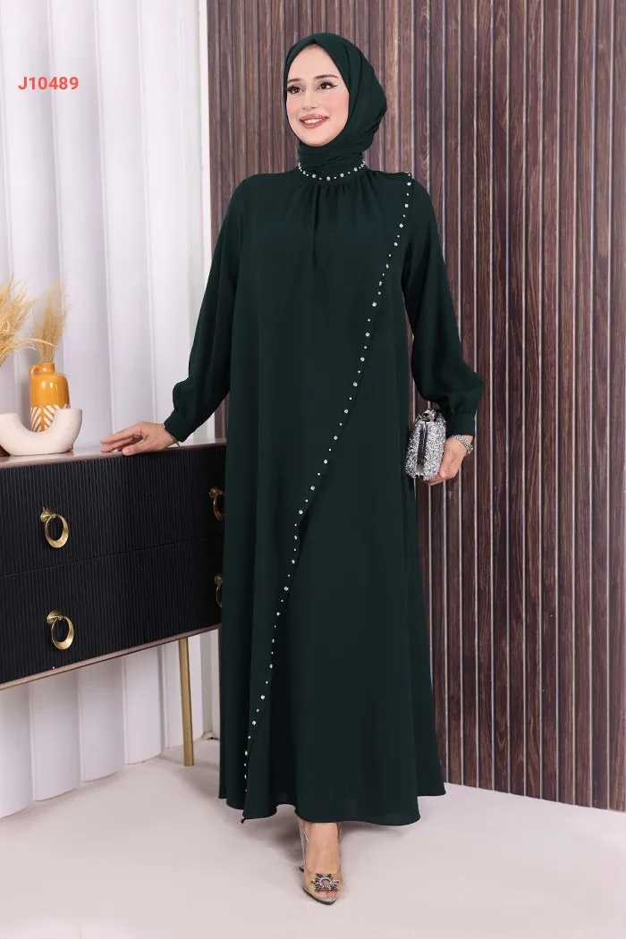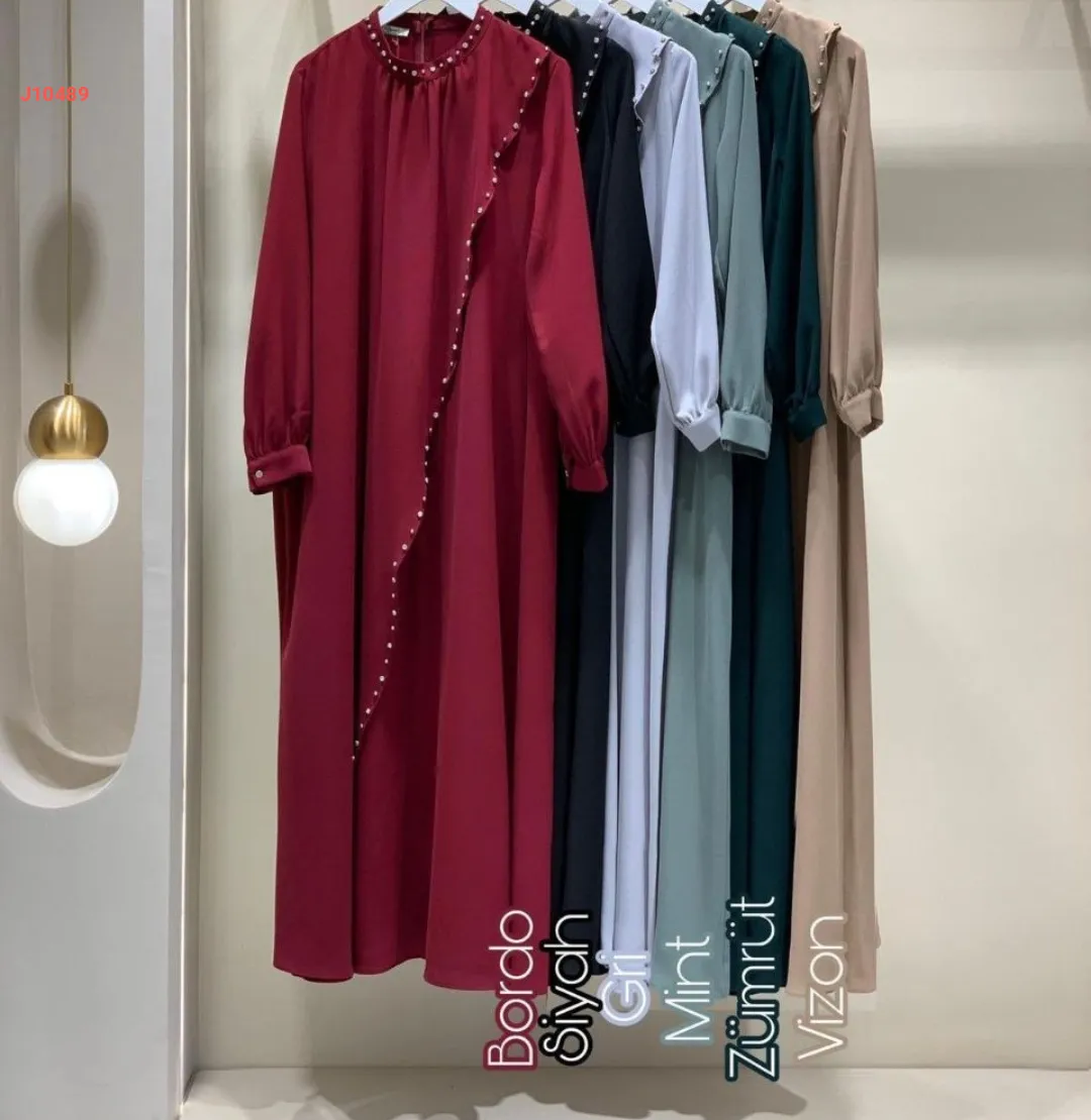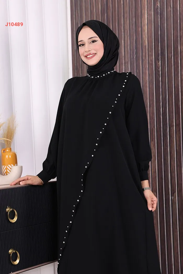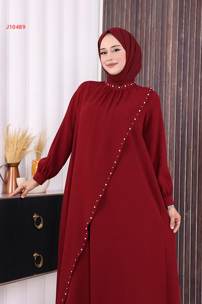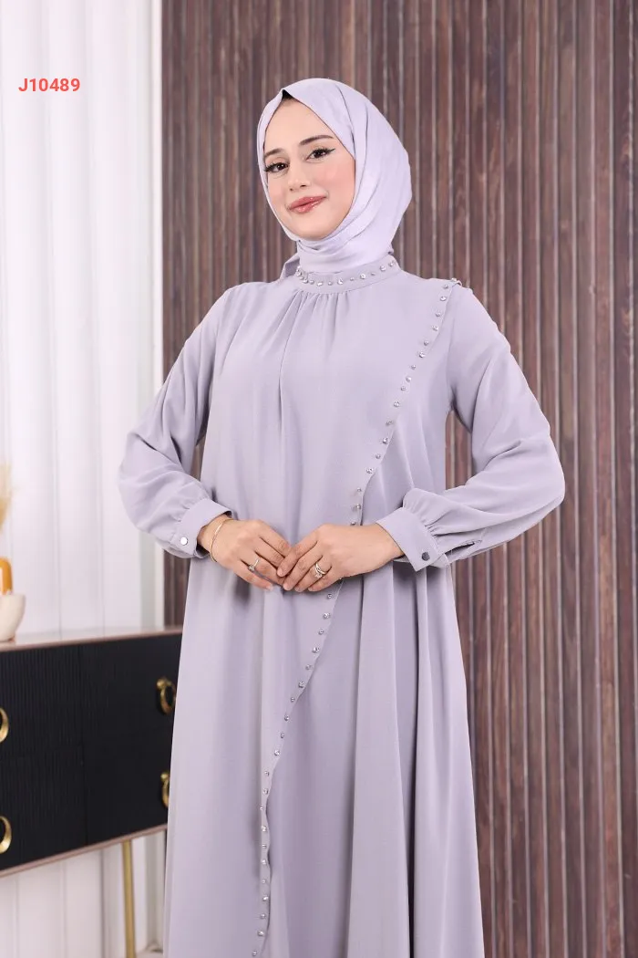 فستان سادة مع نصف طبقة مزينة باللؤلؤ بقبة دائرية