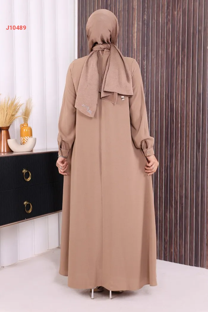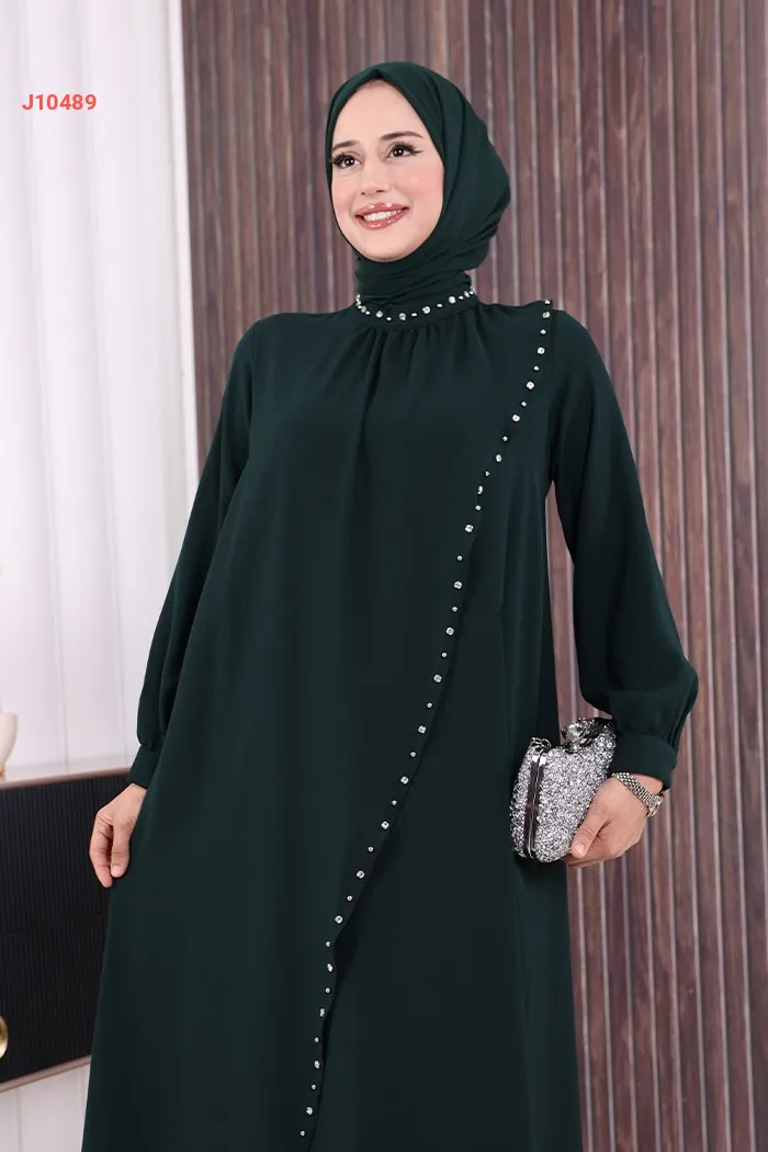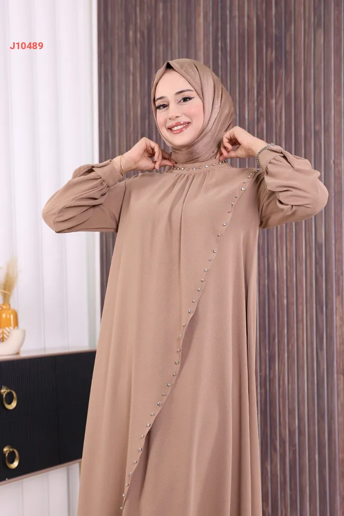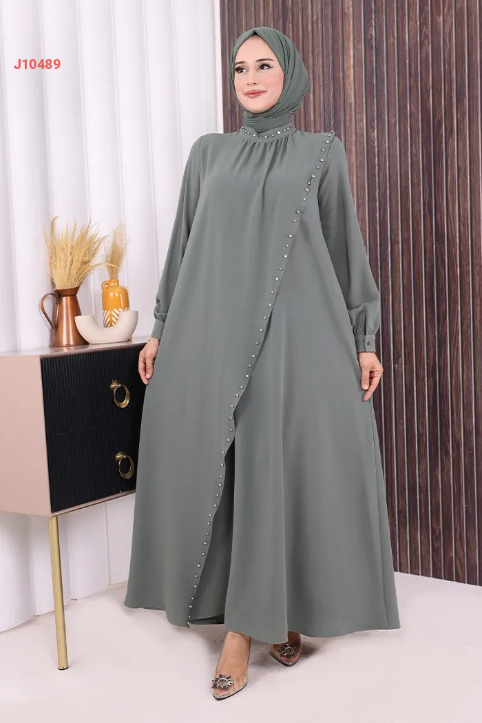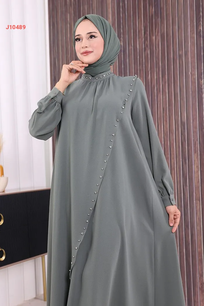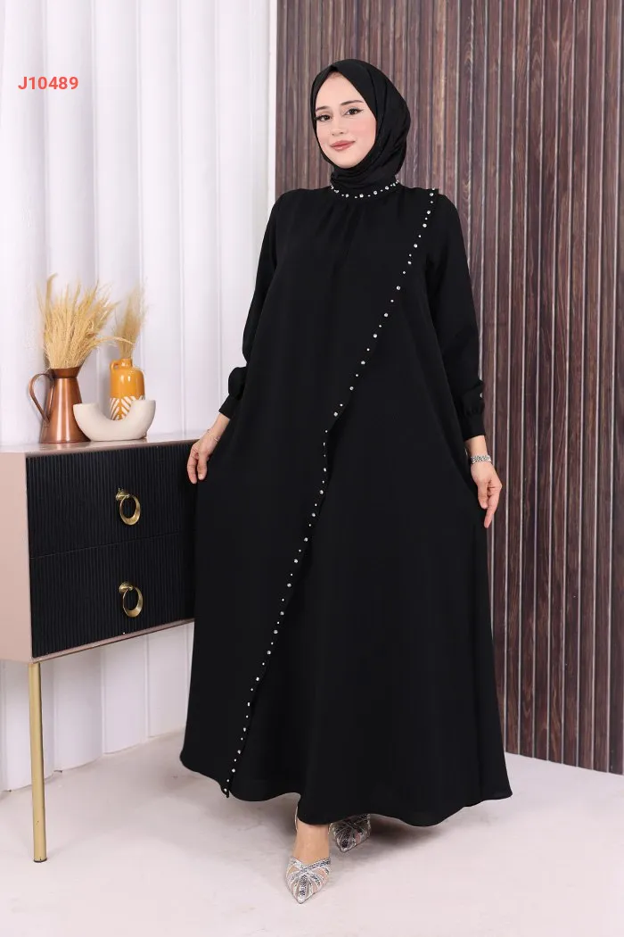 فستان سادة مع نصف طبقة مزينة باللؤلؤ بقبة دائرية