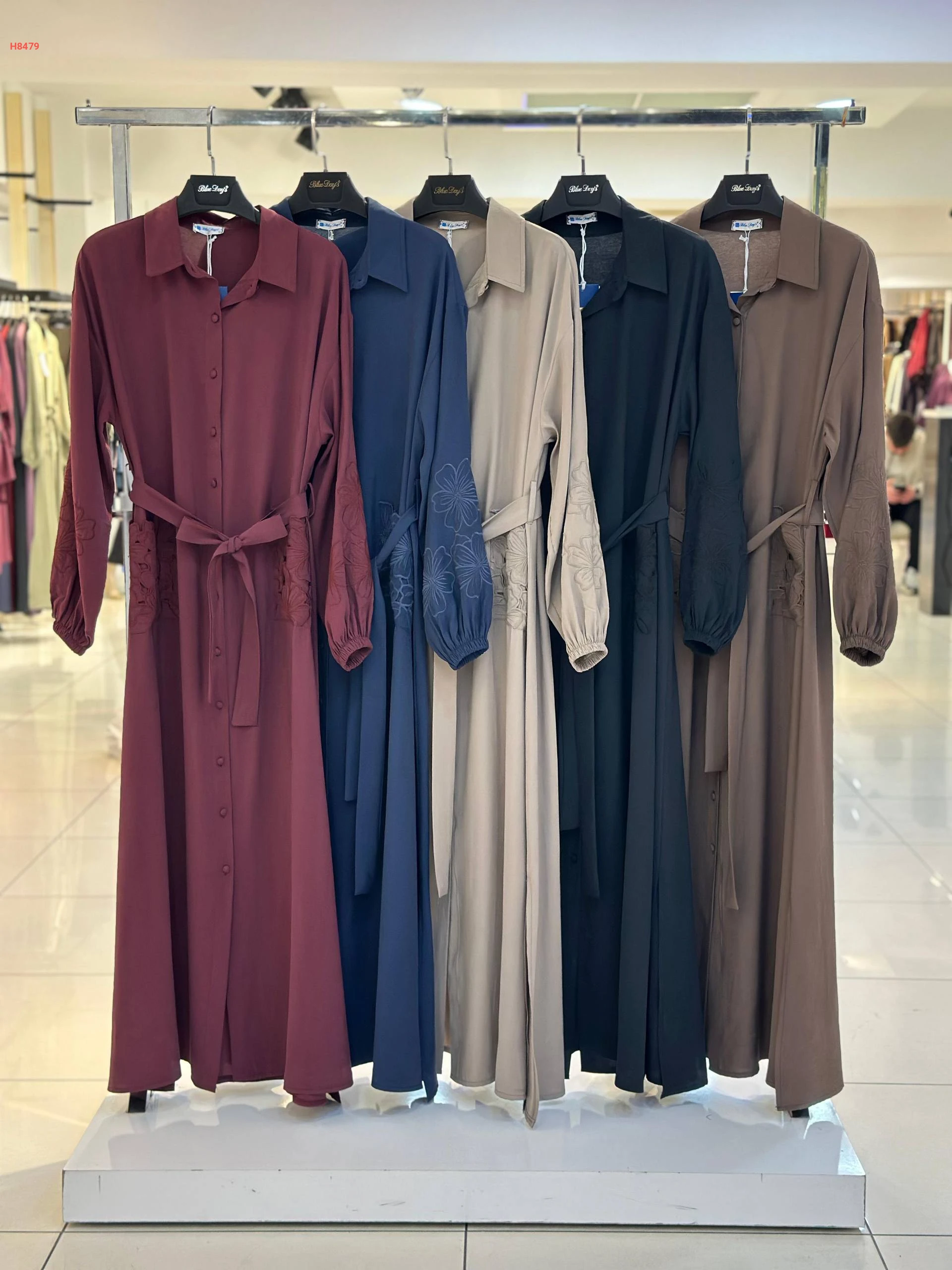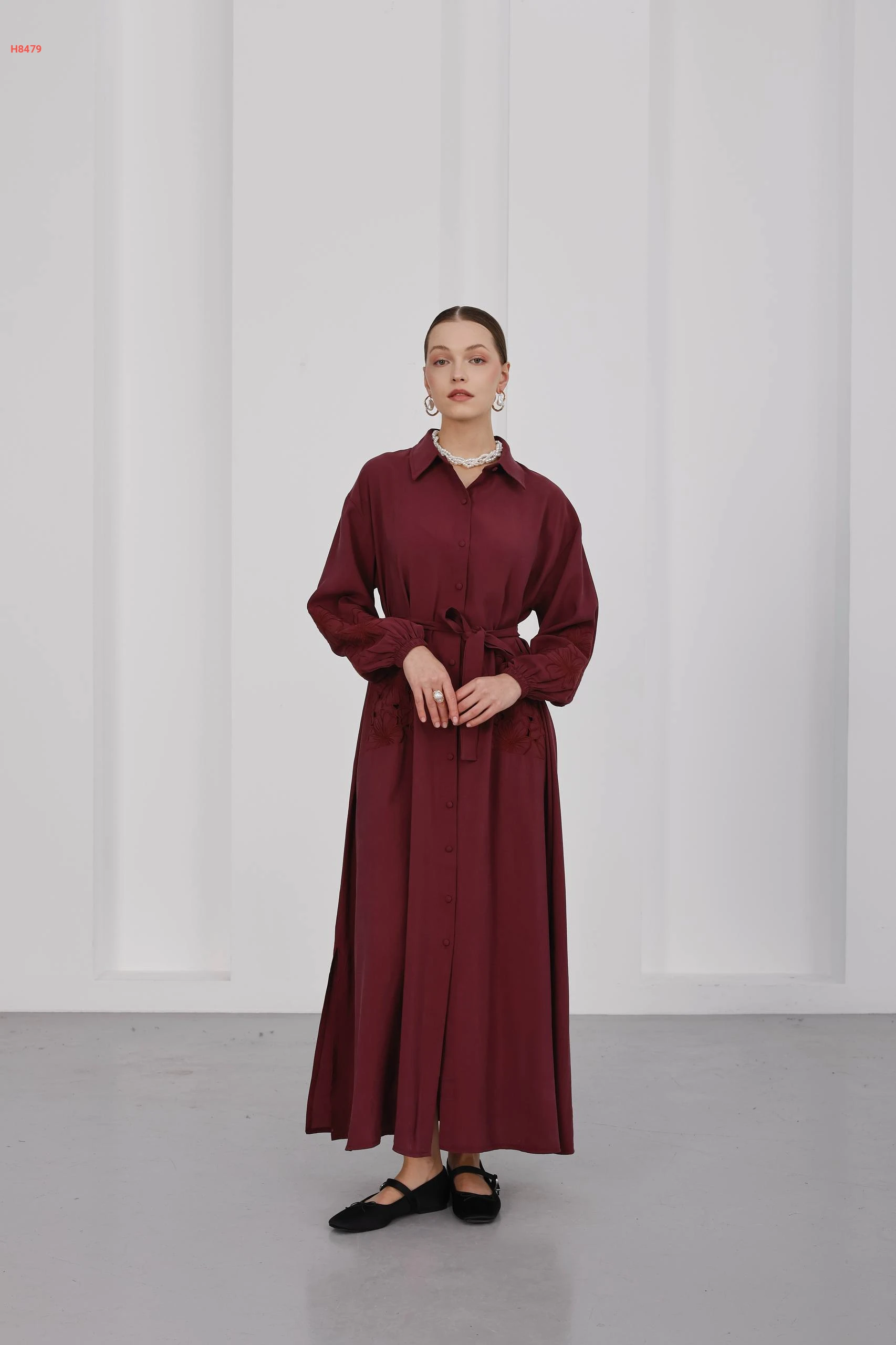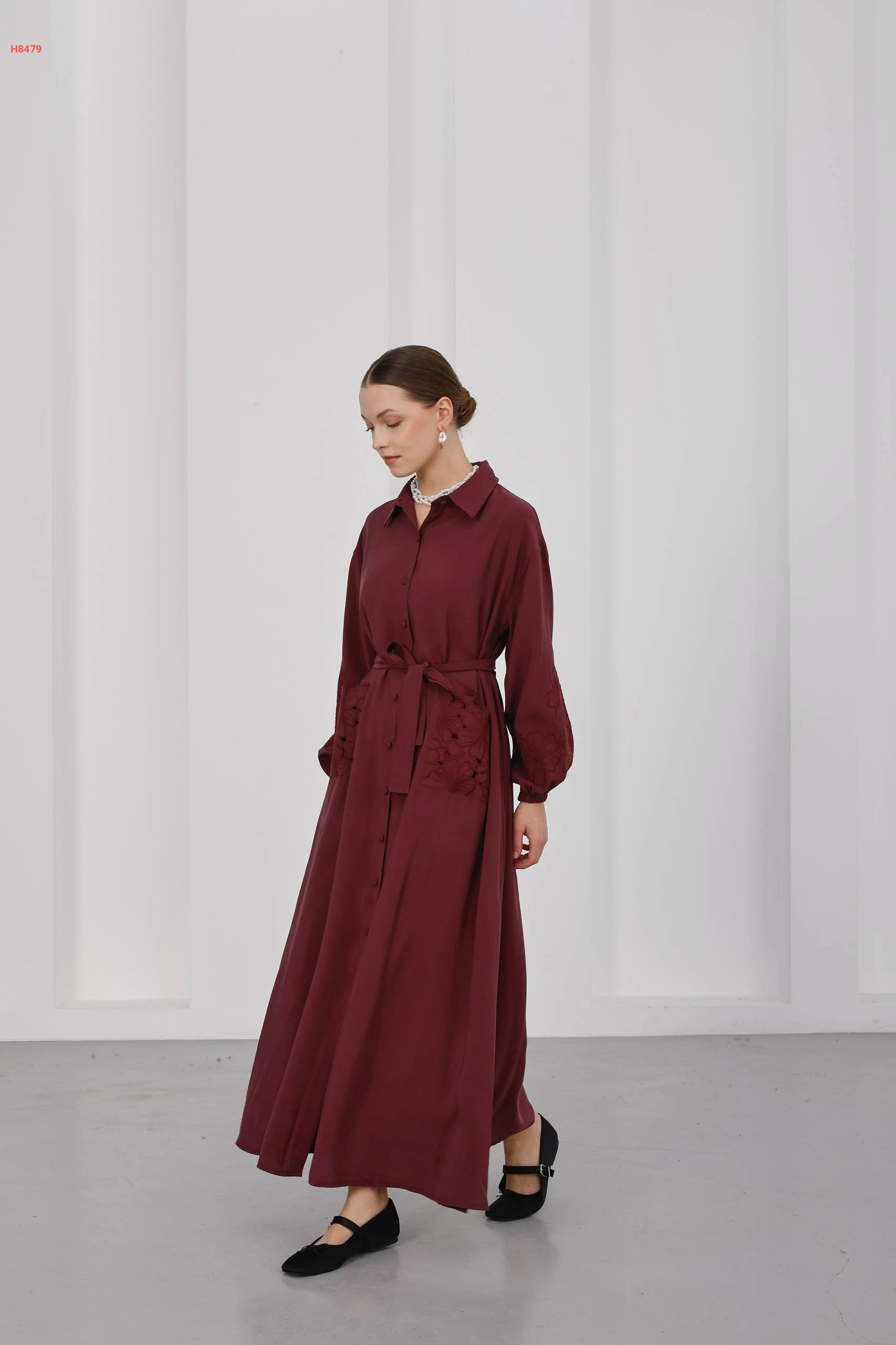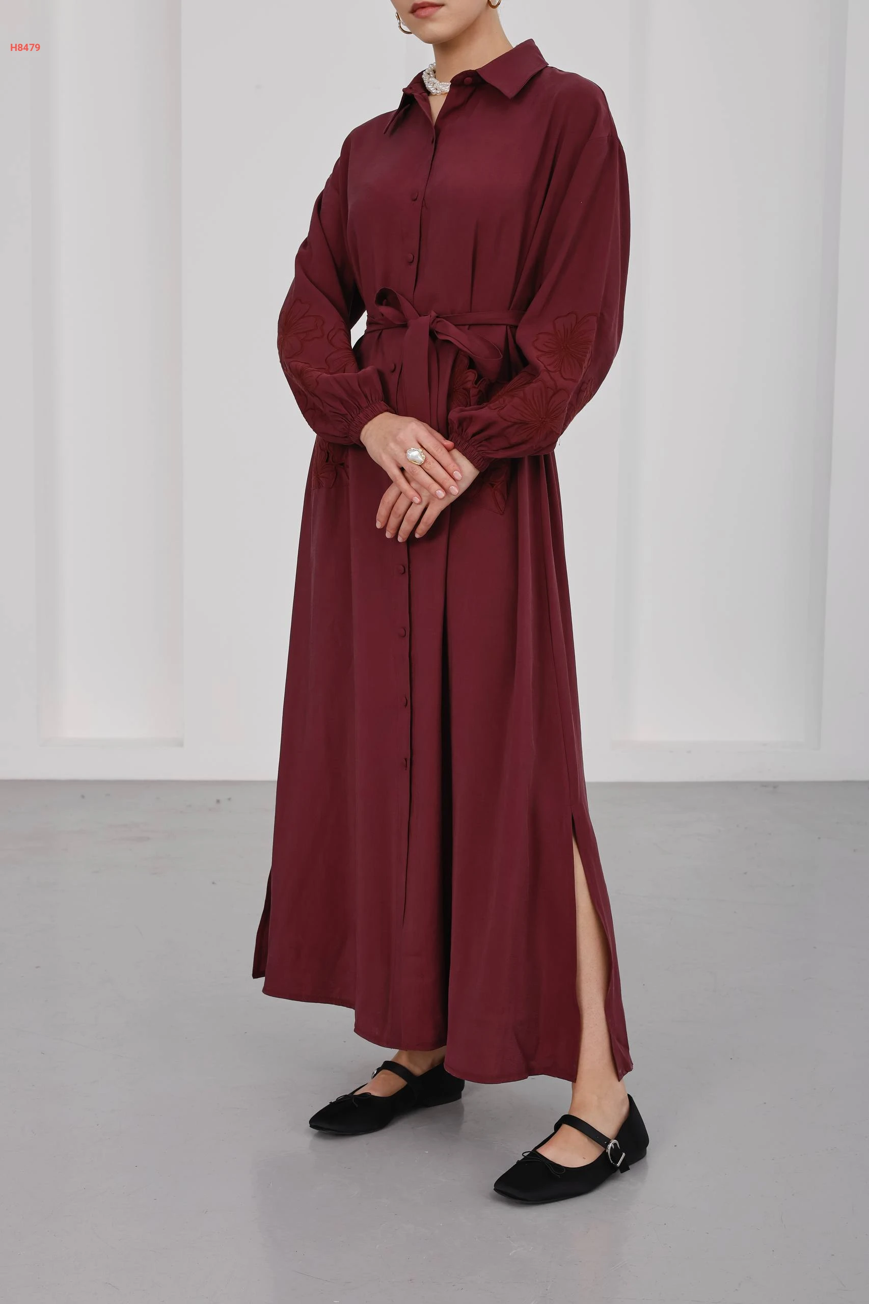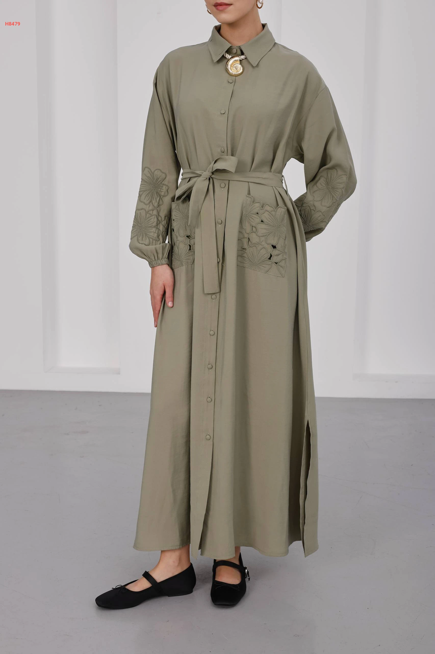 فستان سادة بأزرار مع جيب وأكمام مطرزة بالورود مع حزام