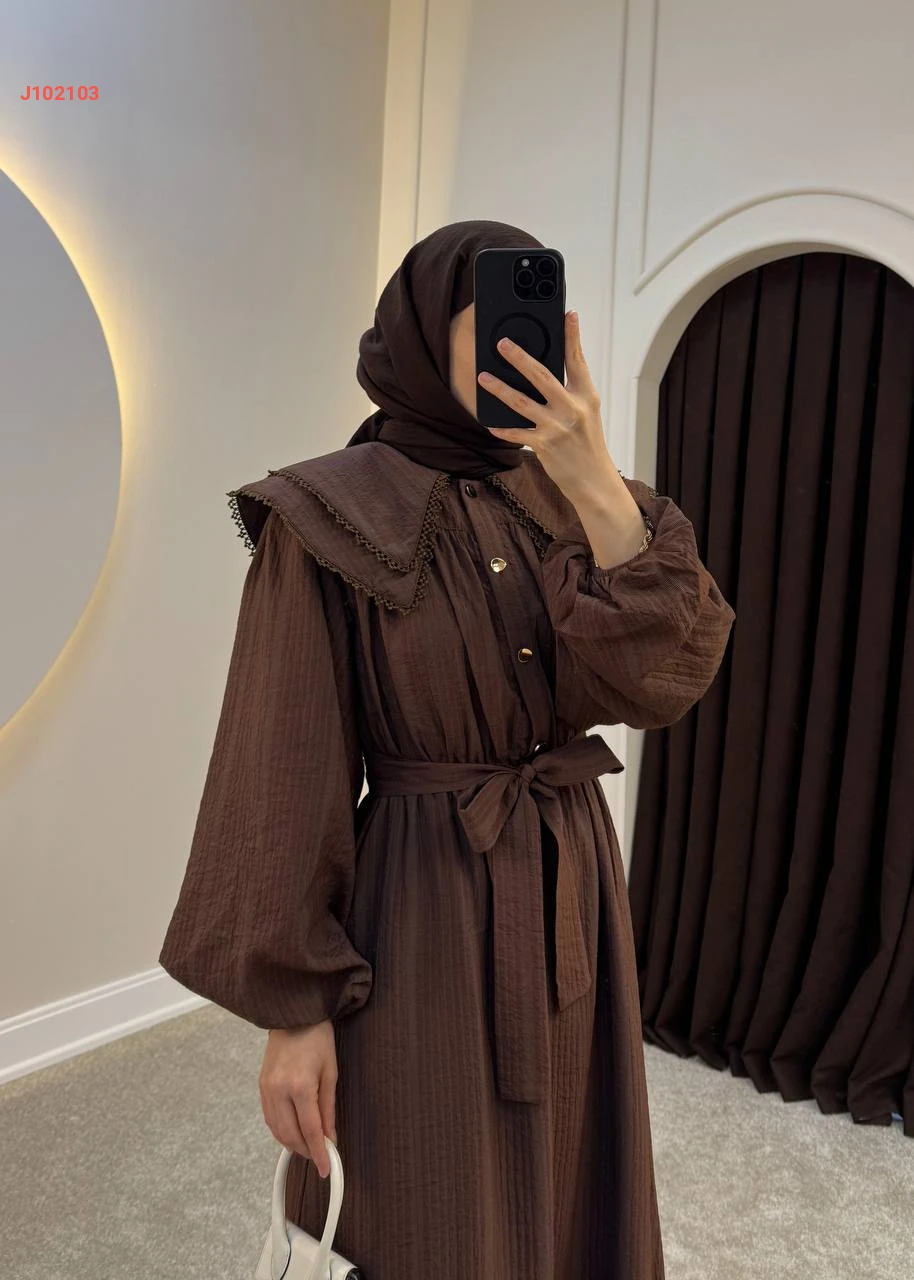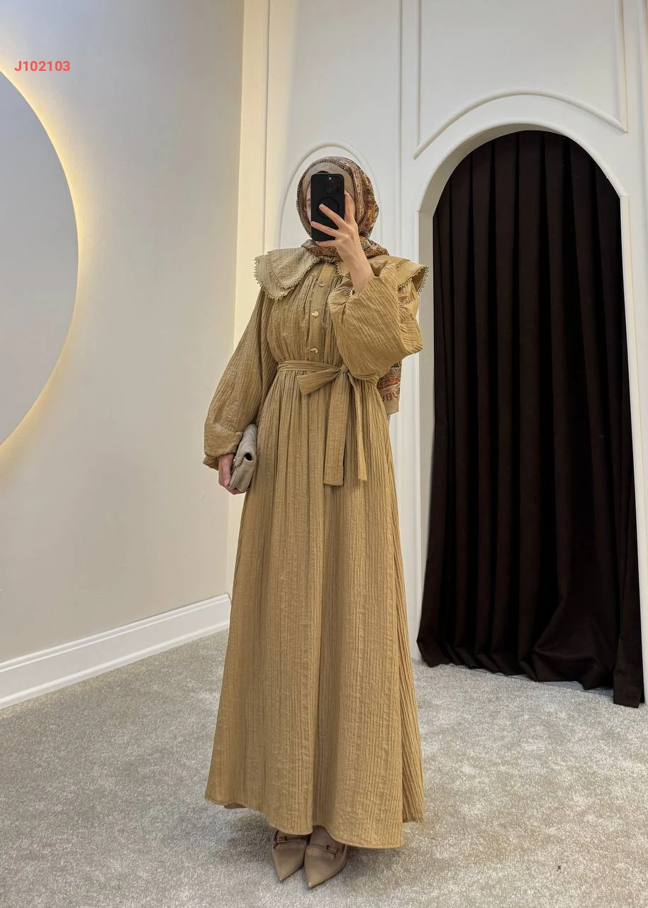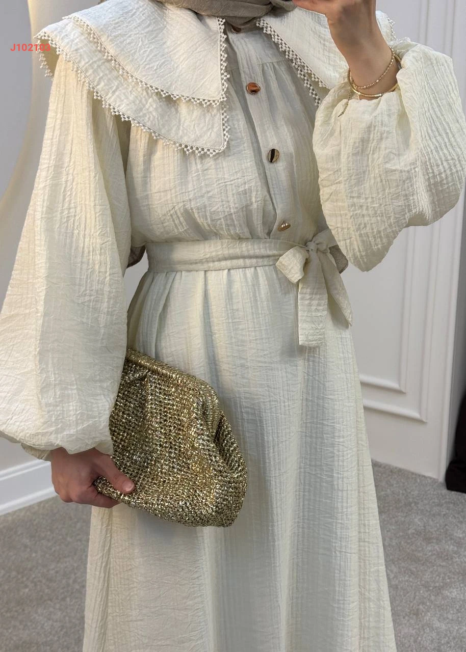 فستان سادة بأزرار عند الصدر مع حزام بياقة مطرزة طبقتين
