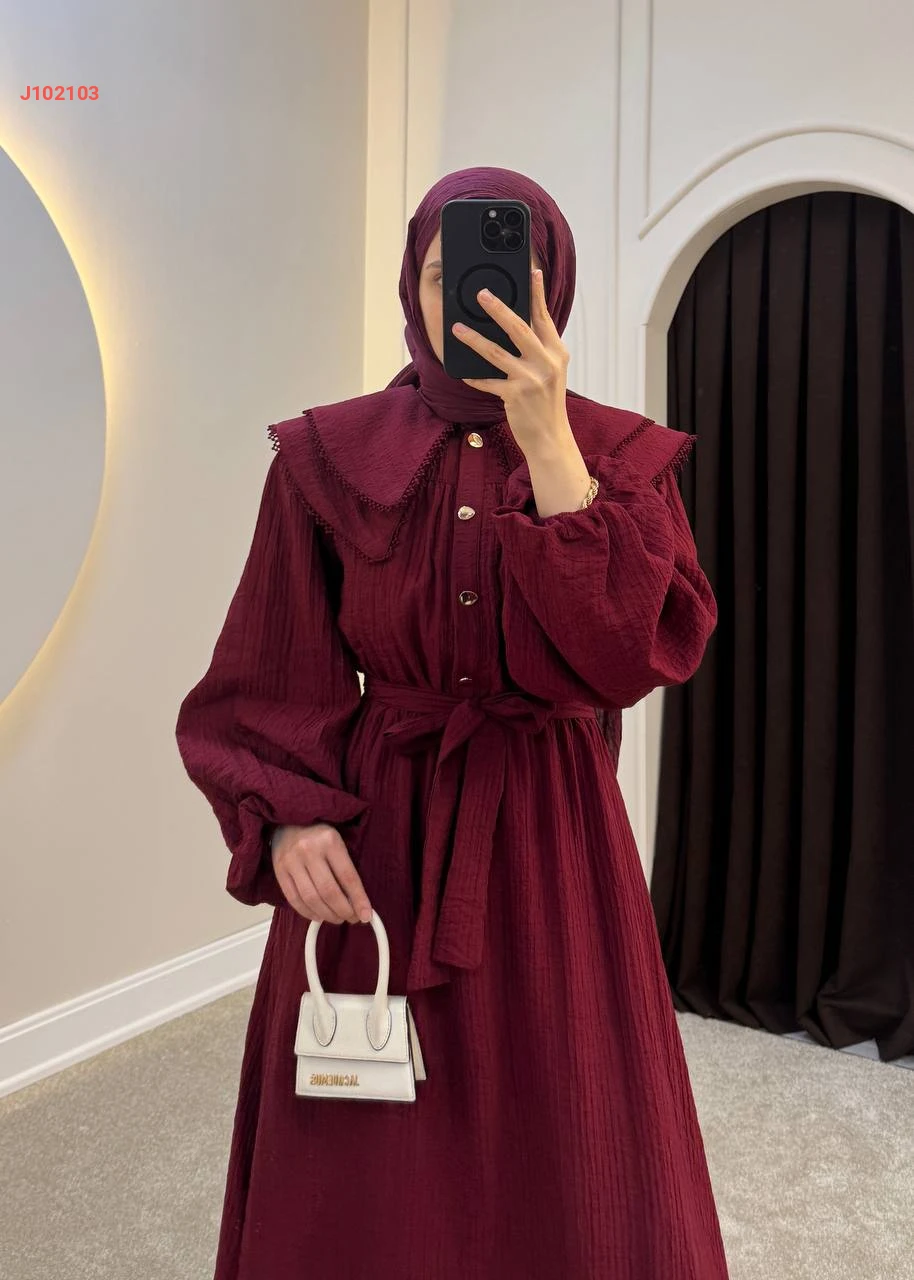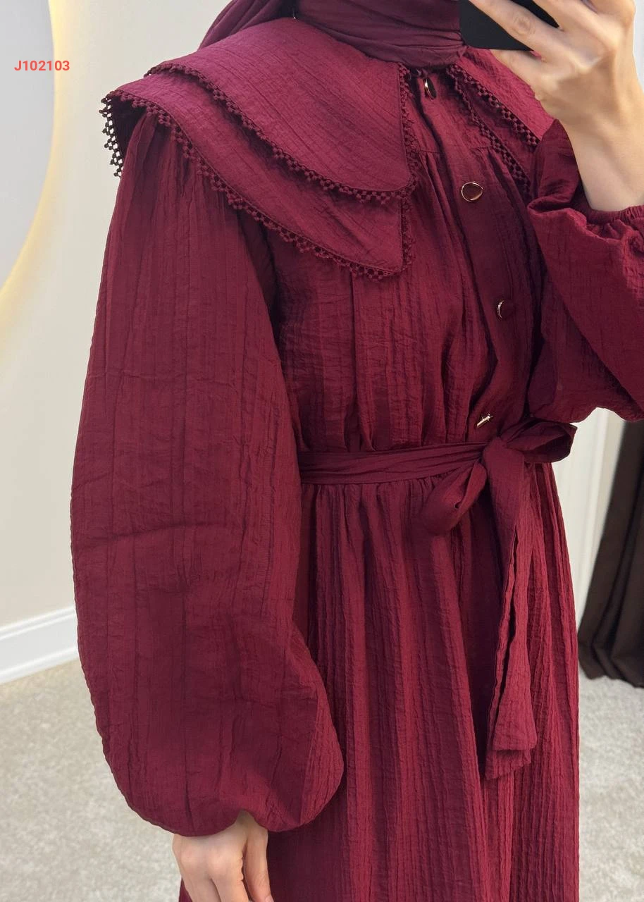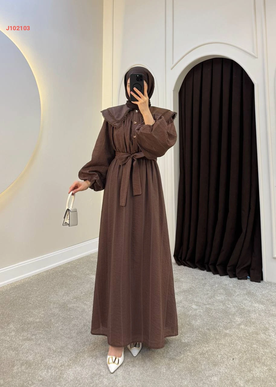 فستان سادة بأزرار عند الصدر مع حزام بياقة مطرزة طبقتين