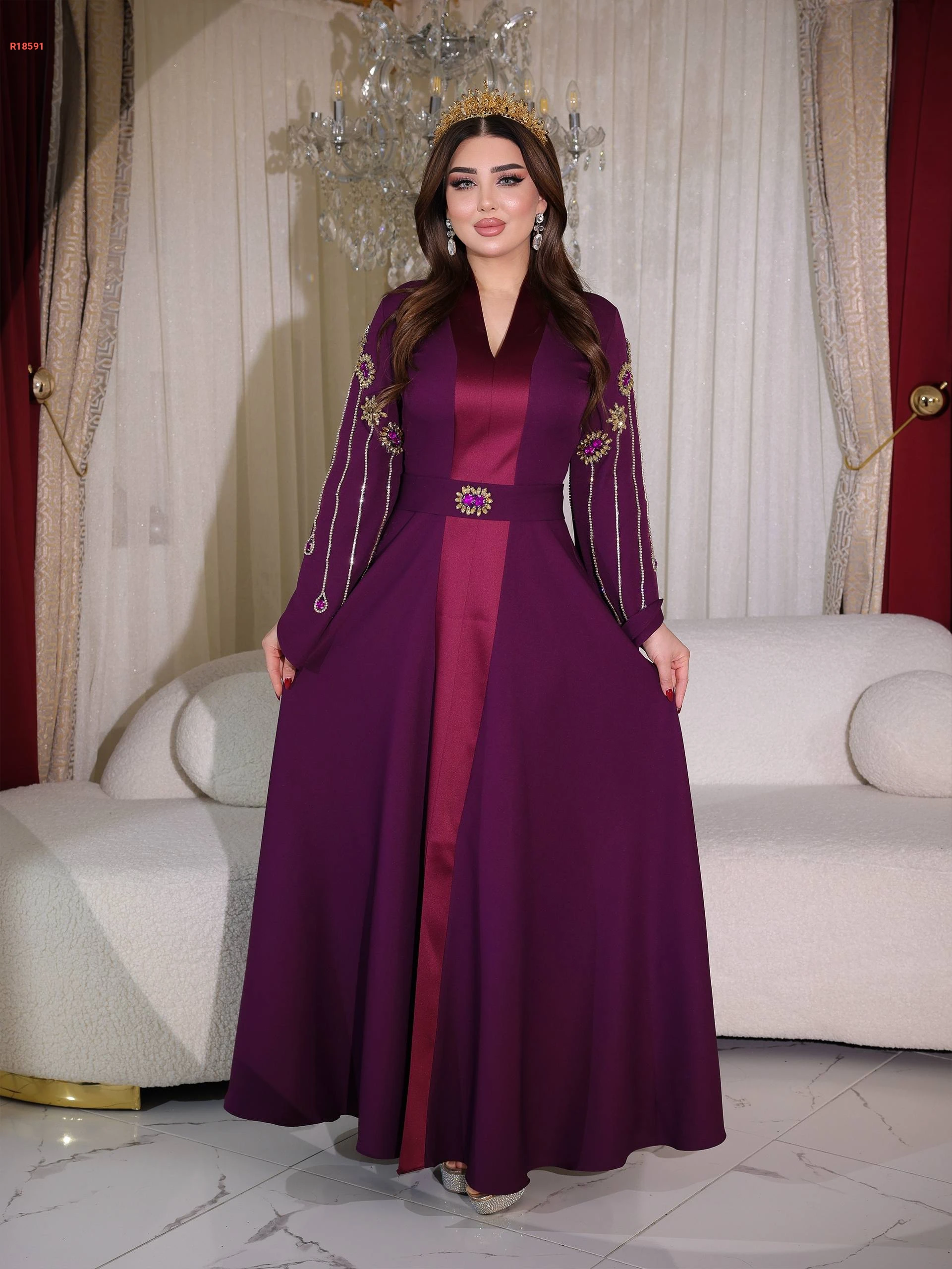 فستان سواريه سادة كم كلوش مع فتحة من الأمام بتطريز شك عند الأكمام مع حزام