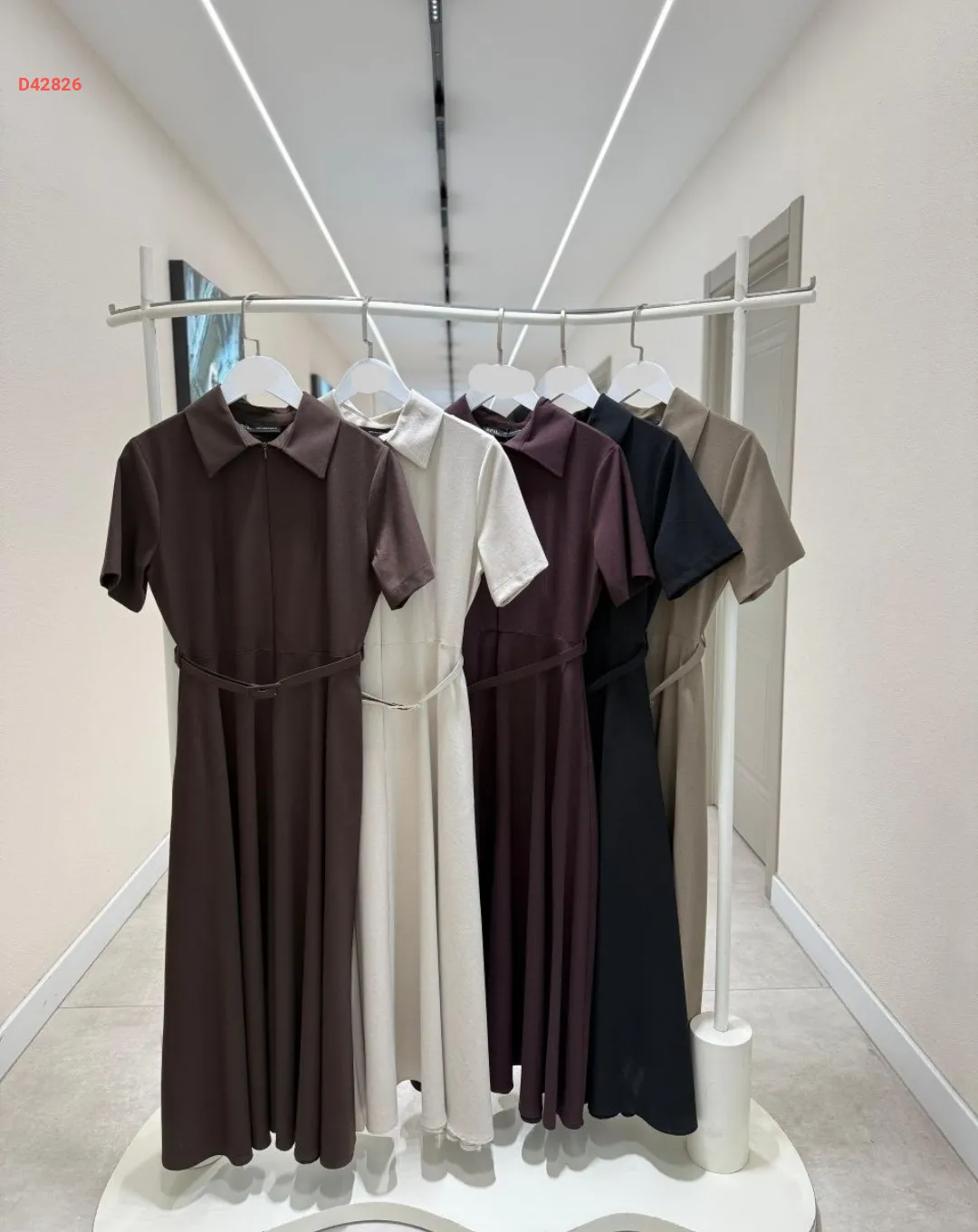فستان سادة طويل نصف كم ، بسحاب مخفي من الأمام ، بقبة قميص ، مع حزام