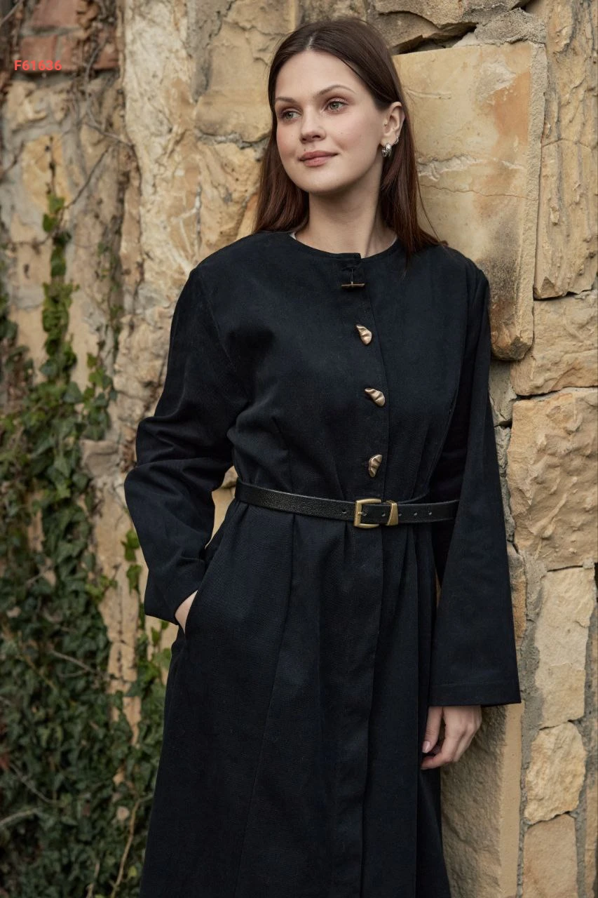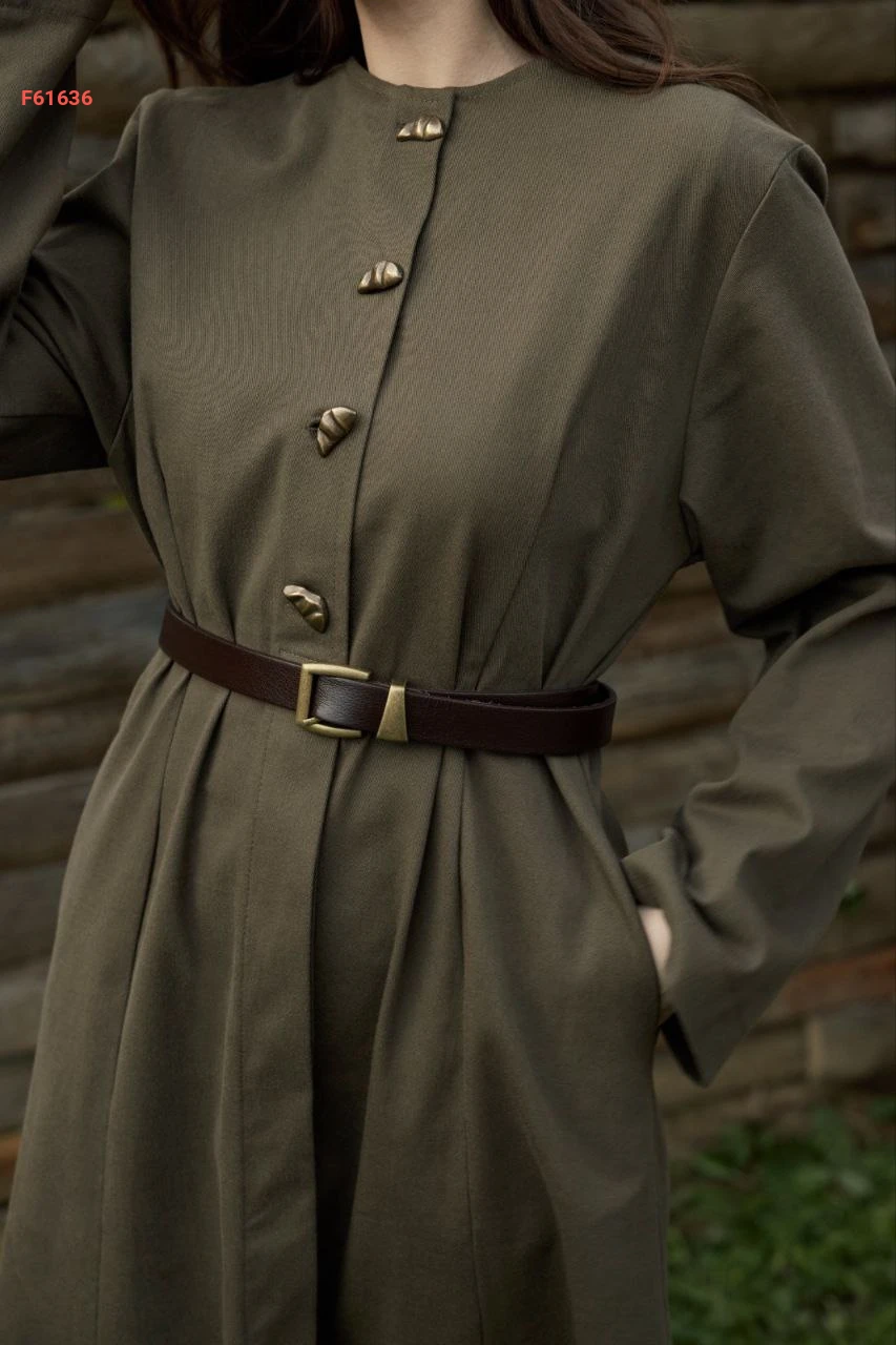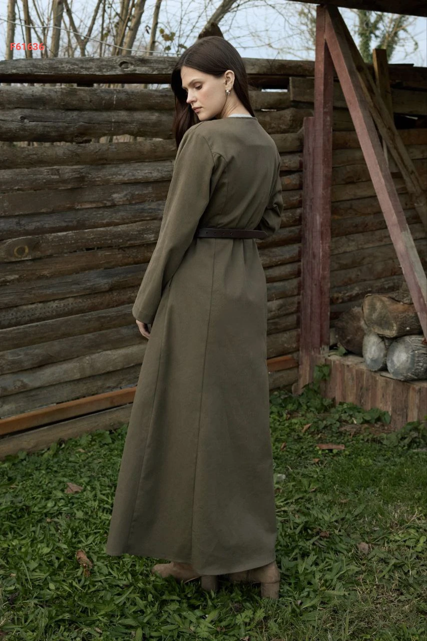 فستان طويل سادة بأزرار مع حزام وجيب
