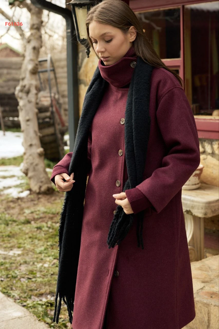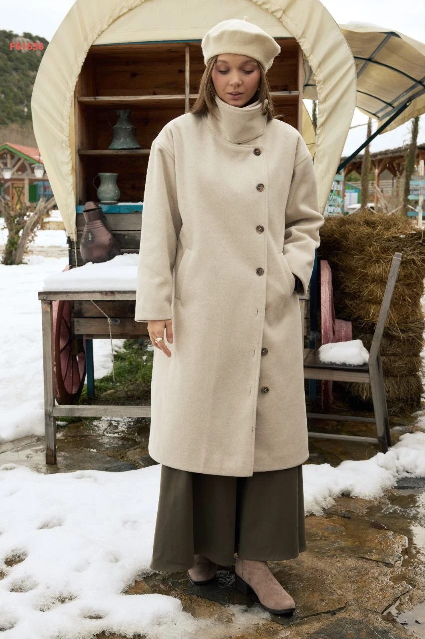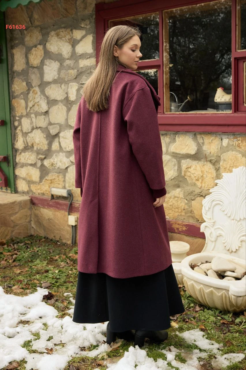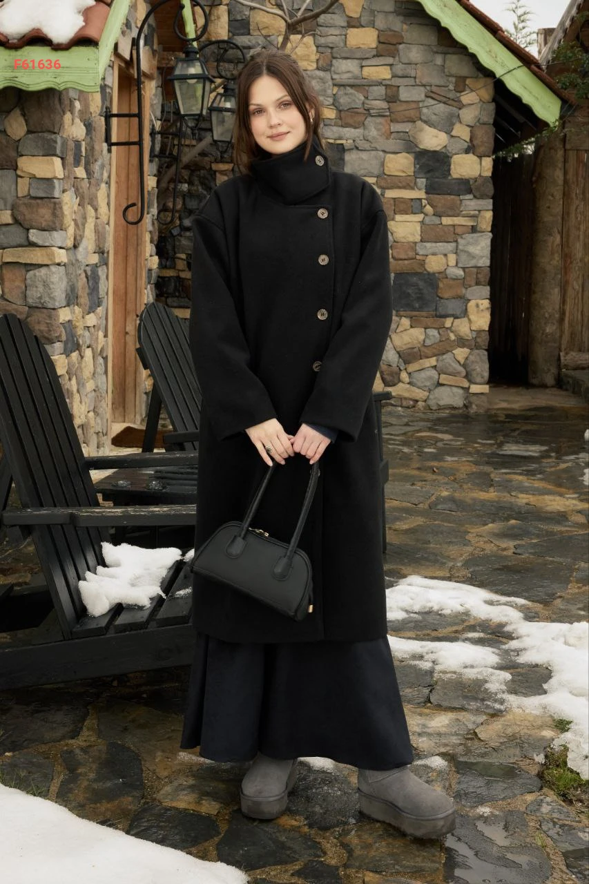 جاكيت جوخ طويل سادة بأزرار جانبية بياقة مرتفعة مع جيب