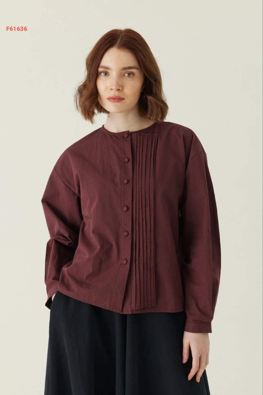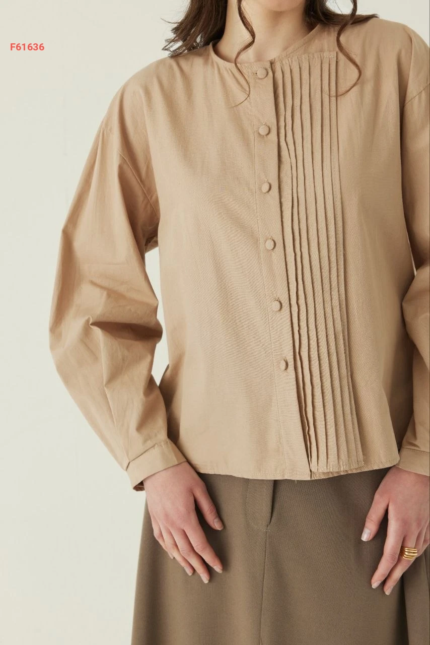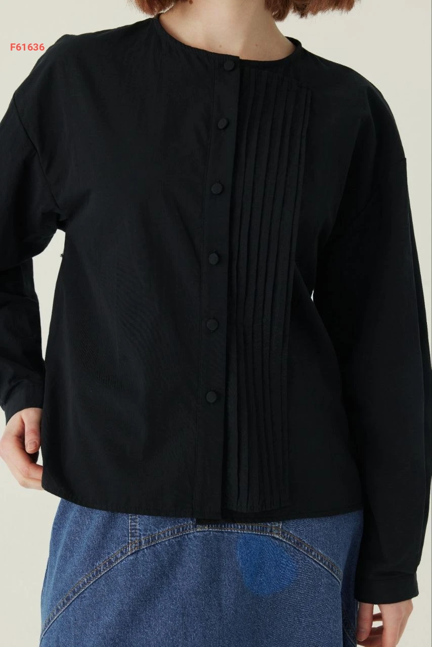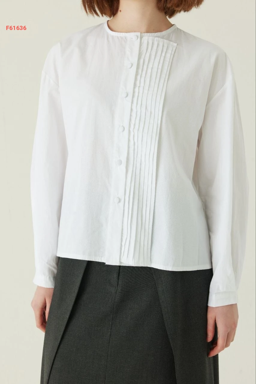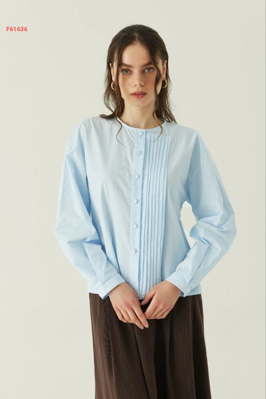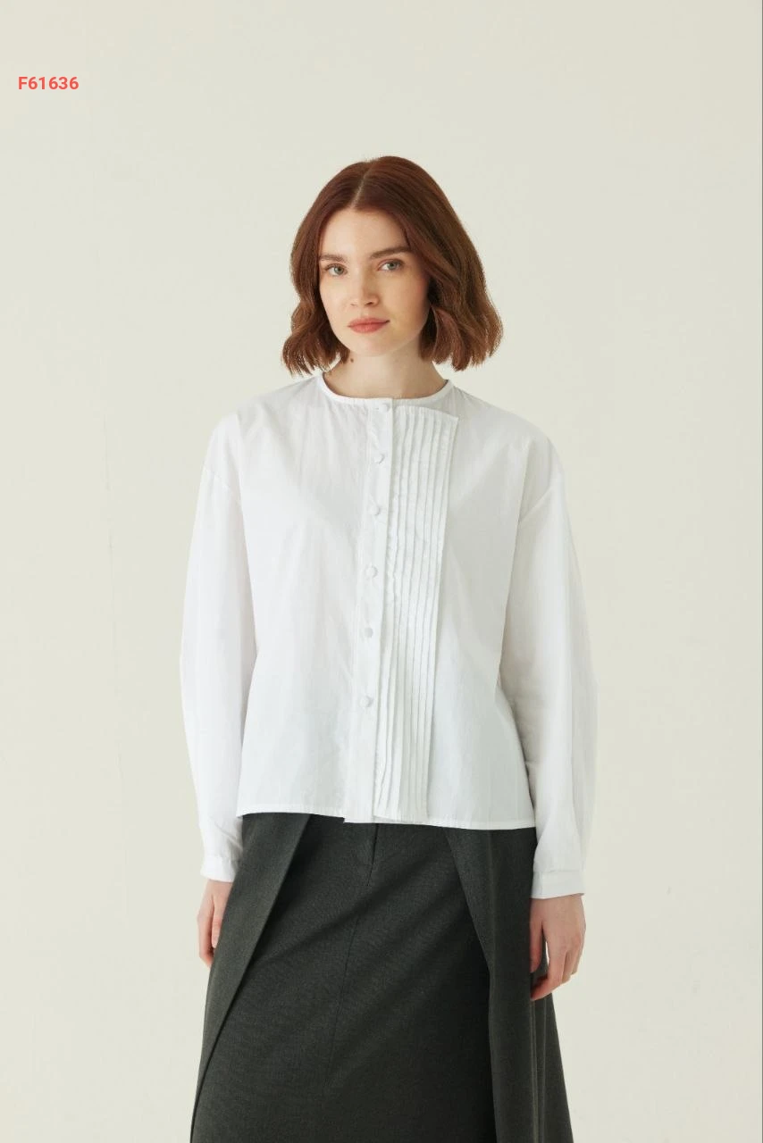 قميص سادة بأزرار كسرات ناعمة جانبية، ياقة دائرية