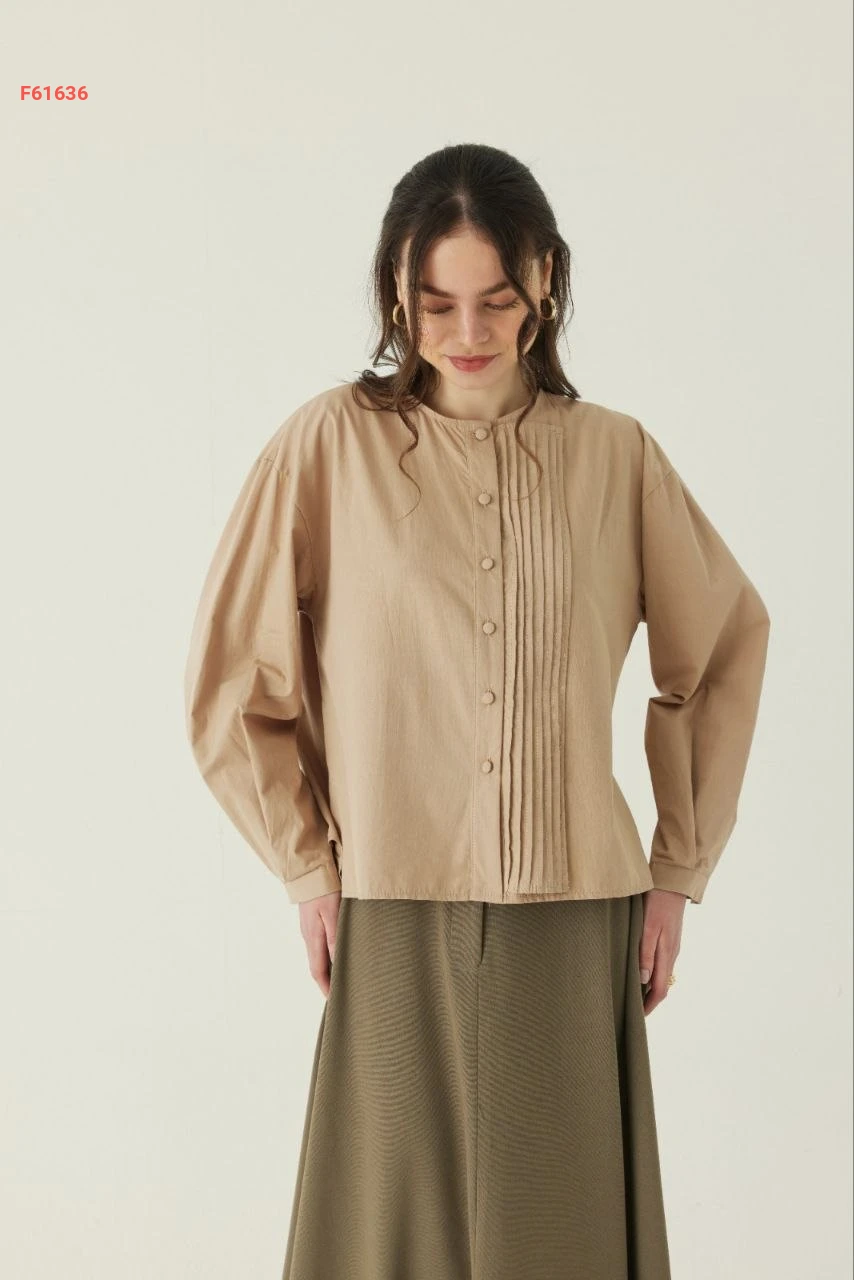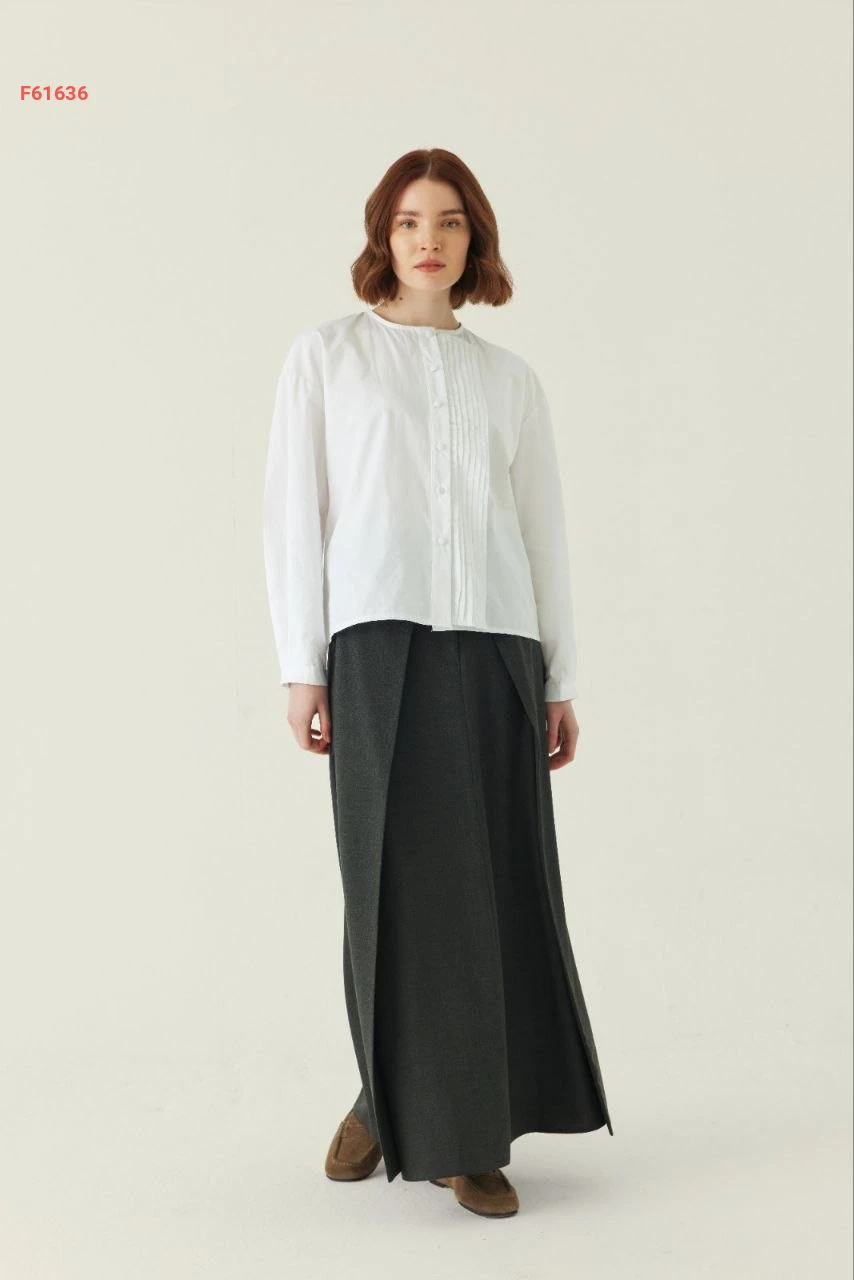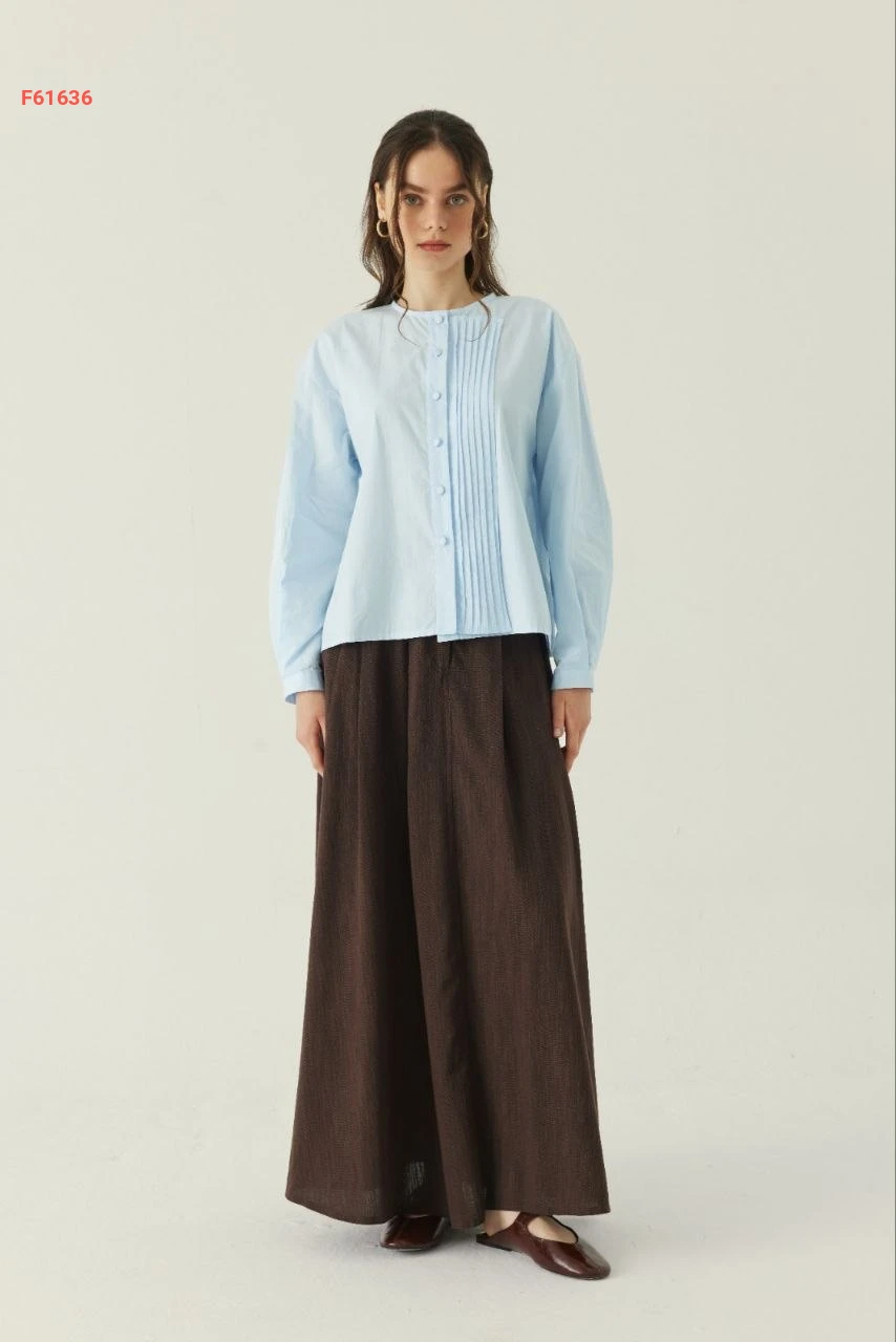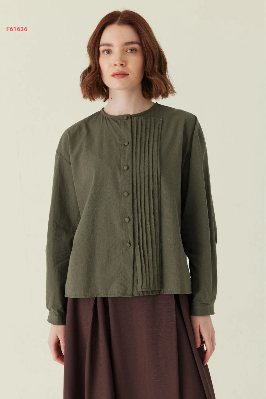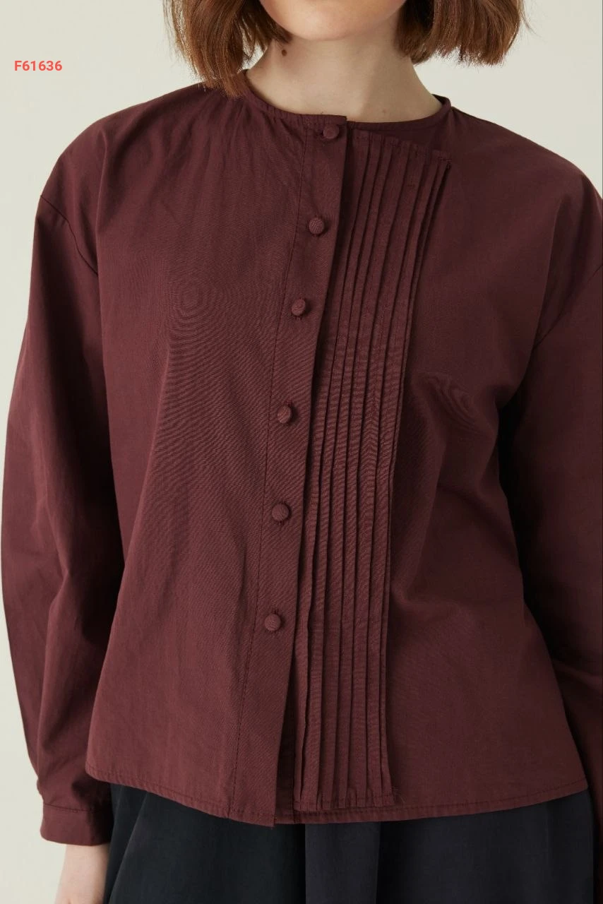 قميص سادة بأزرار كسرات ناعمة جانبية، ياقة دائرية