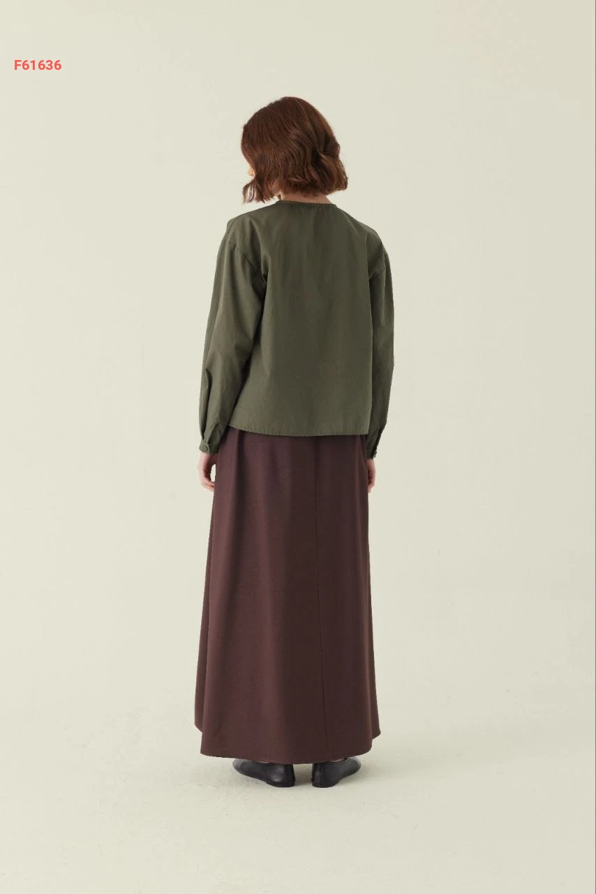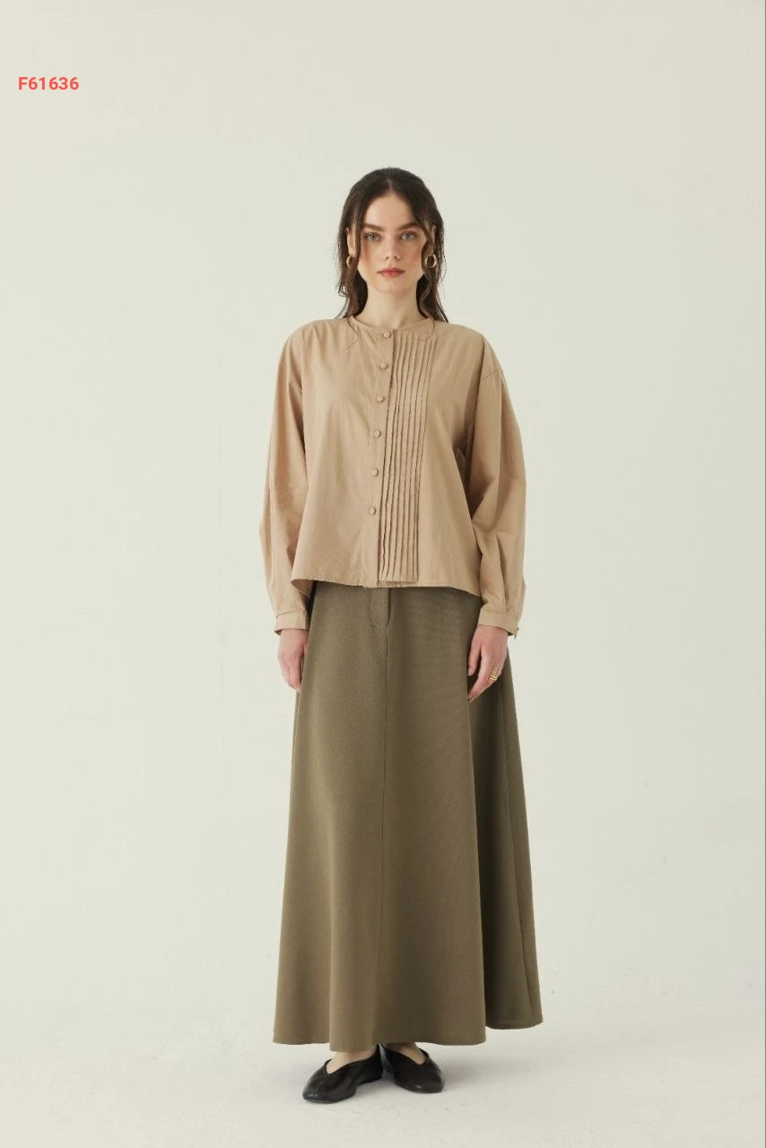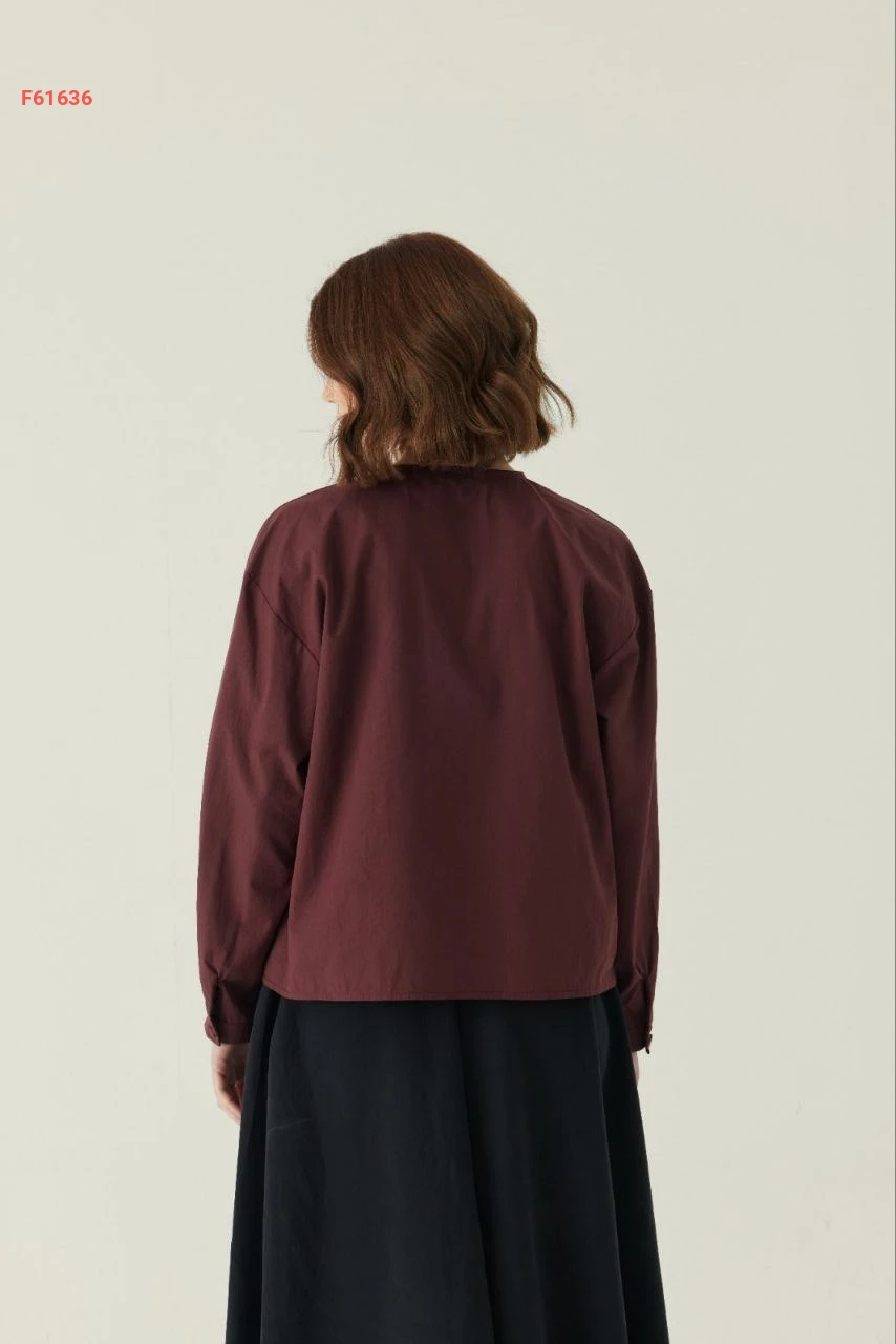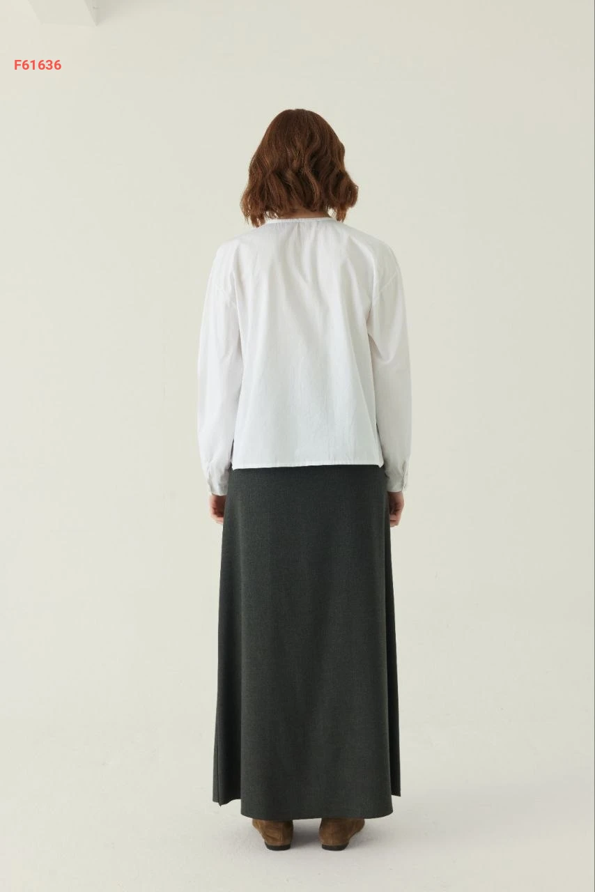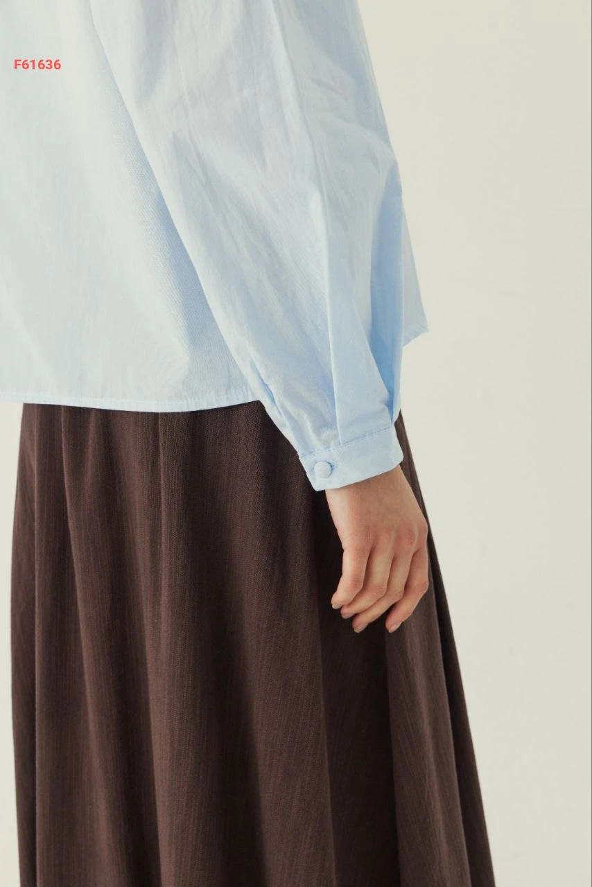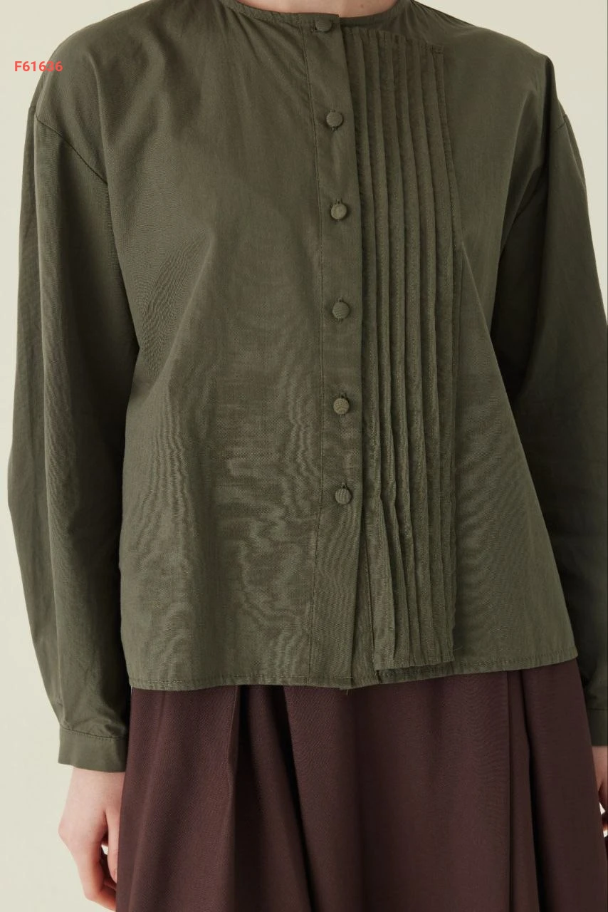 قميص سادة بأزرار كسرات ناعمة جانبية، ياقة دائرية