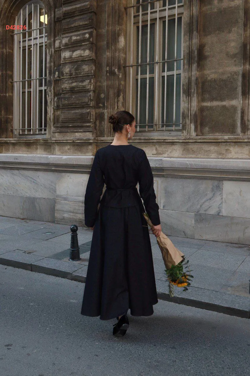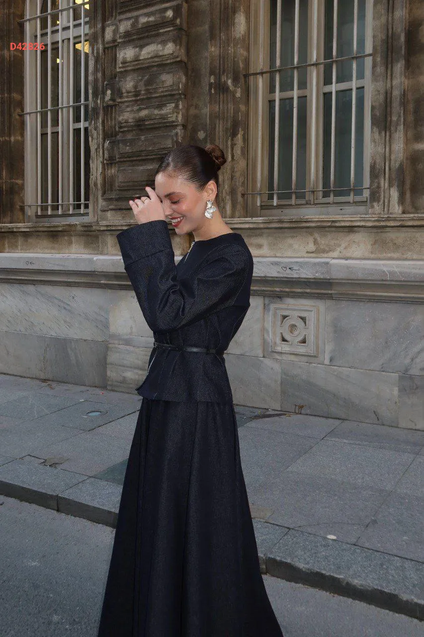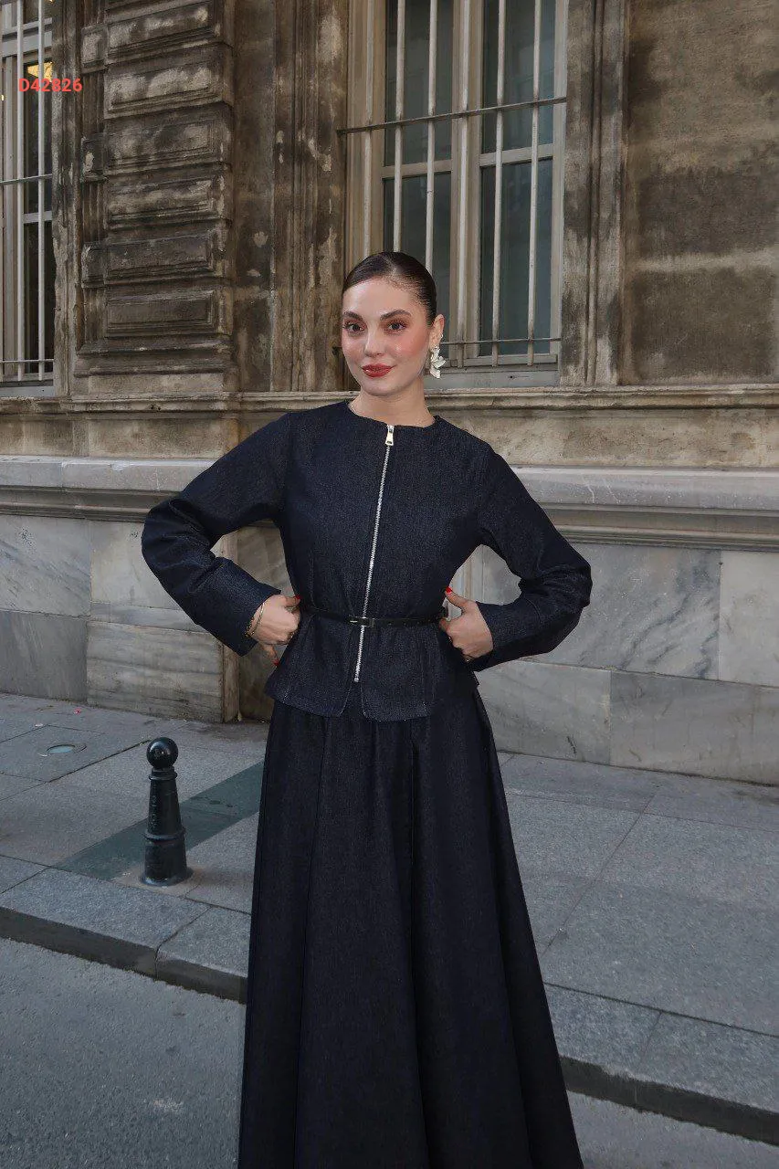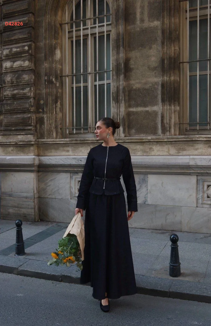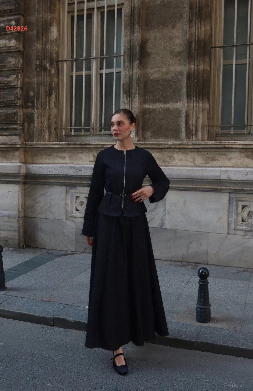 طقم تنورة سادة قطعتين ، بسحاب مع حزام