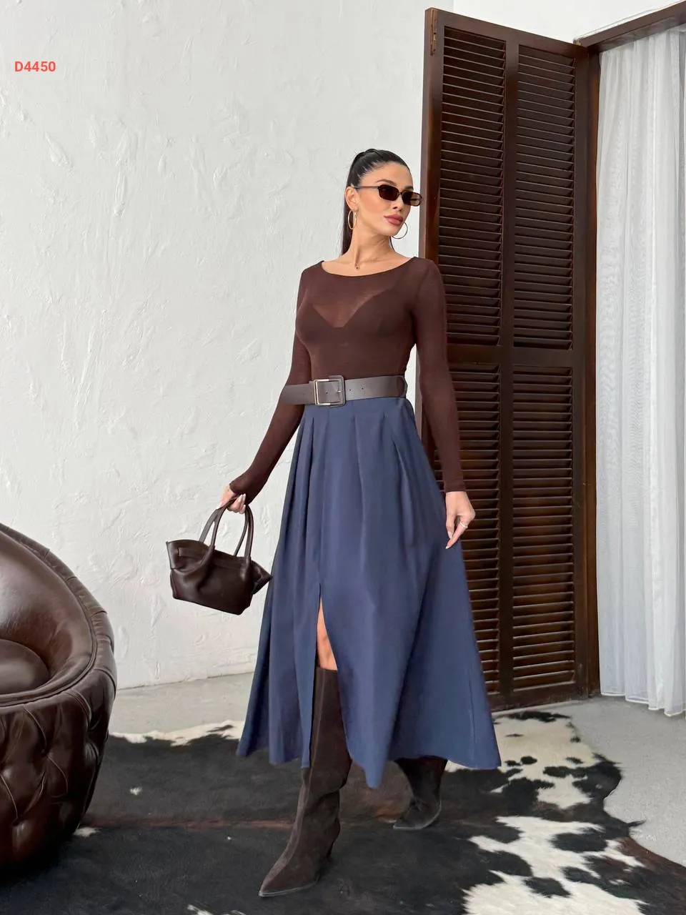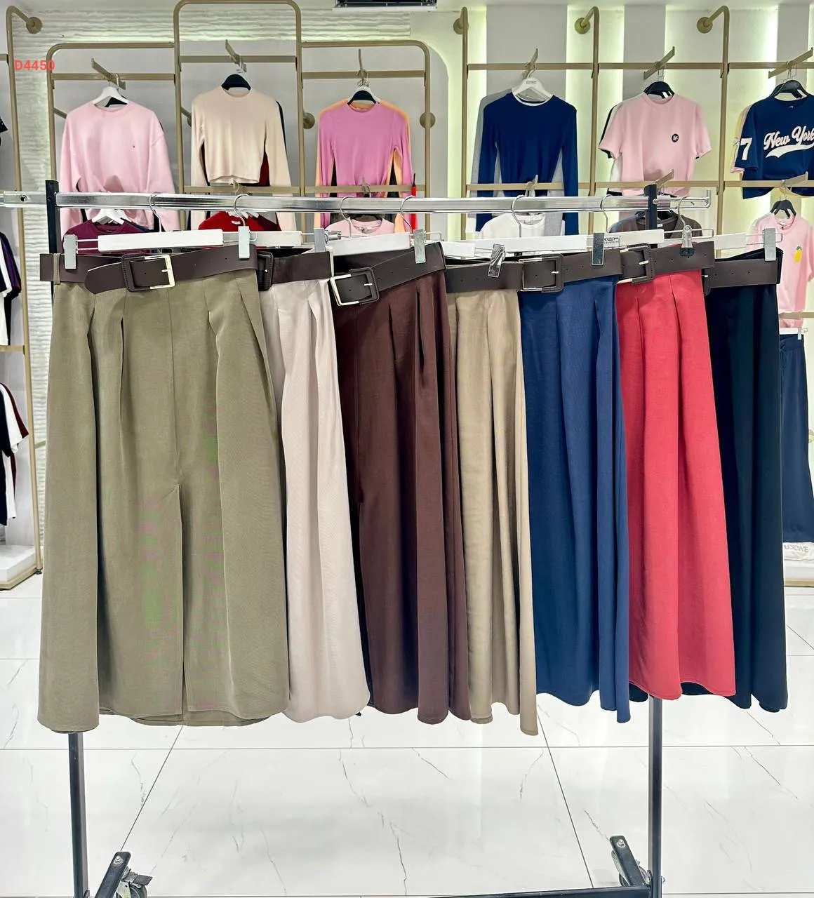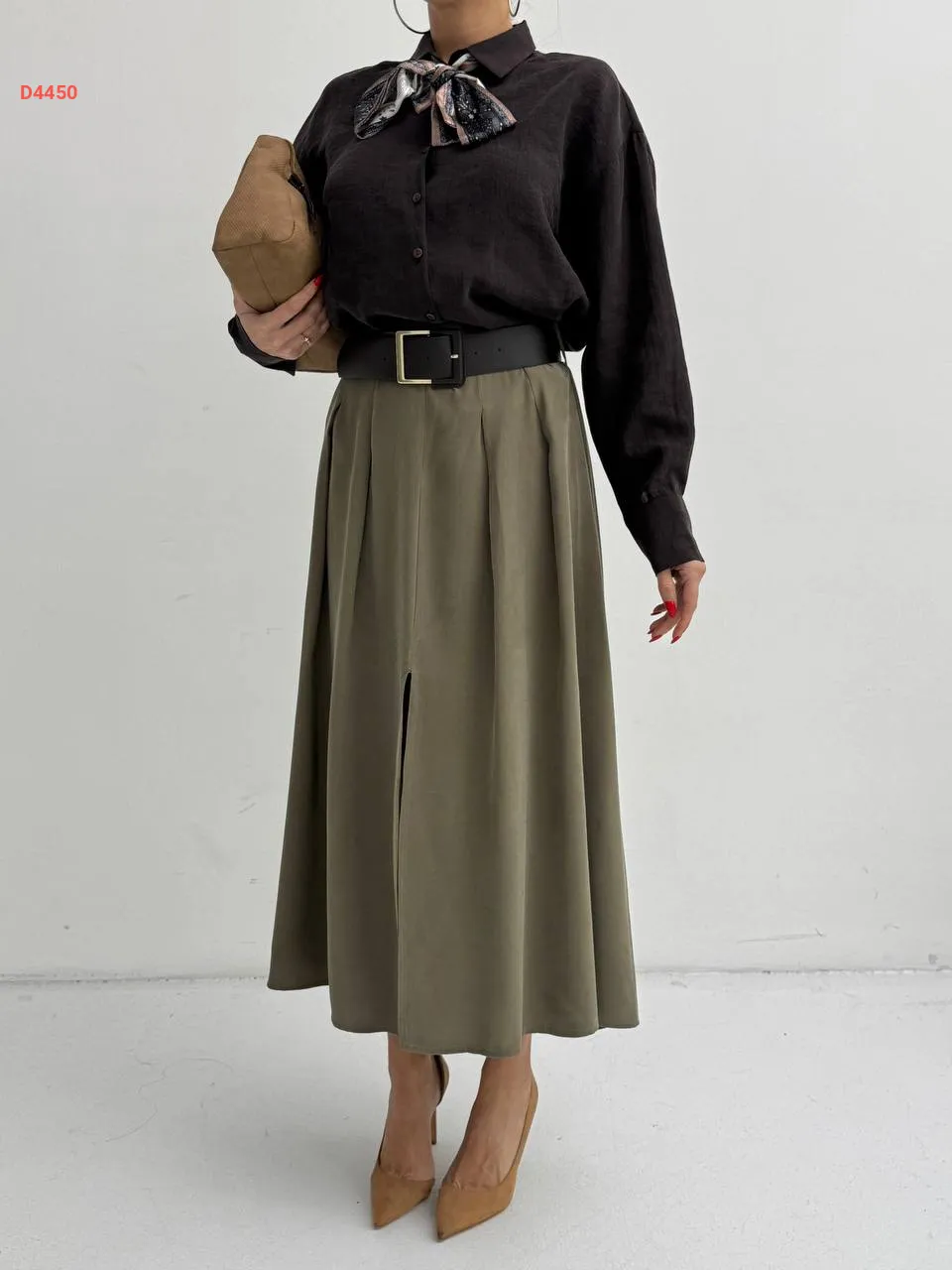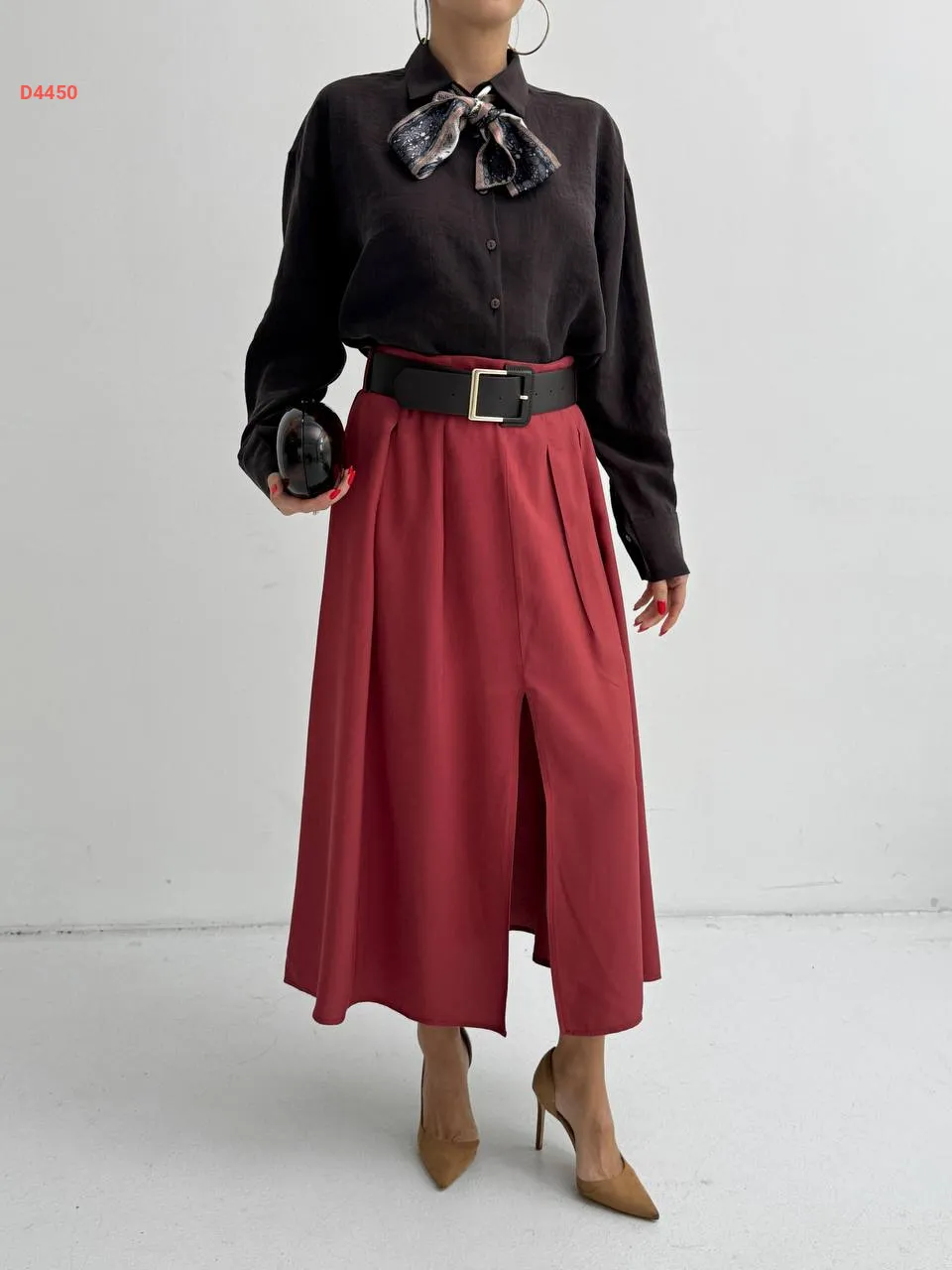 تنورة سادة بكسرات بفتحة من الأمام مع حزام
