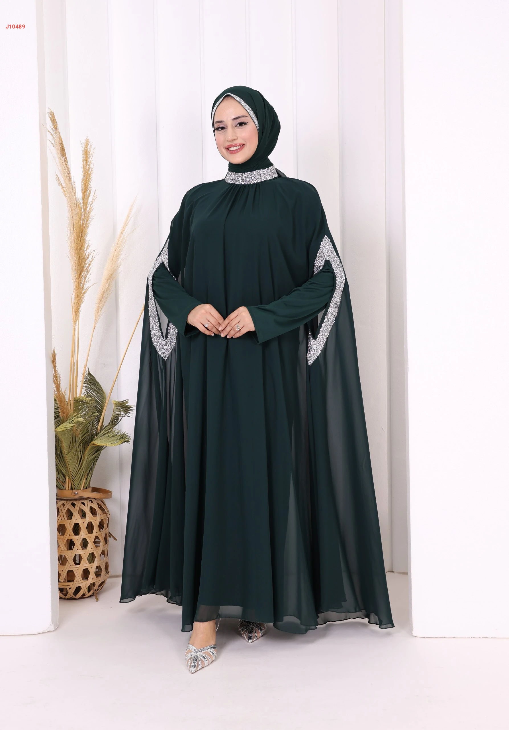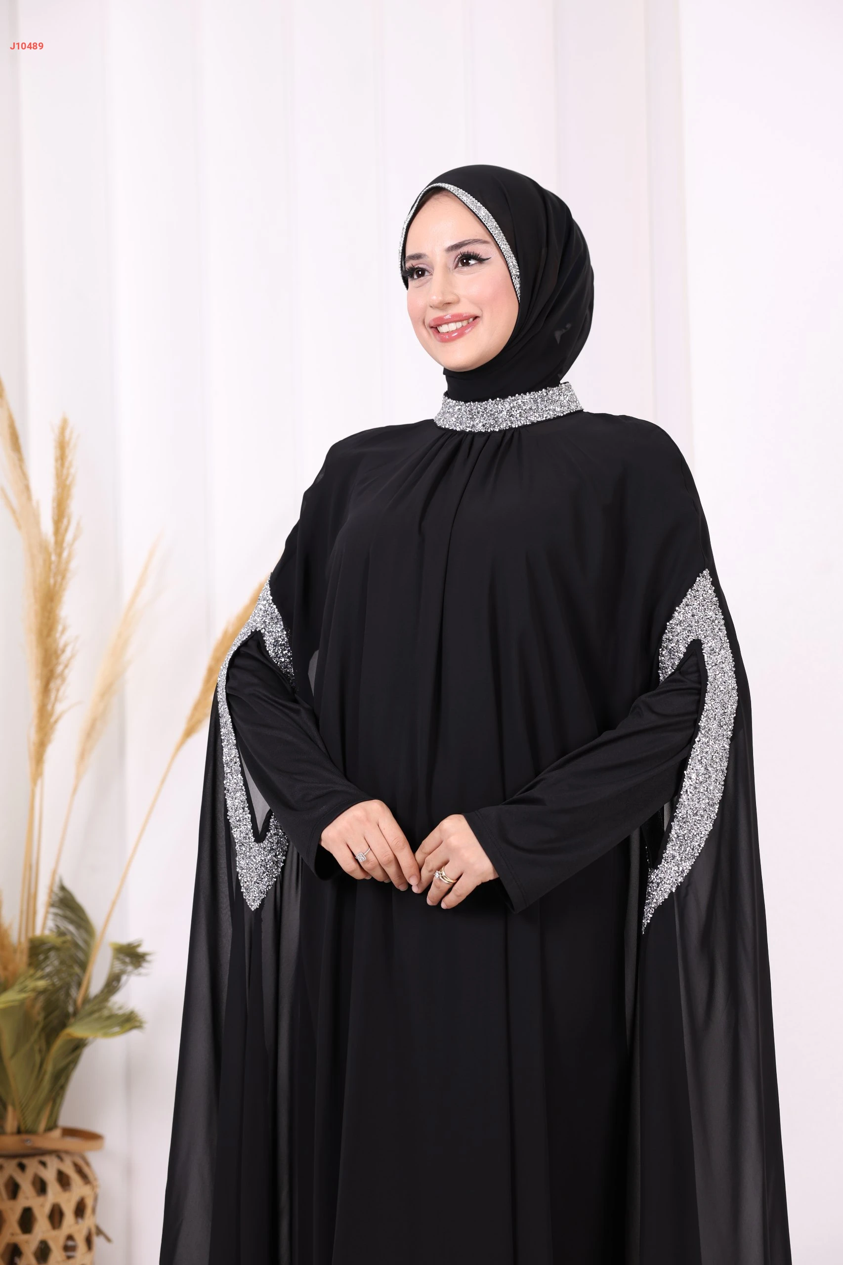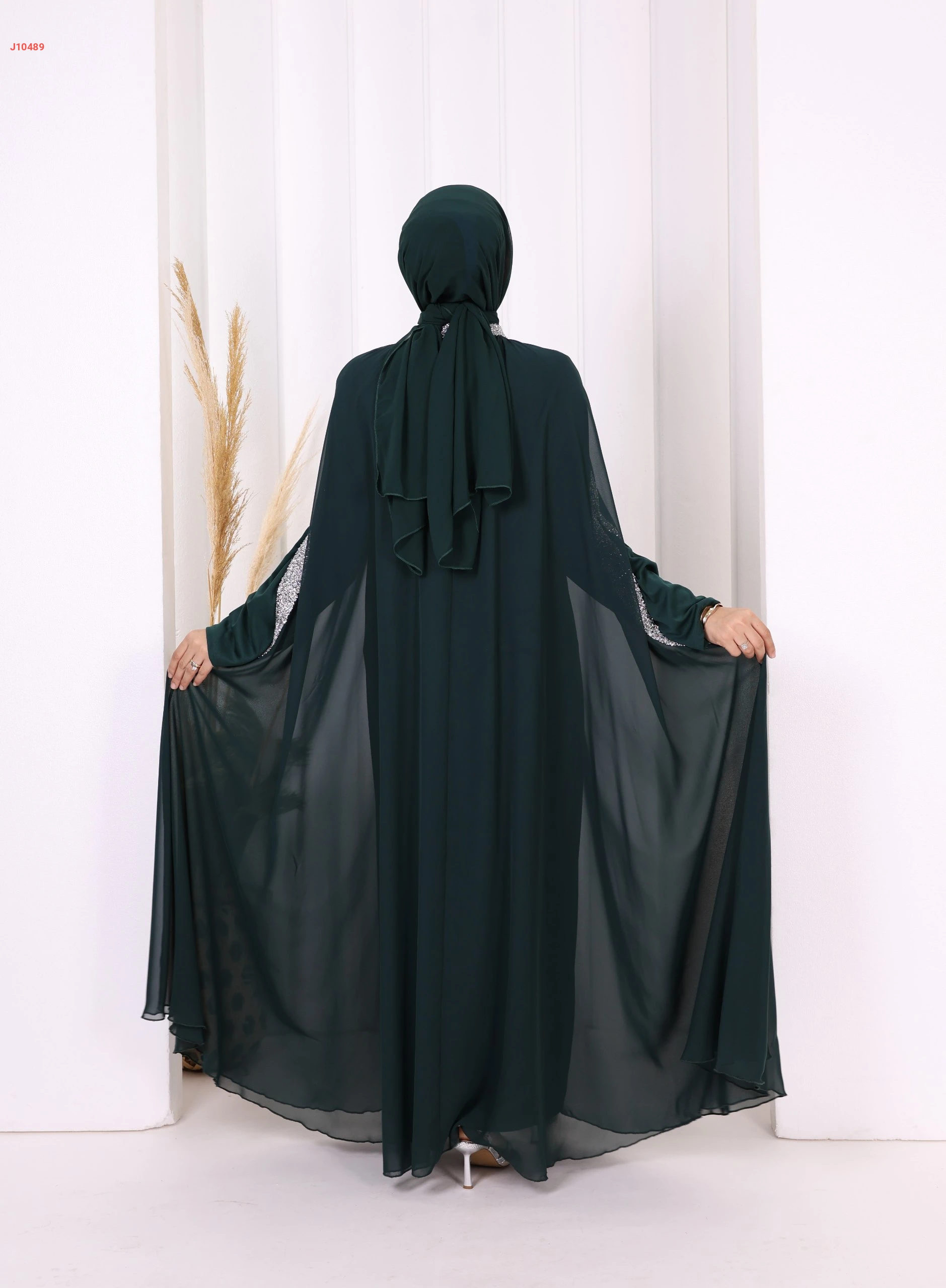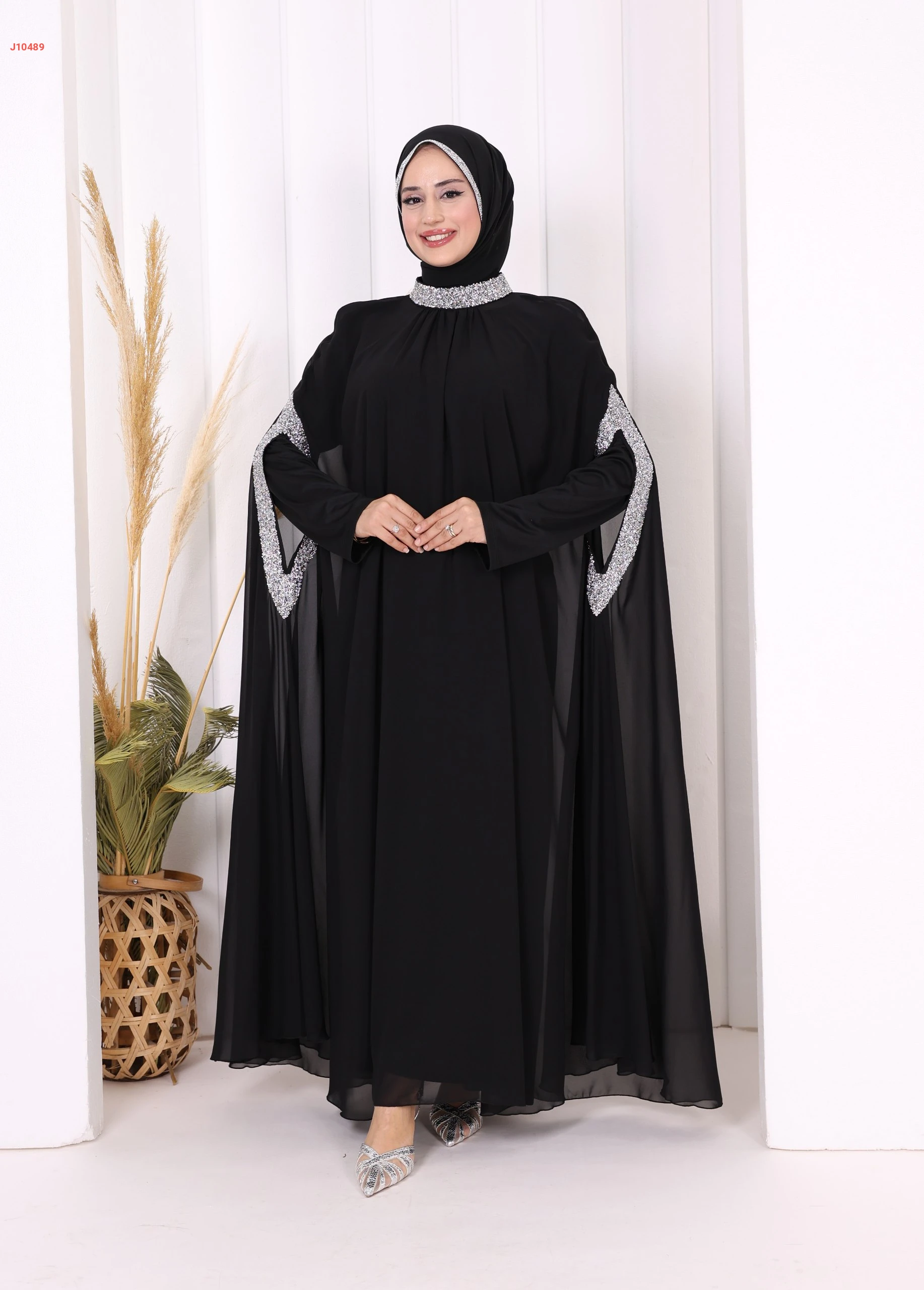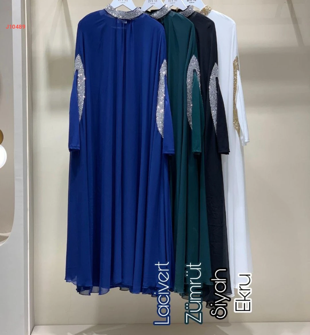 عباية سادة طبقتين پياقة مرتفعة وأكمام مرصعة بالشك