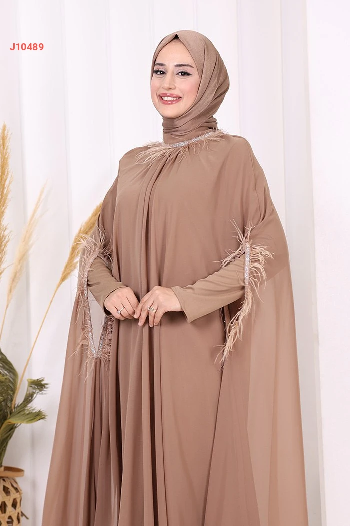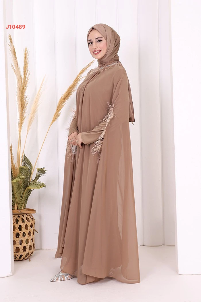 عباية سادة طبقتين بياقة مرتفعة واكمام مزينة بالريش الألماس