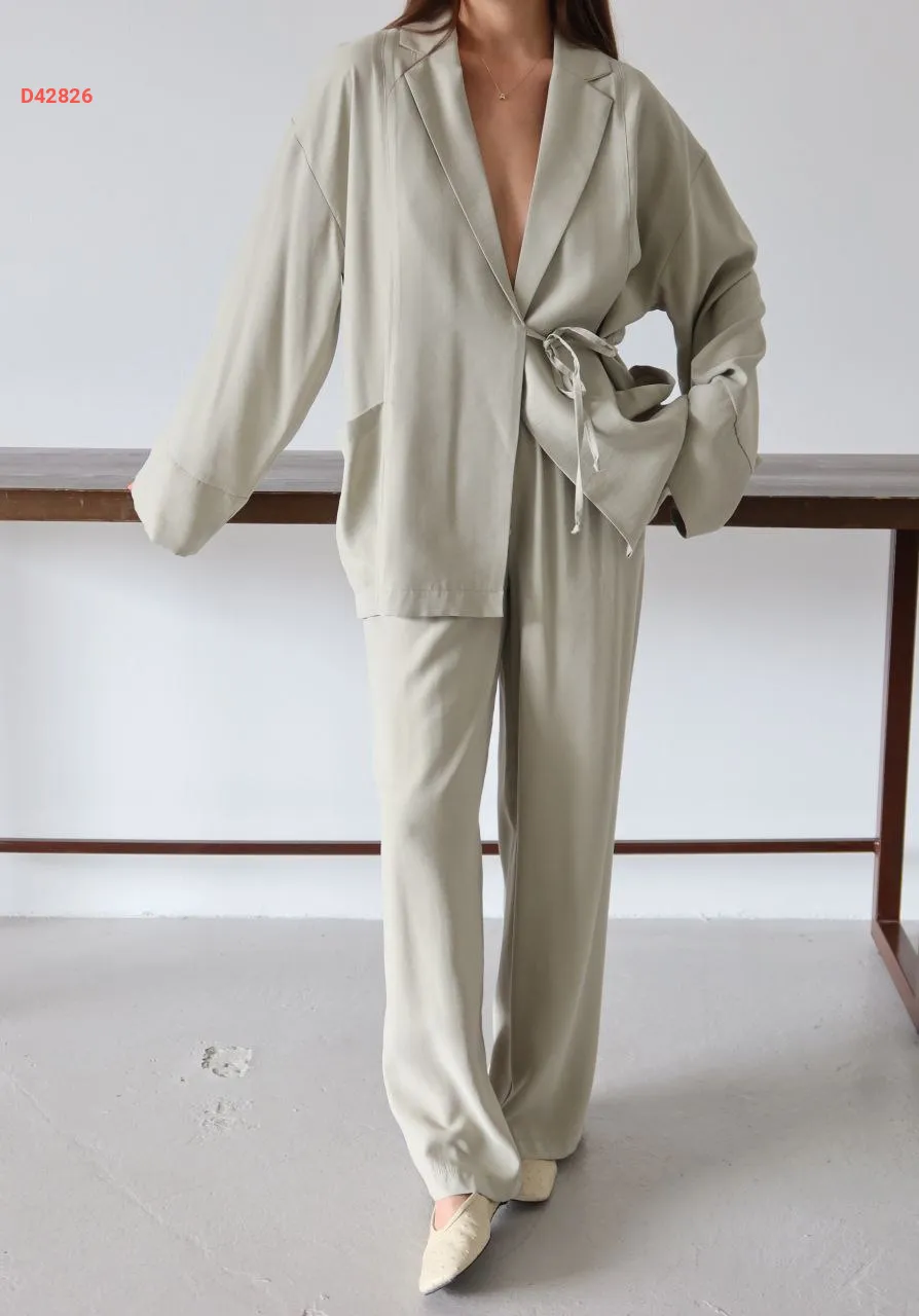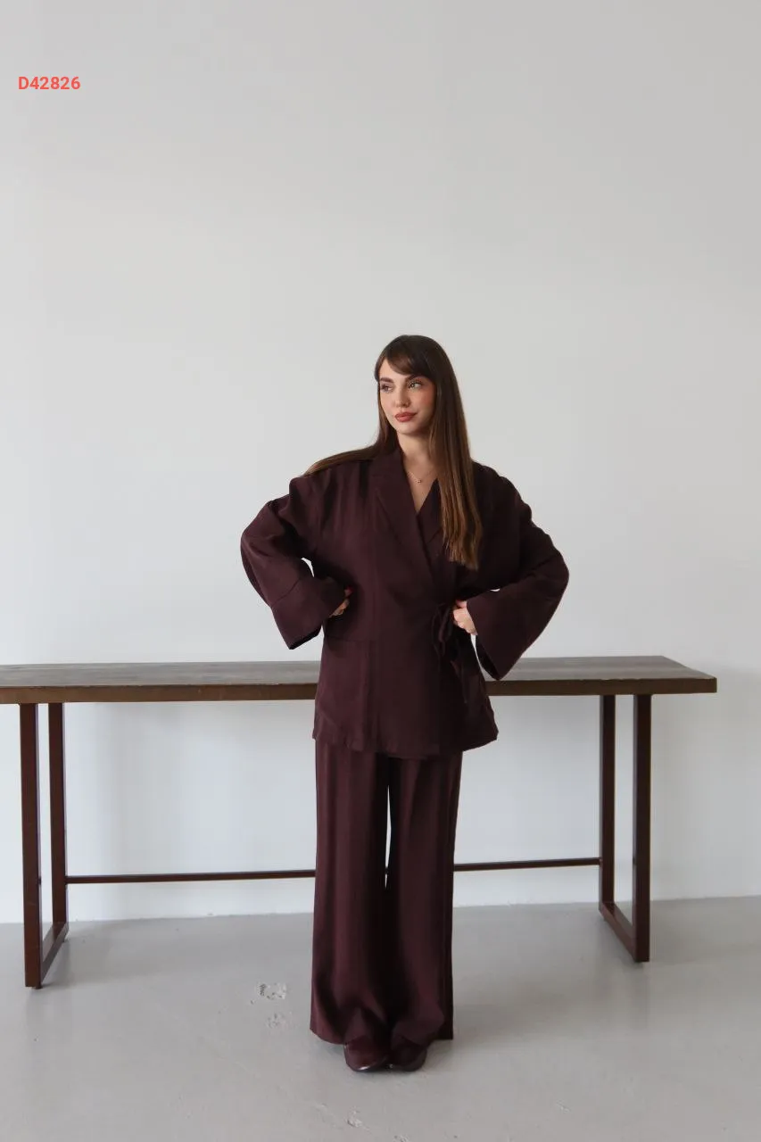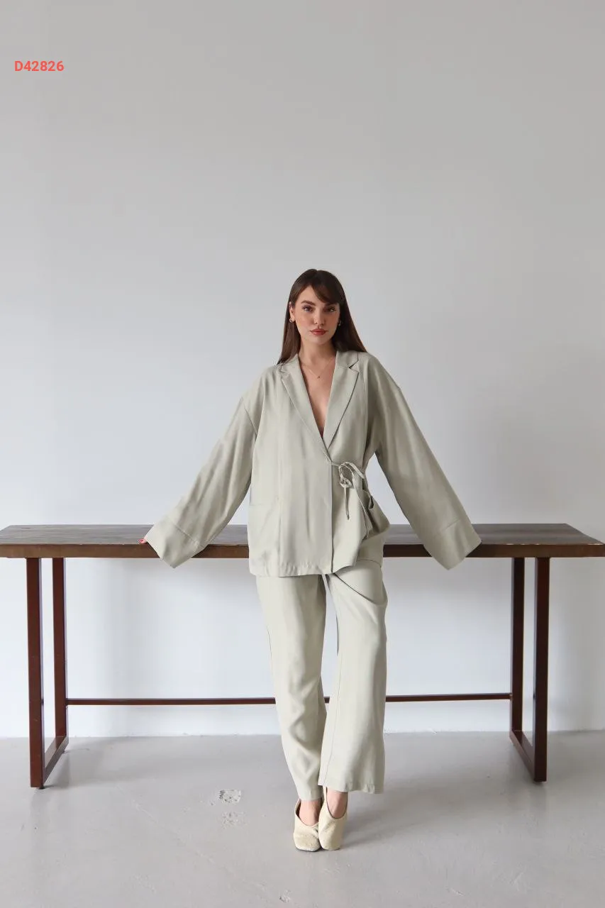 طقم بنطال سادة موديل عريض، وجيب عريضة مع ربطة خصر جانبية