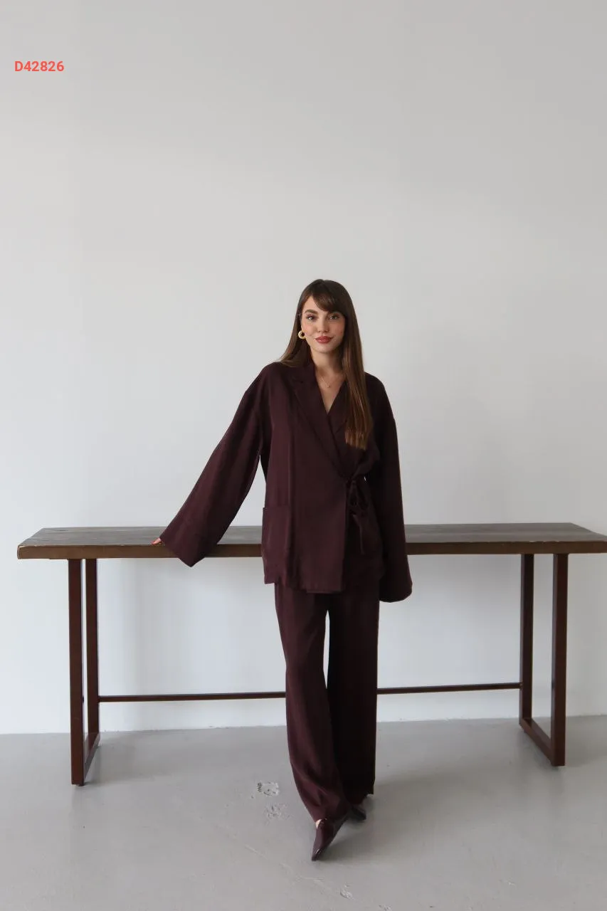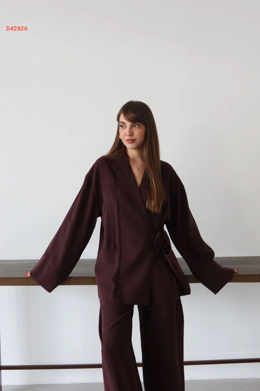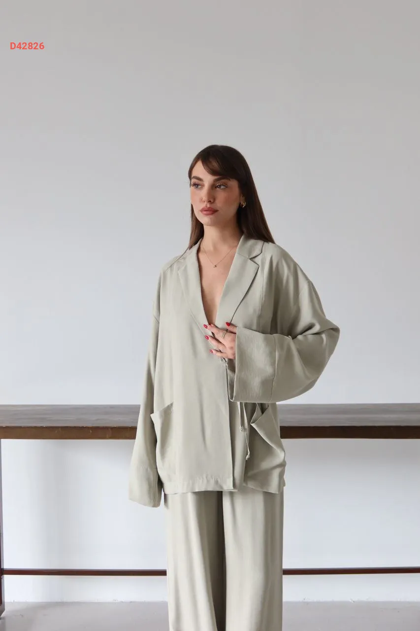 طقم بنطال سادة موديل عريض، وجيب عريضة مع ربطة خصر جانبية
