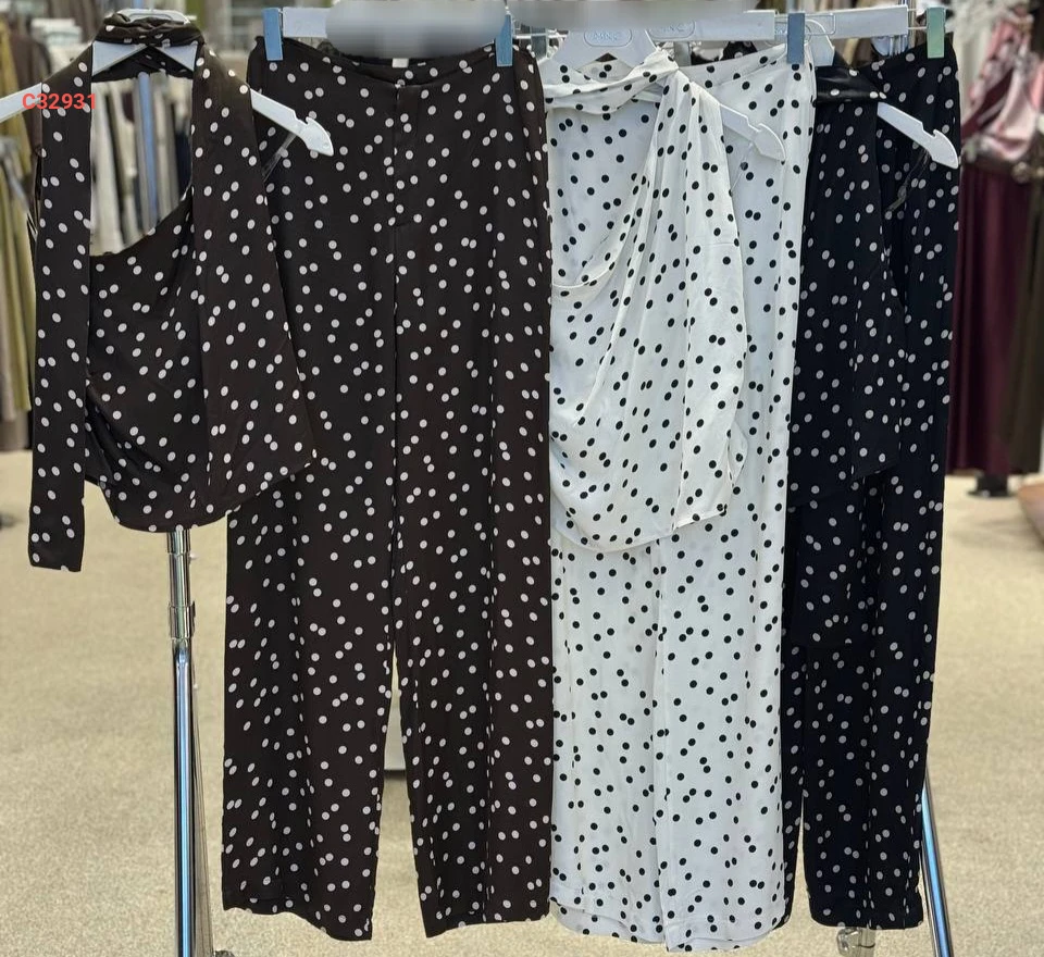 طقم بنطال منقط وبلوزة بربطة