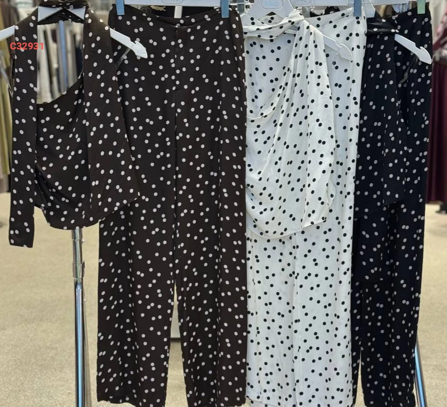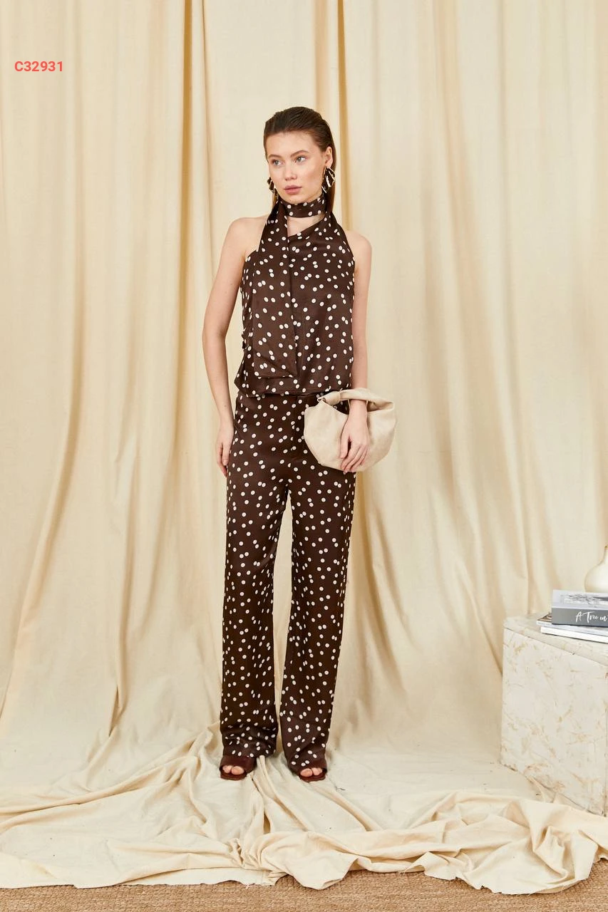 طقم بنطال منقط مع بلوزة بفولار عالرقبة