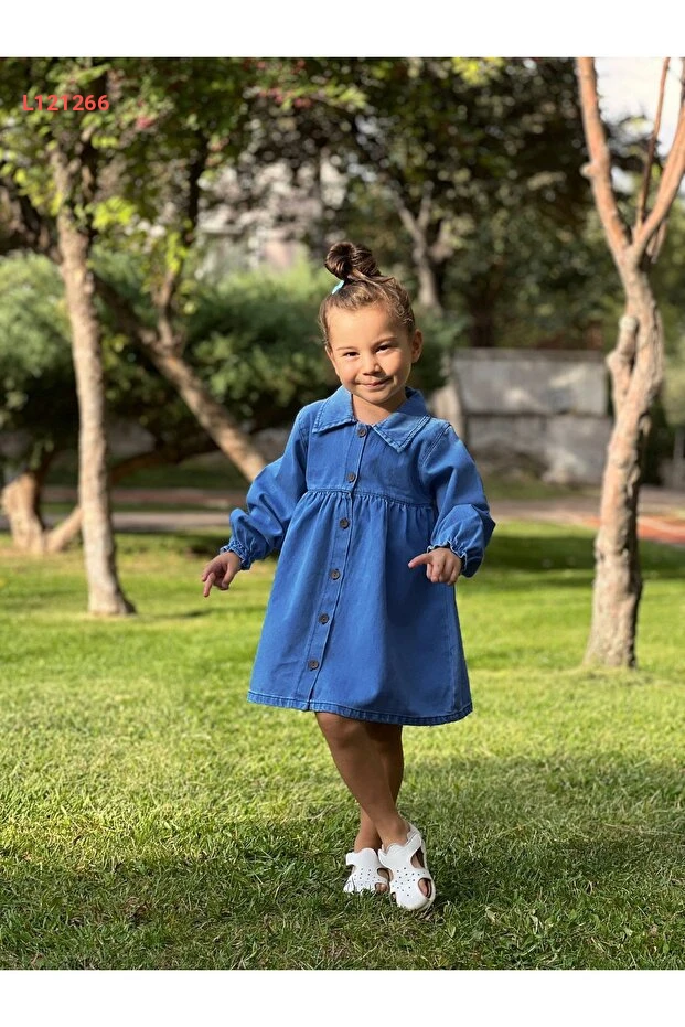 فستان جينز مزين بياقة لأنثى الأطفال مع أزرار وأقمشة مريحة