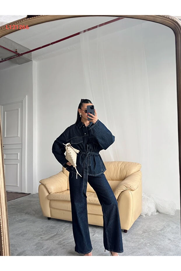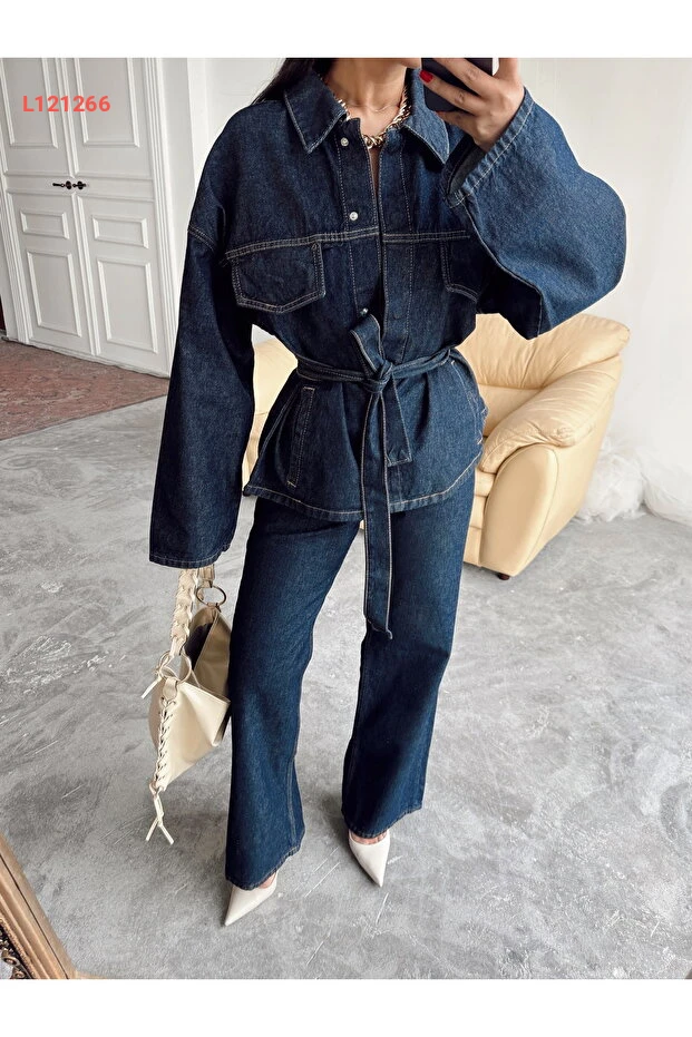 مجموعة دينيم بتصميم واسع سترة وسروال عالي الخصر باللون الأزرق الداكن
