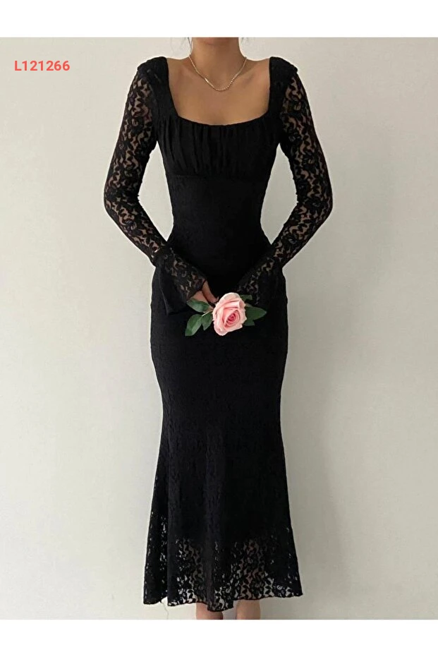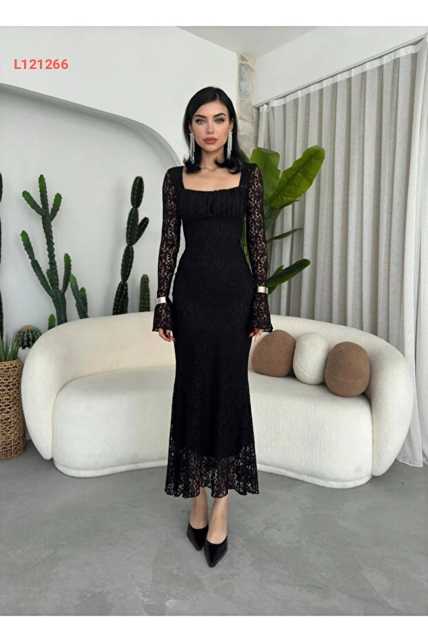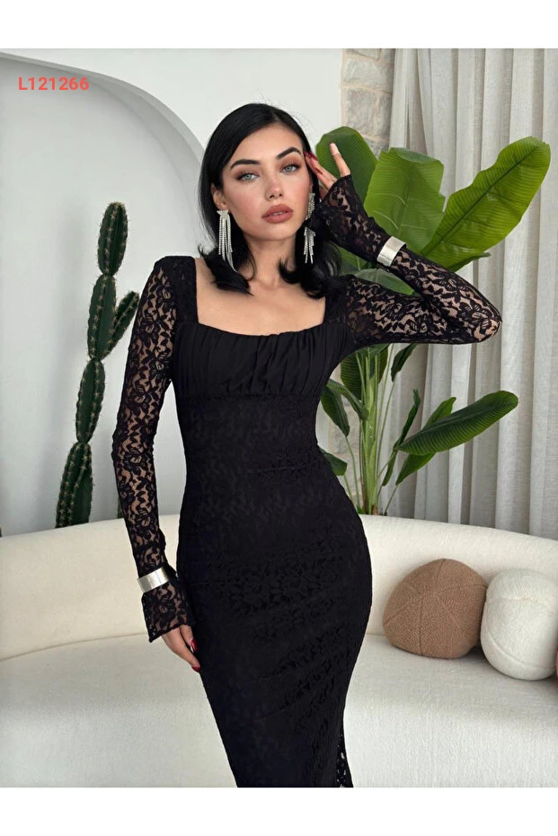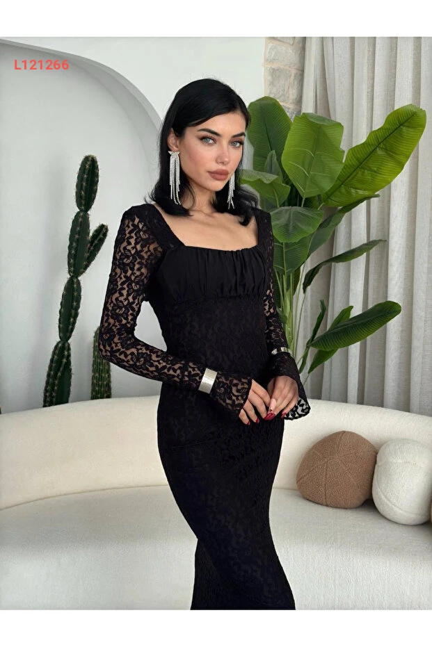 فستان ميدي أسود مزخرف دانتيل بتصميم مربع من أفيش بوتيك