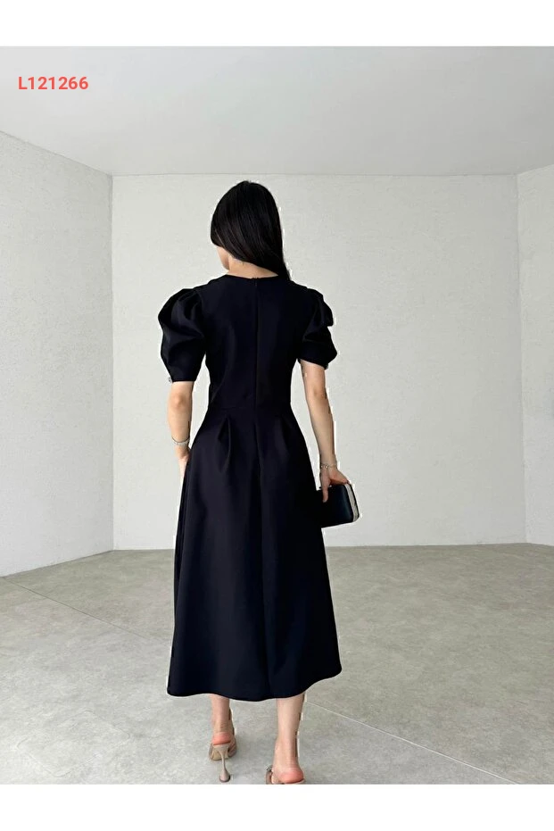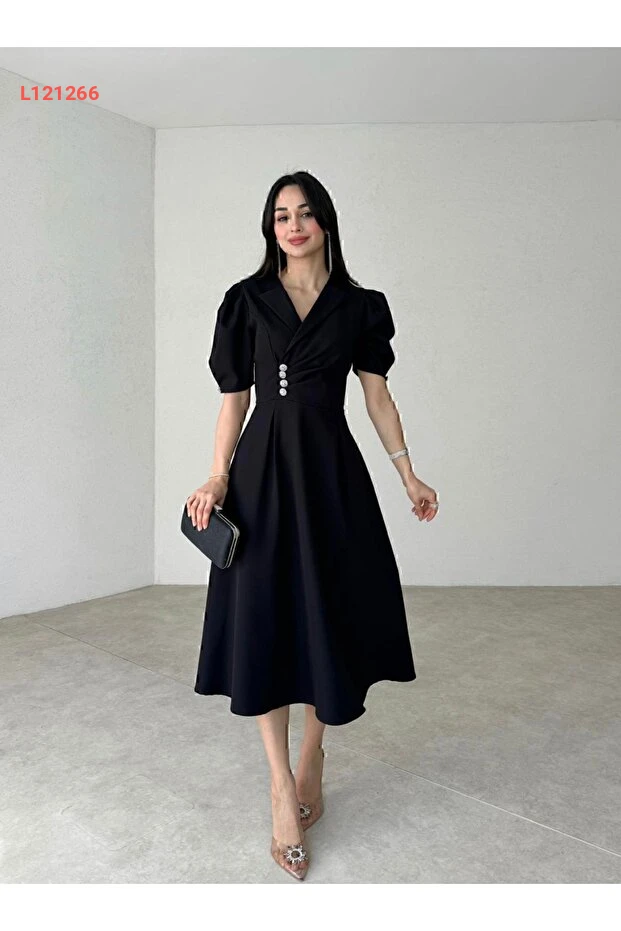 أضف لمسة من الأناقة إلى خزانة ملابسك مع فستان Afiş Butik الأسود بتصميمه الكلاسيكي ذو الياقة الملتفة وتفاصيل الحجر اللامعة. يتميز بقصّة درابية متجددة تناسب مختلف المناسبات، مما يجعلكِ تتألقين بأناقة لا مثيل لها. اختاري هذا الفستان لتبدي رائعة في كل اطلالة!