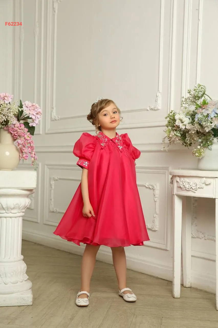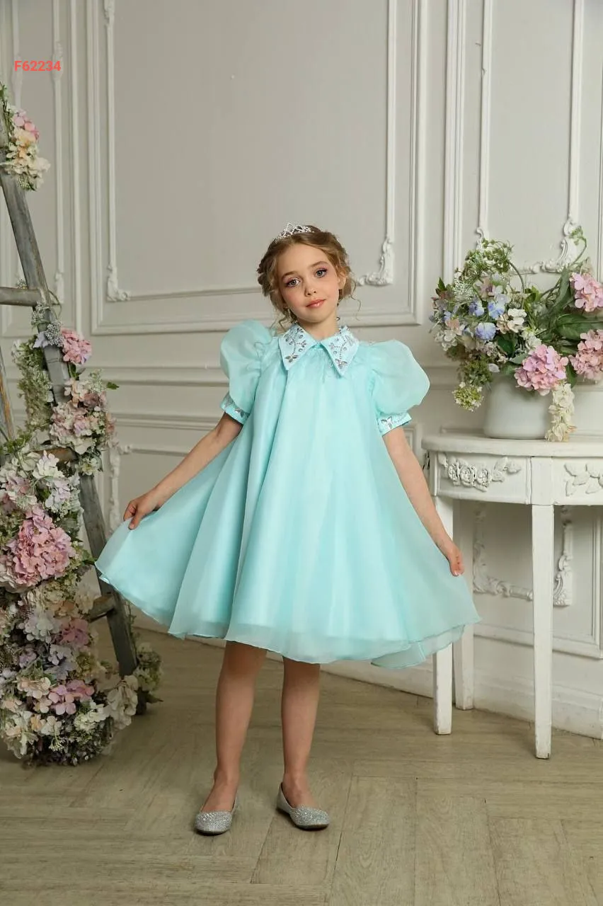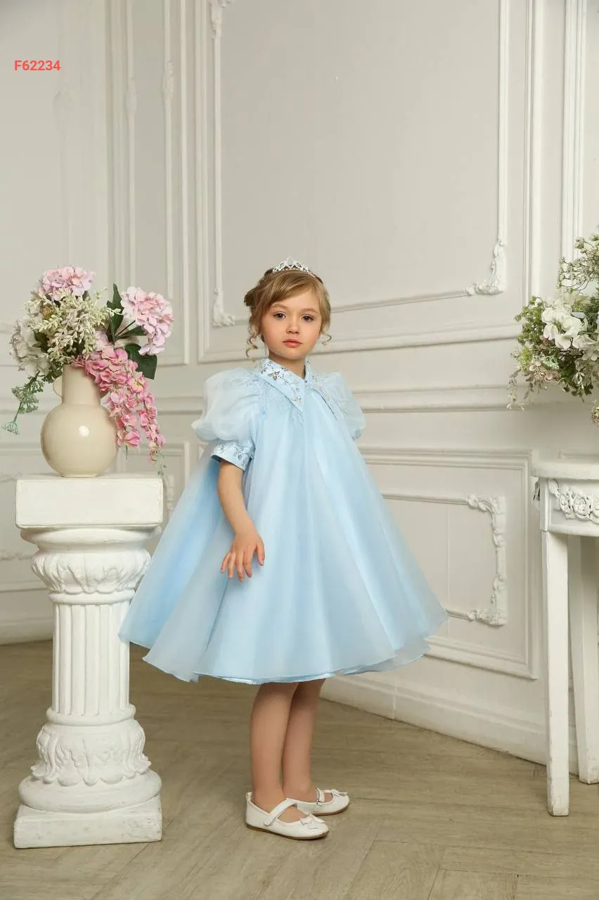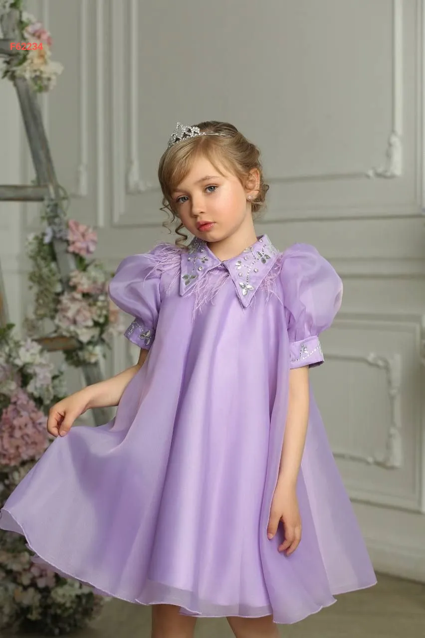 فستان بناتي منفوش بأحجار وريش عالياقة