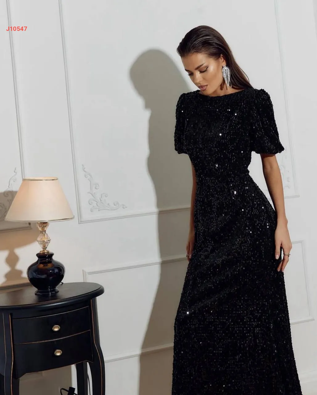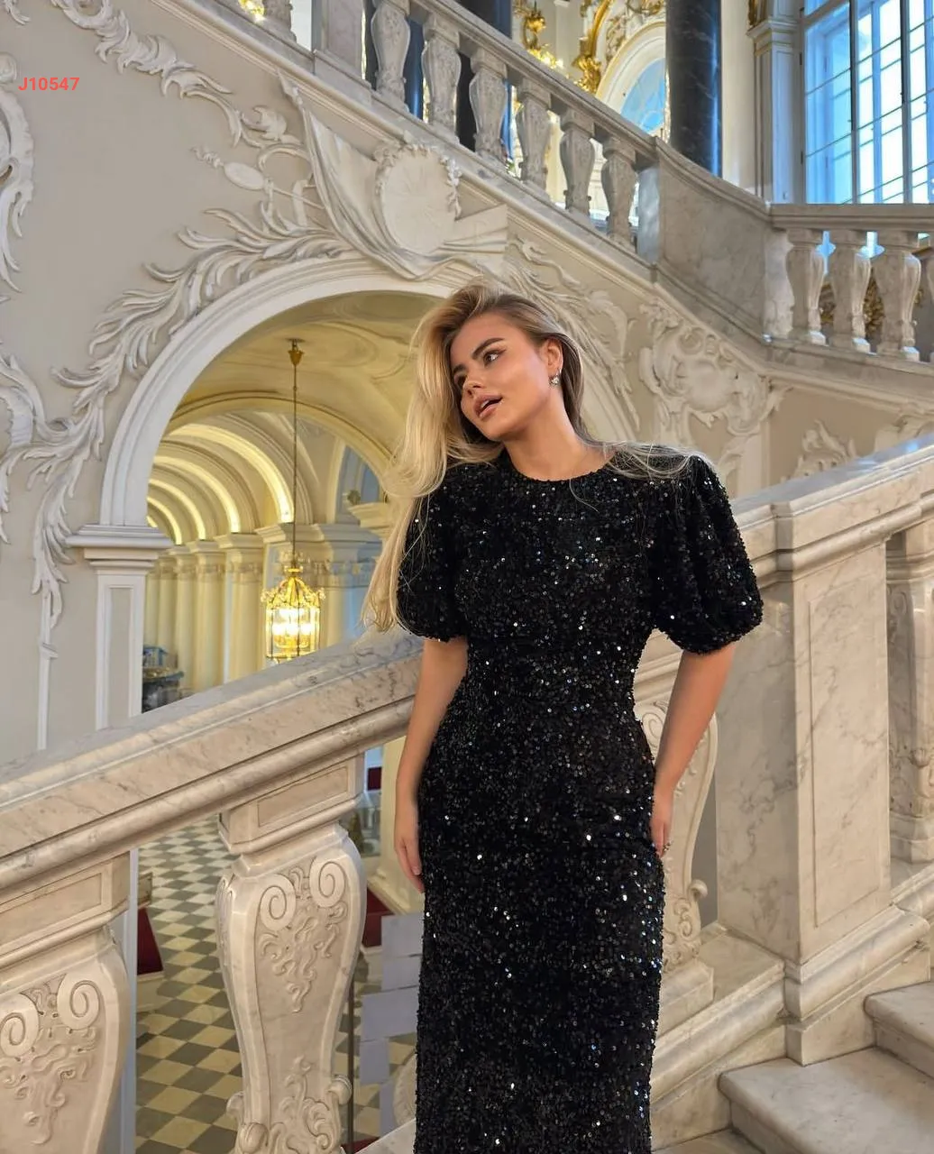 فستان مخمل باييت بأكمام نفخ قصيرة